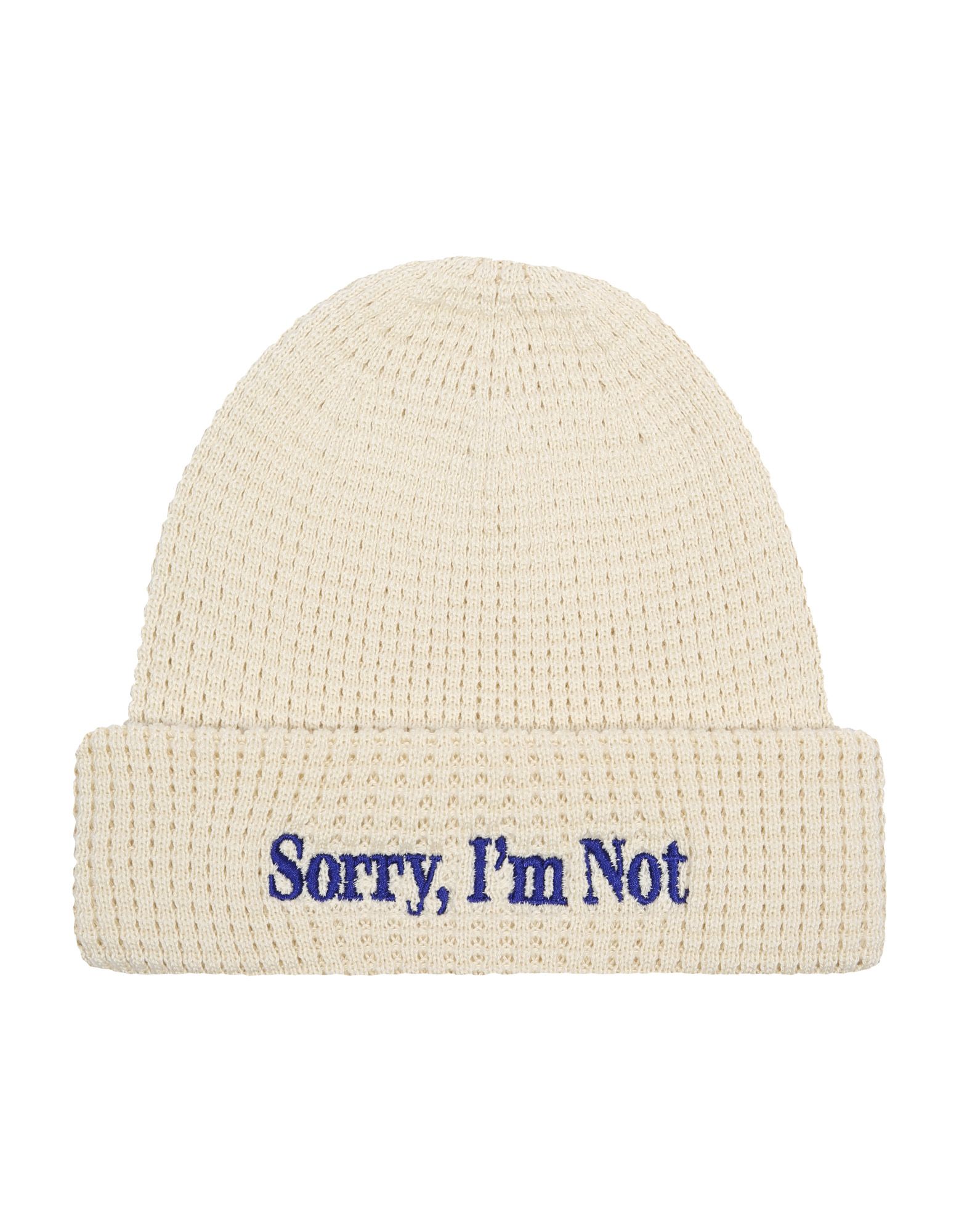 Молочная шапка из вафельной ткани, с лицевой стороны синий логотип бренда, подходит как парням, так и девушкам.