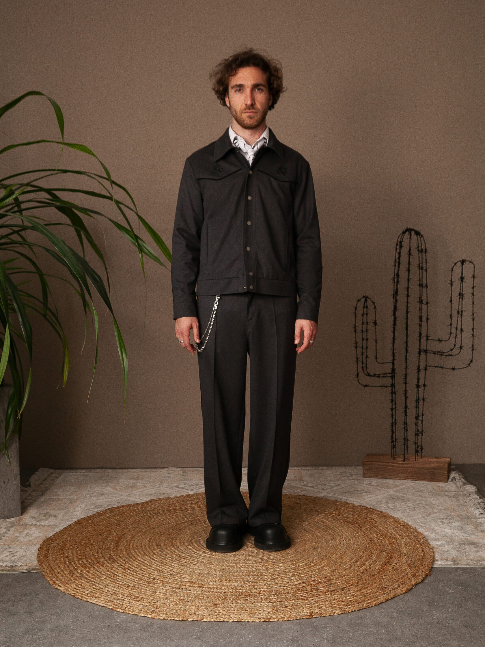 Аутфит сочетает в себе элегантность кроя и бунтарскую эстетику бренда.
