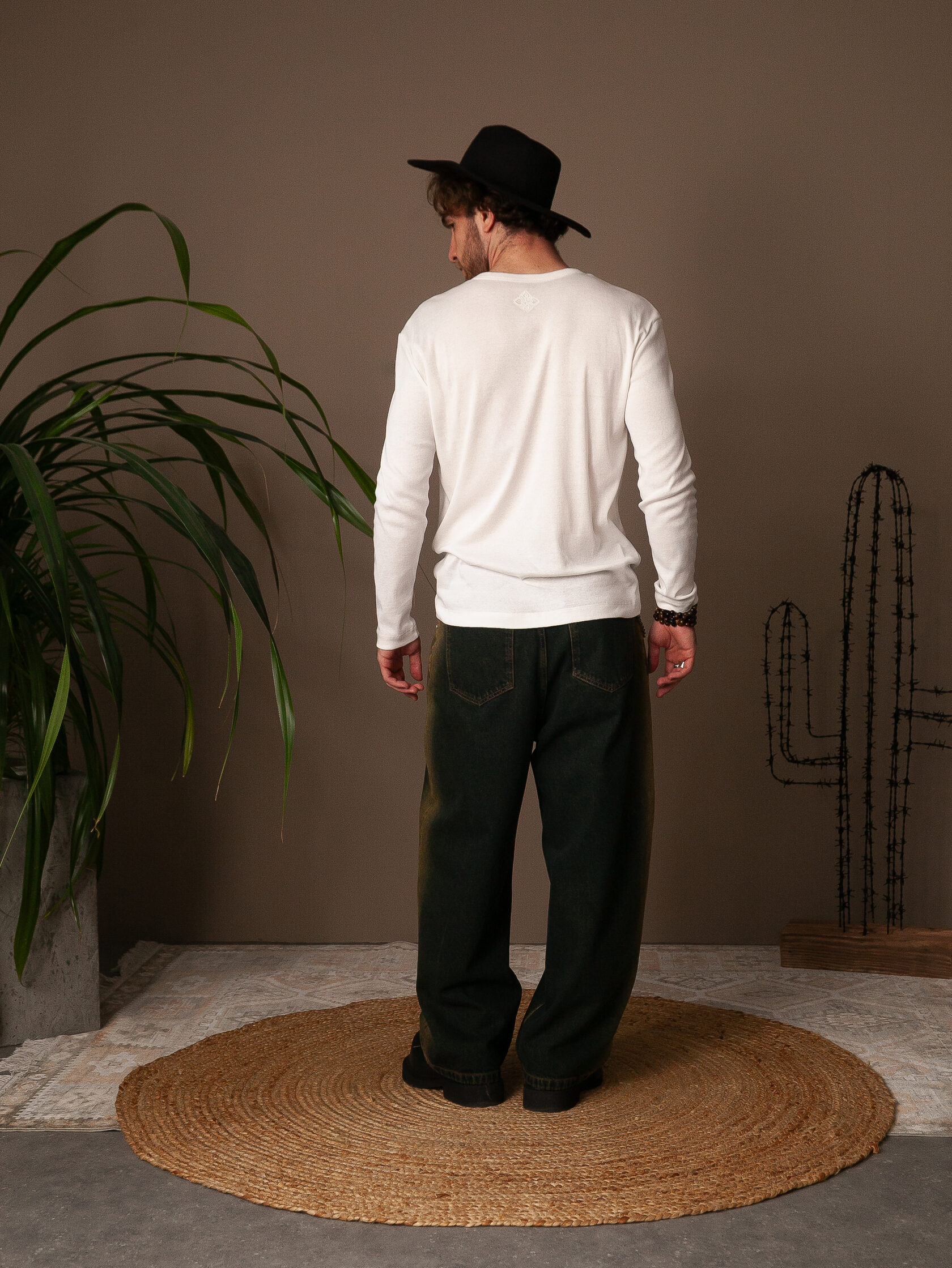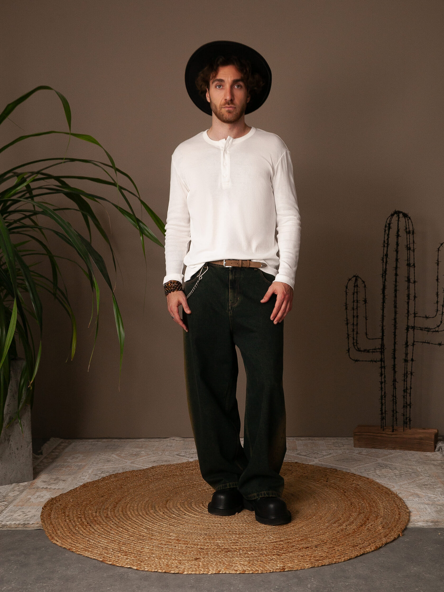 Напоминает винтажные рабочие штаны ковбоев или железнодорожников, но переосмысленный в духе уличной моды. I широкий крой, длина с напуском на обувь или с подворотом.