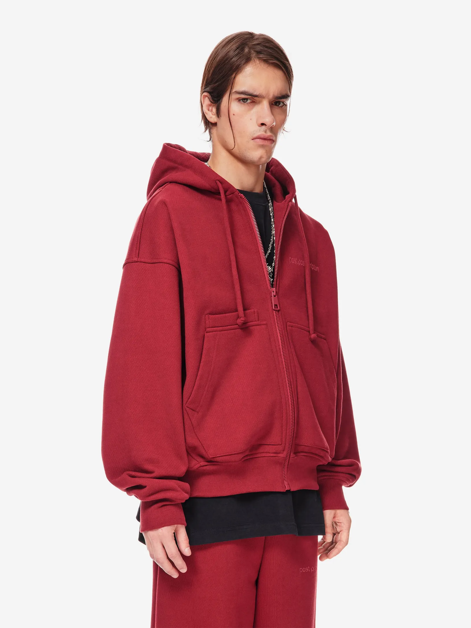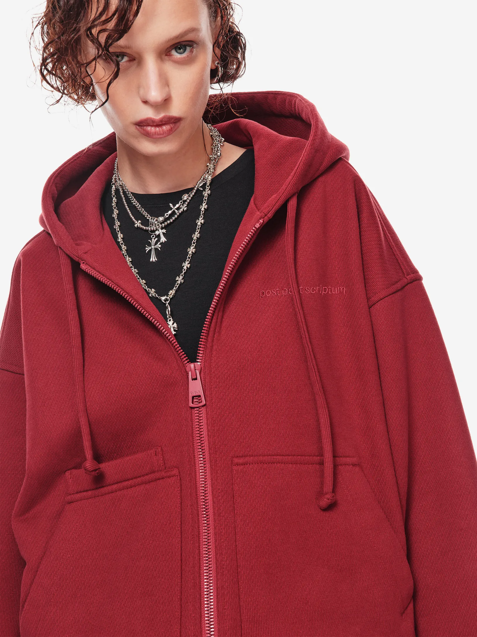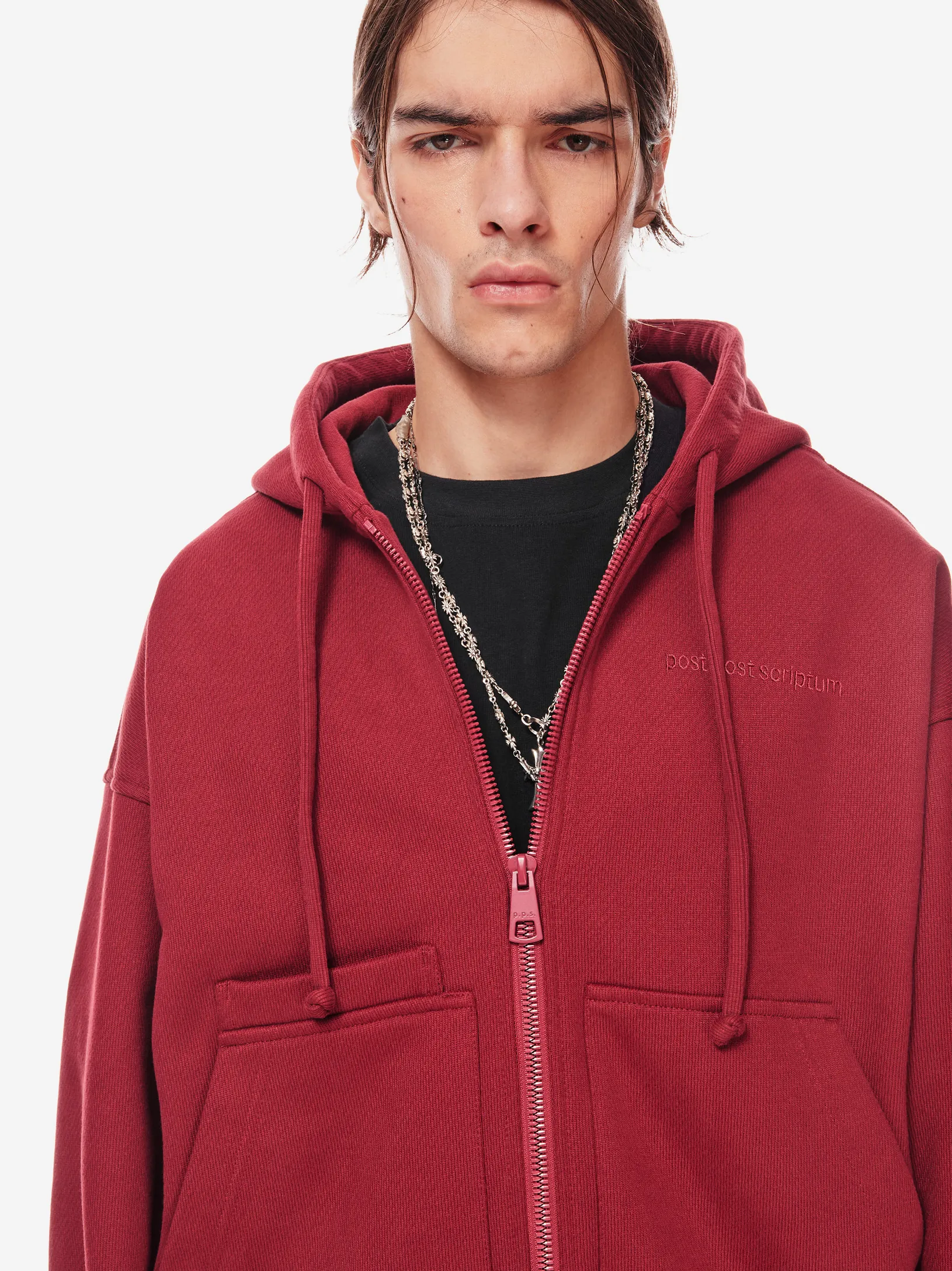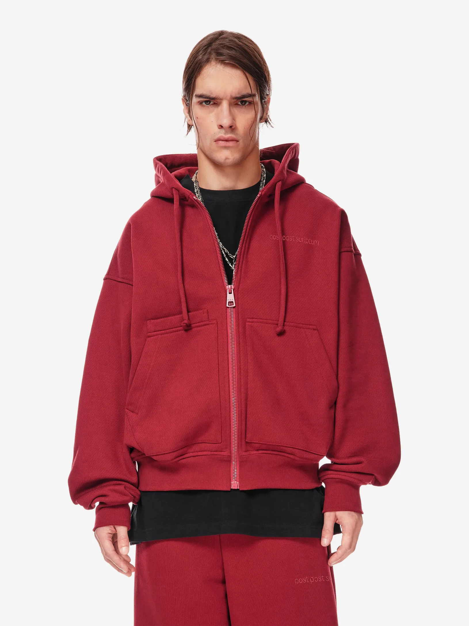 Худи на молнии из плотного хлопкового трикотажа 380 г/м². Свободный крой с пониженной линией плеч. Двусторонняя застёжка-молния, объёмный капюшон со шнурком, эластичные манжеты и низ. Спереди — два кармана и дополнительный скрытый карман с отделением для телефона. Фирменная вышивка в тон post post scriptum на груди, патч-манифест сбоку и вышитые вручную скобки на спинке подчёркивают эстетику бренда. Сочетайте с хлопковыми брюками из новой коллекции или денимом в повседневных образах