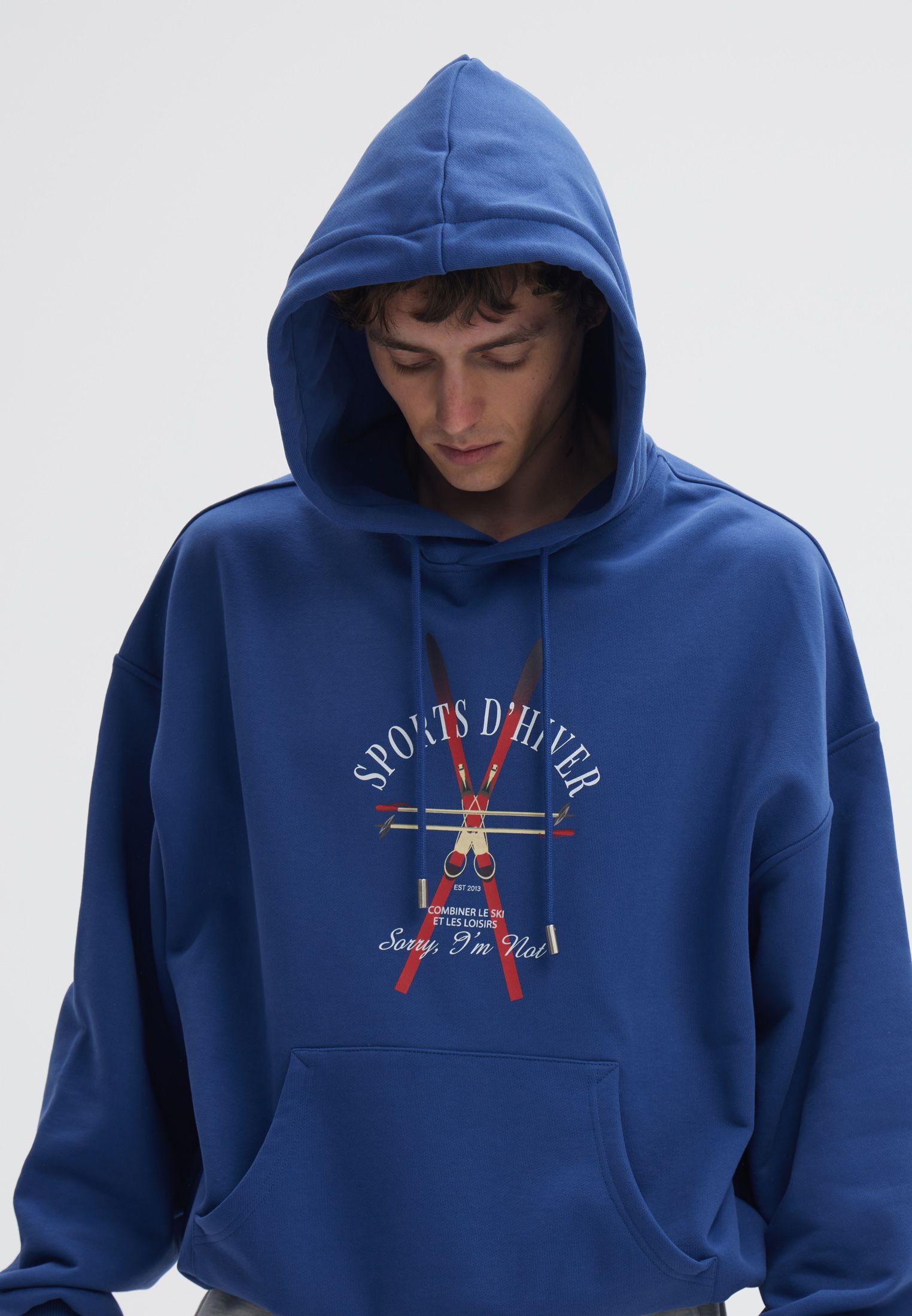 Худи цвета индиго с авторским принтом SPORTS D’HIVER. Изнанка выполнена из петельчатого футера.