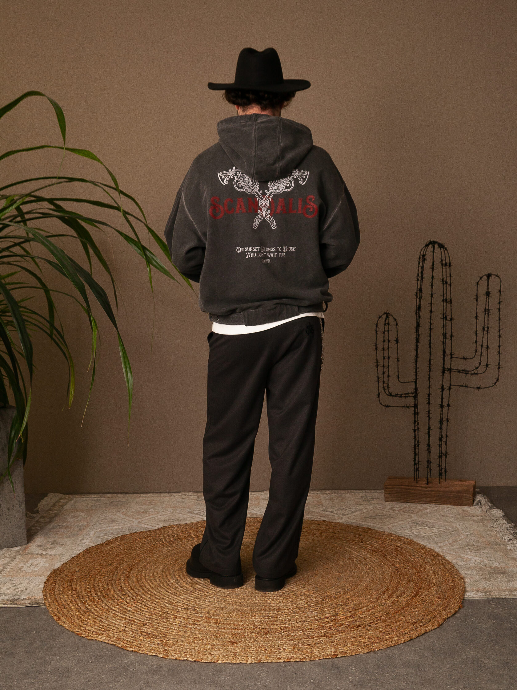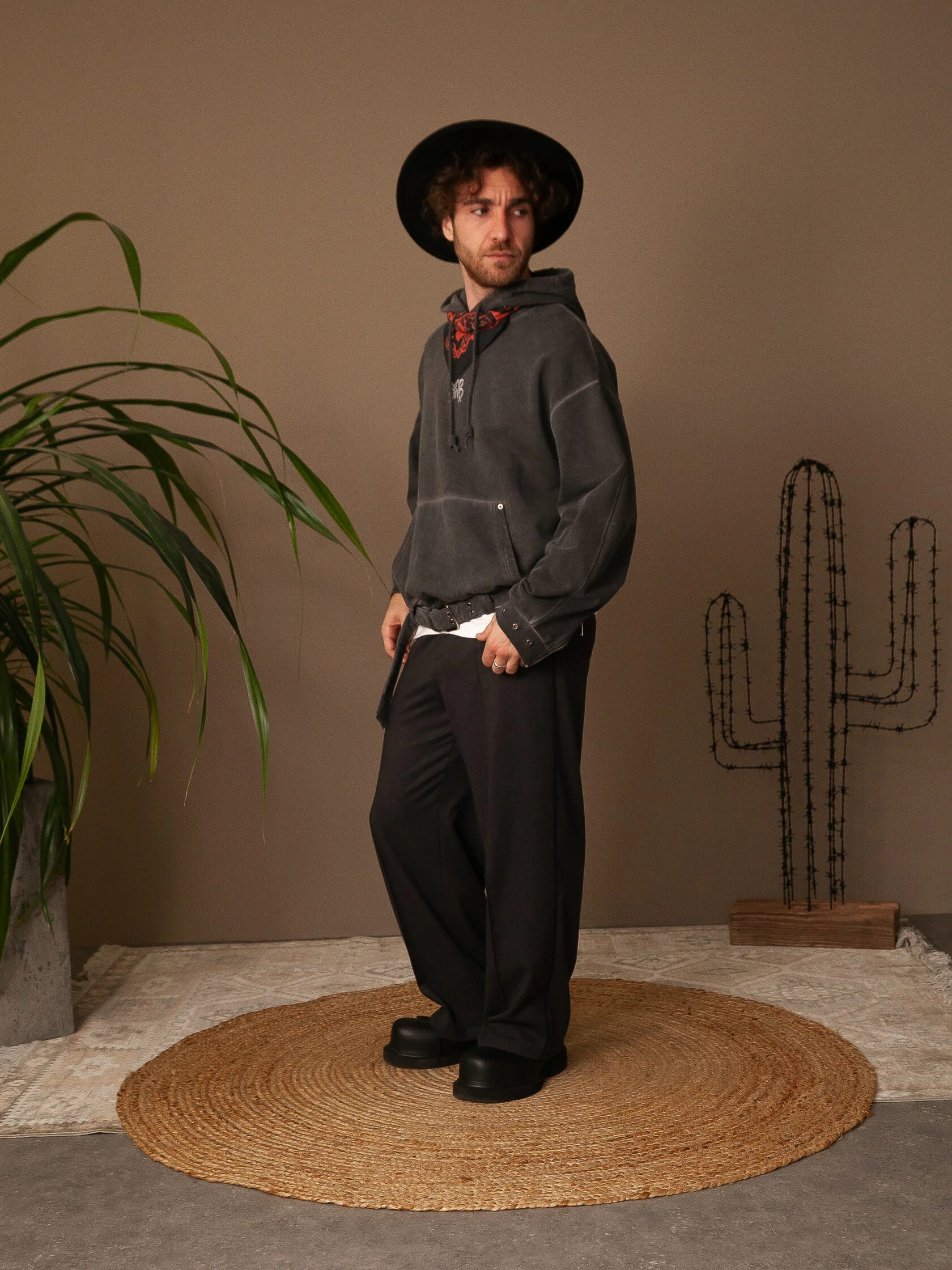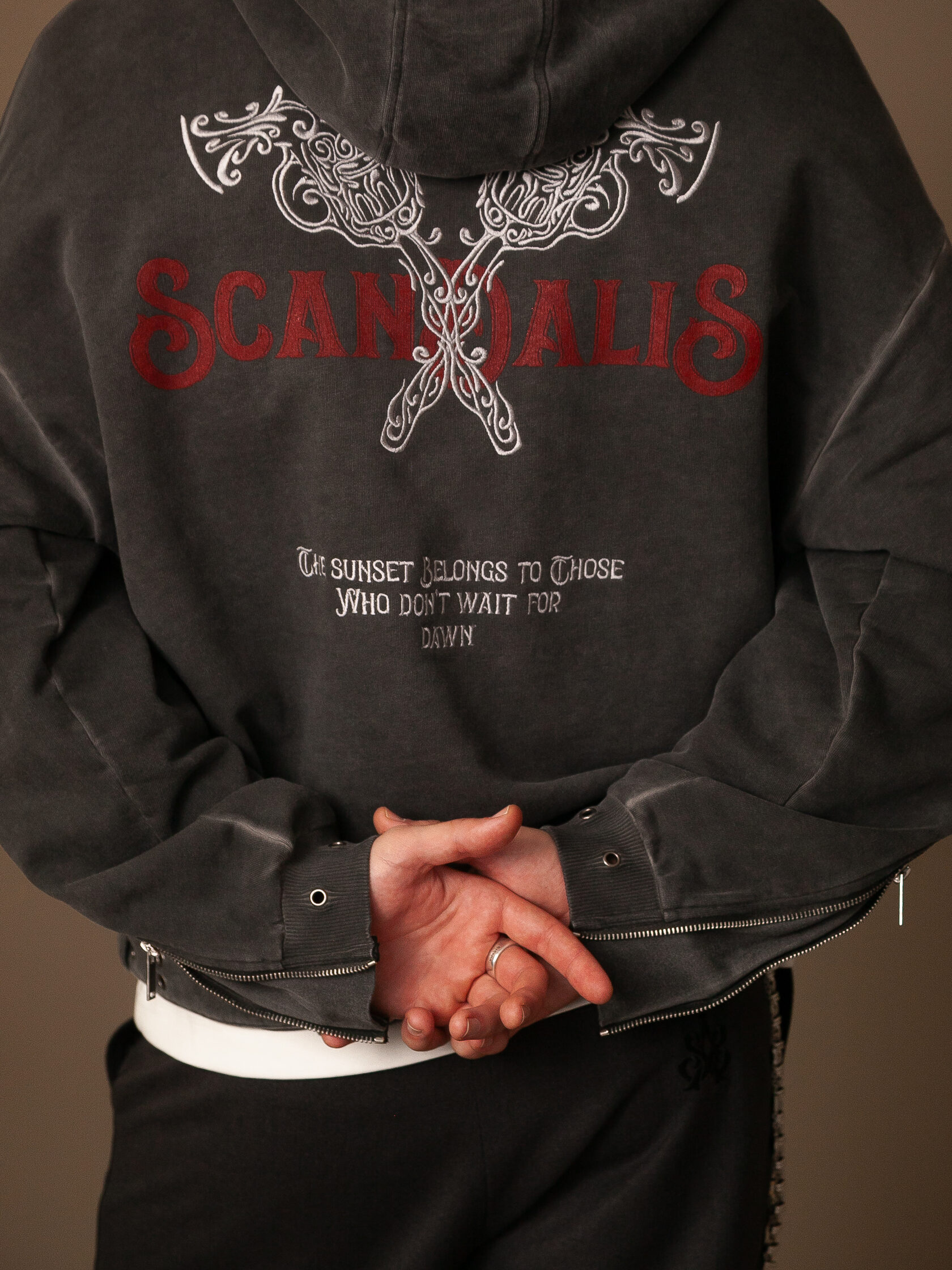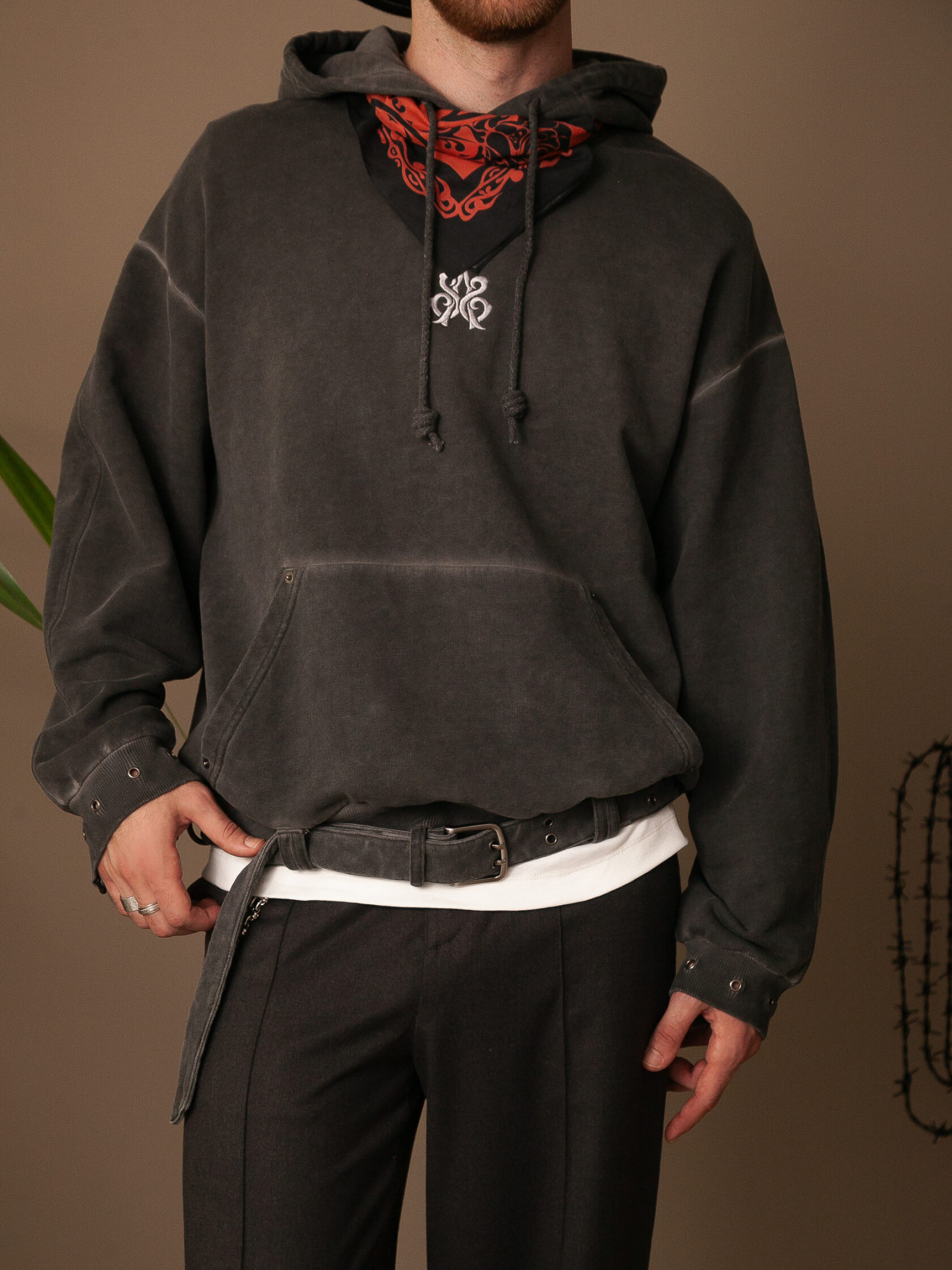 Назначение: стягивает низ худи создавая мешковатый объем вверху и резкое сужение внизу. Формирует силуэт – АМФОРУ. Манжет регулируется в объеме точными молниями (отсыл к кожаной куртки «косухи»). Люверсы на манжете усиливают «GRANGE» эффект.