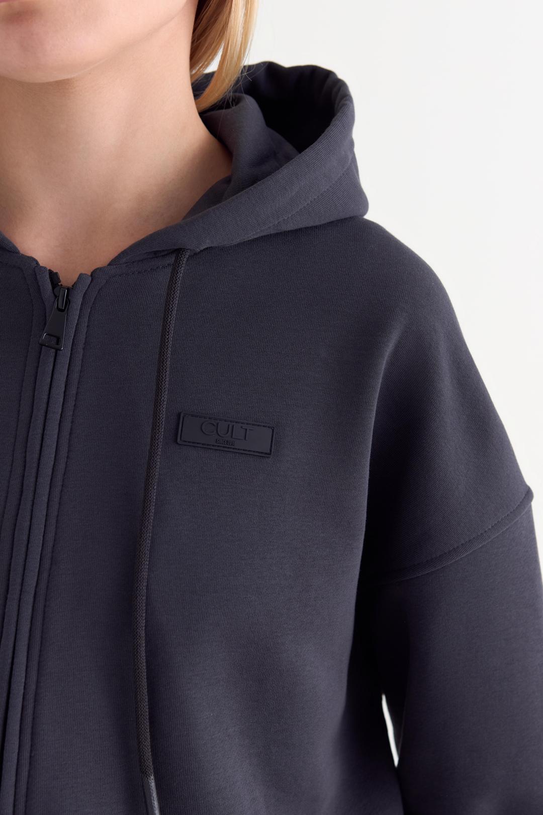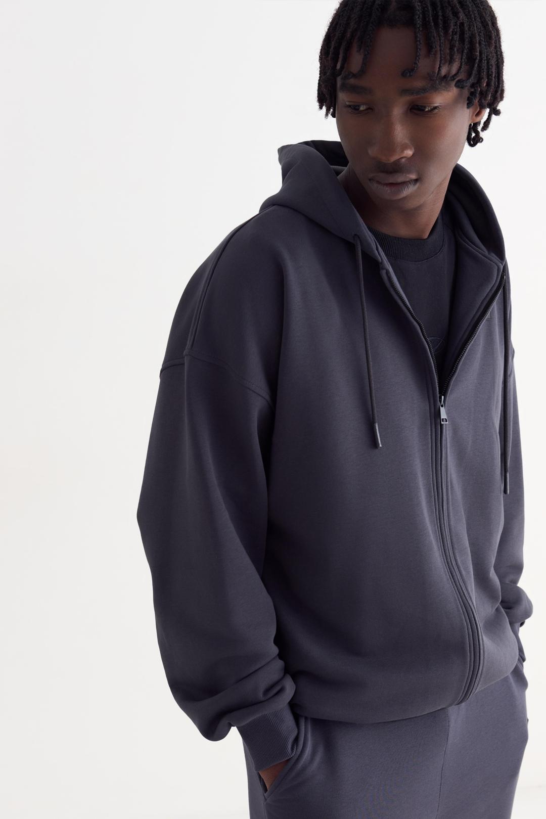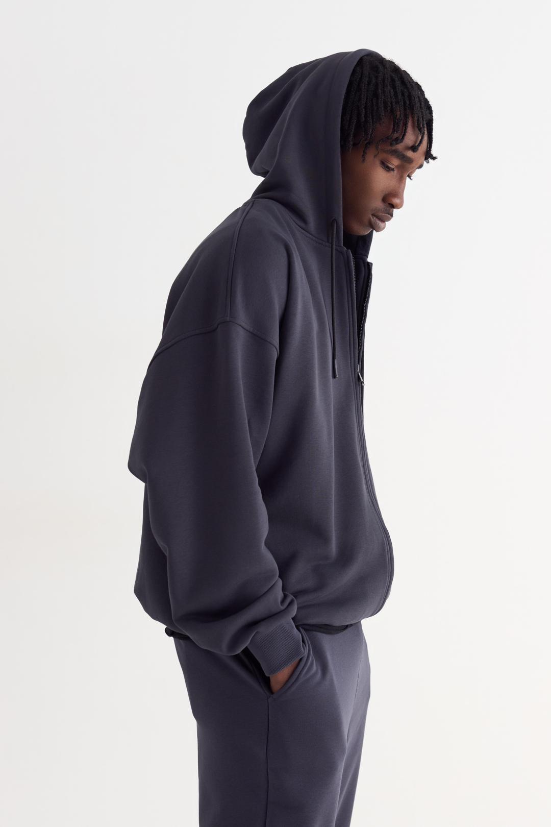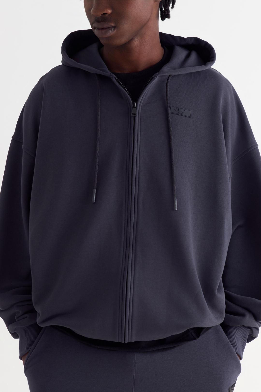 Худи на молнии оверсайз со спущенным плечом из футера трехнитки, с двойным капюшоном со шнурком. Манжеты на рукавах и по низу изделия из кашкорсе. Брендированная нашивка спереди слева.