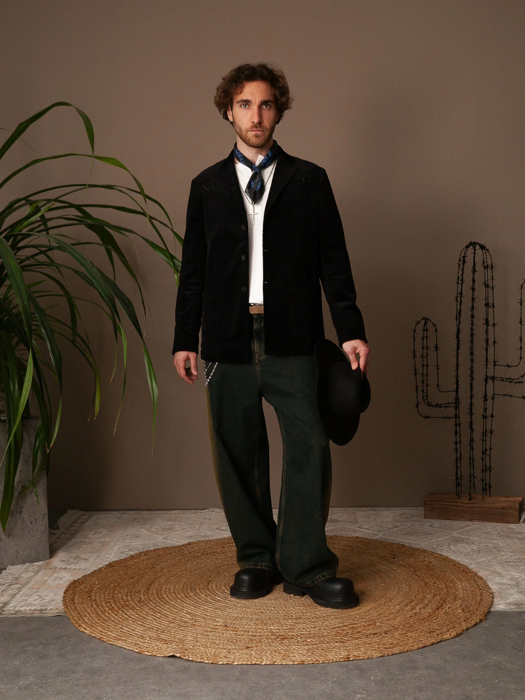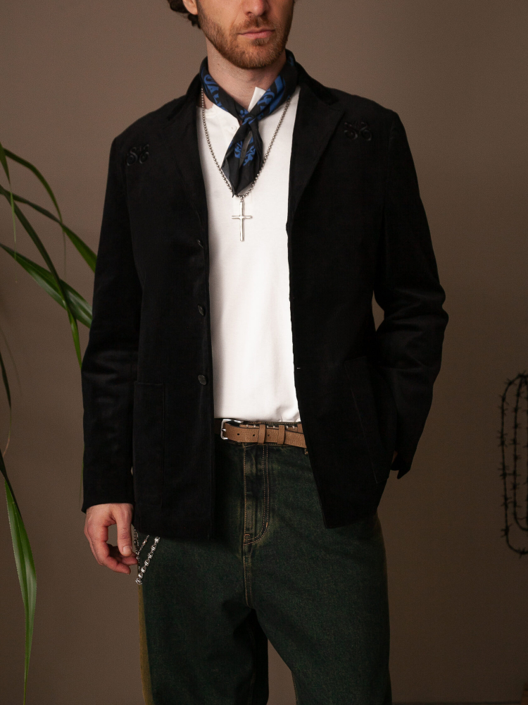АРХИТЕКТУРА МОДЕЛИ Пиджак: Прямой грубый крой, с мягким плечом, короткий лацканом. По переду прямые накладные карманы без скруглений. Конструкция без подклады. Характерная вышивка на левой полке изделия с двух сторон.