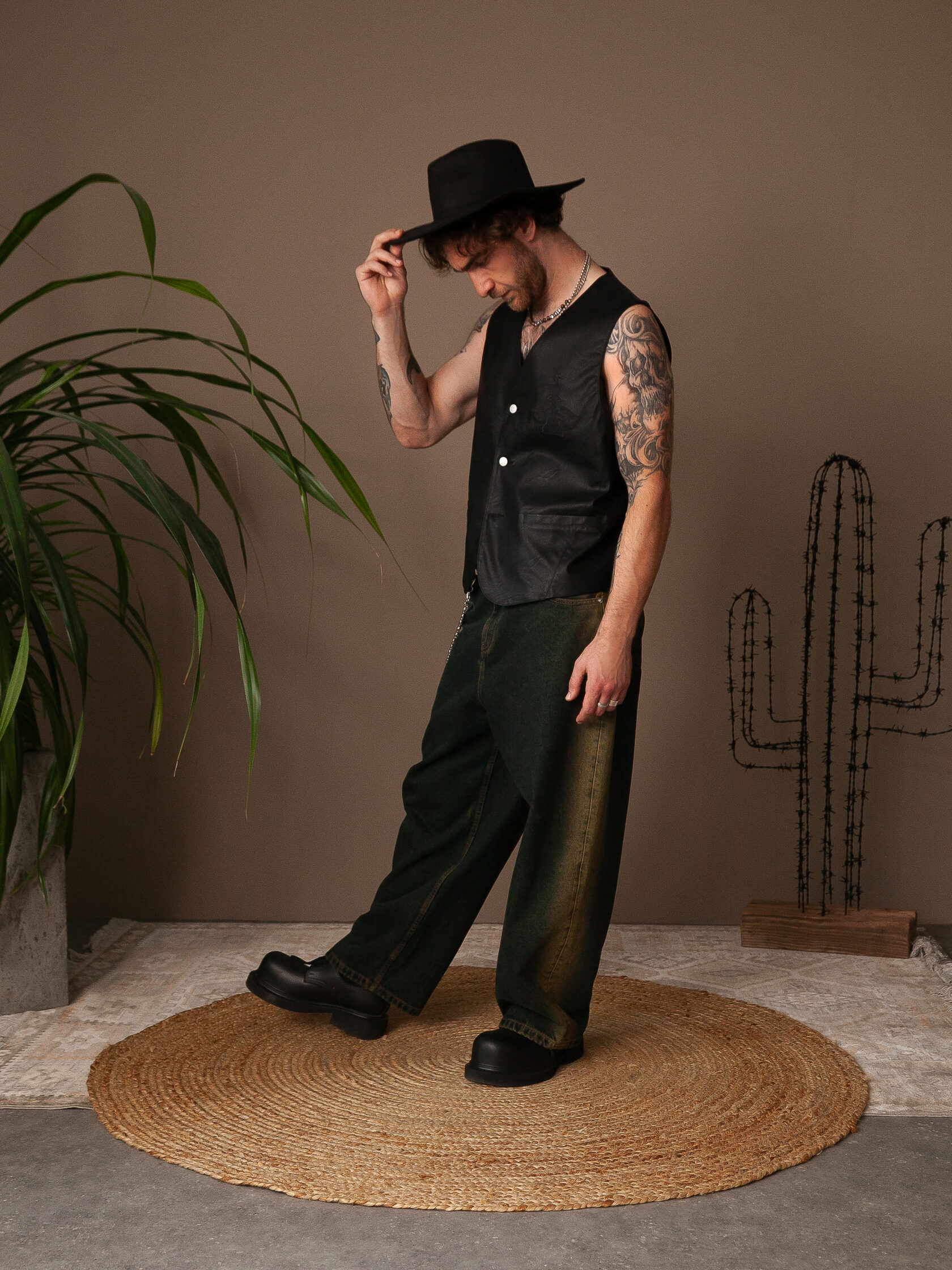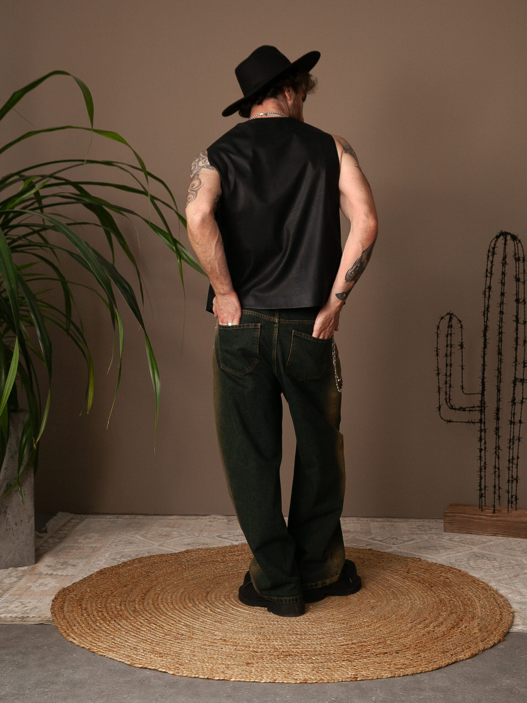 Плотная эко-кожа чёрного цвета с матовой фактурой, имитирующей вулканизированную резину или состаренную кожу. Материал держит форму, но сохраняет пластичность. Застёжка: джинсовые болты, что придает больше брутальности изделию.