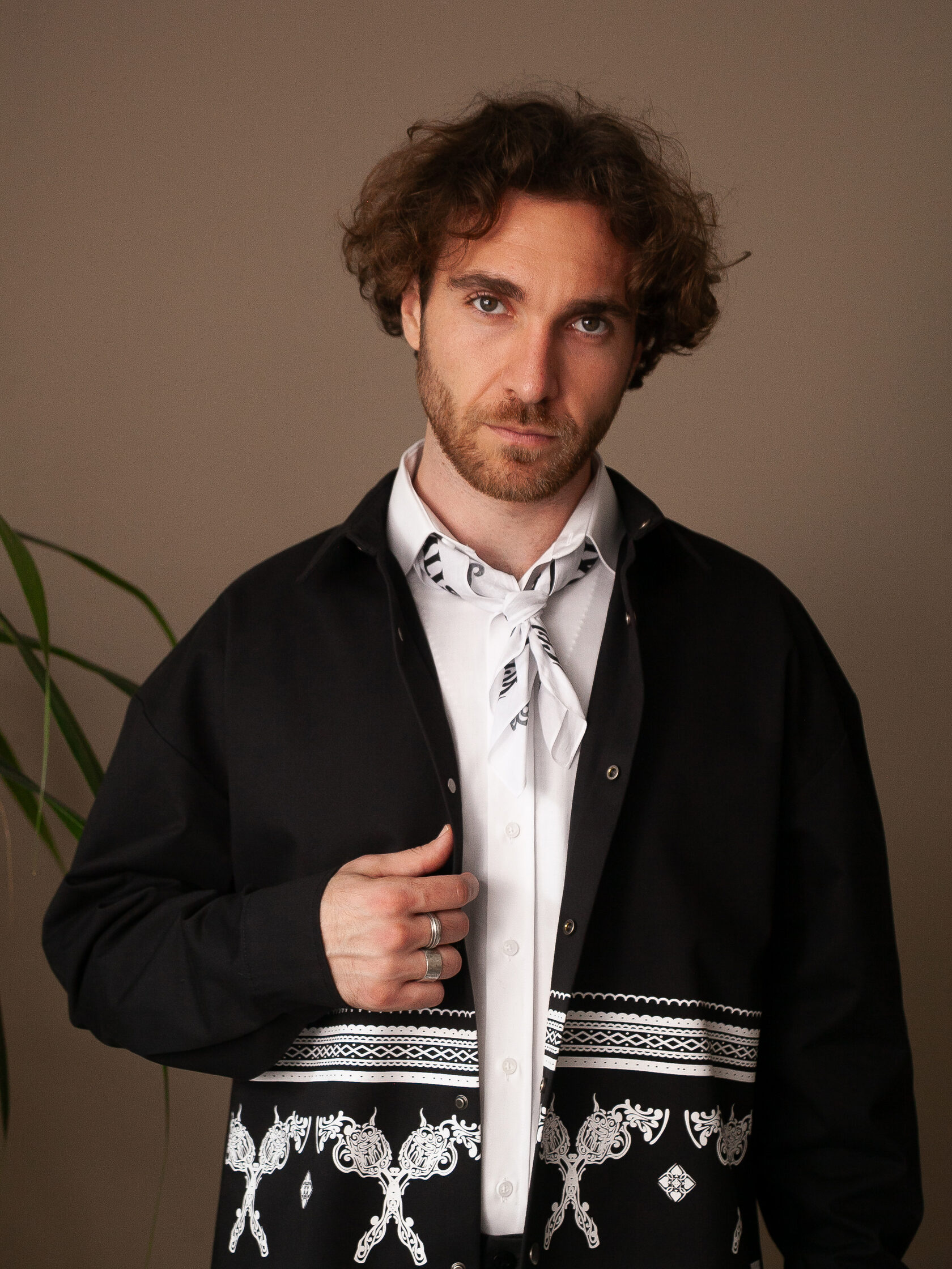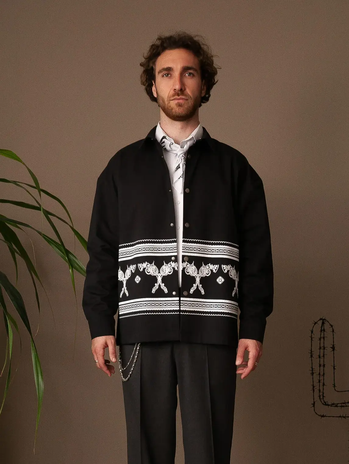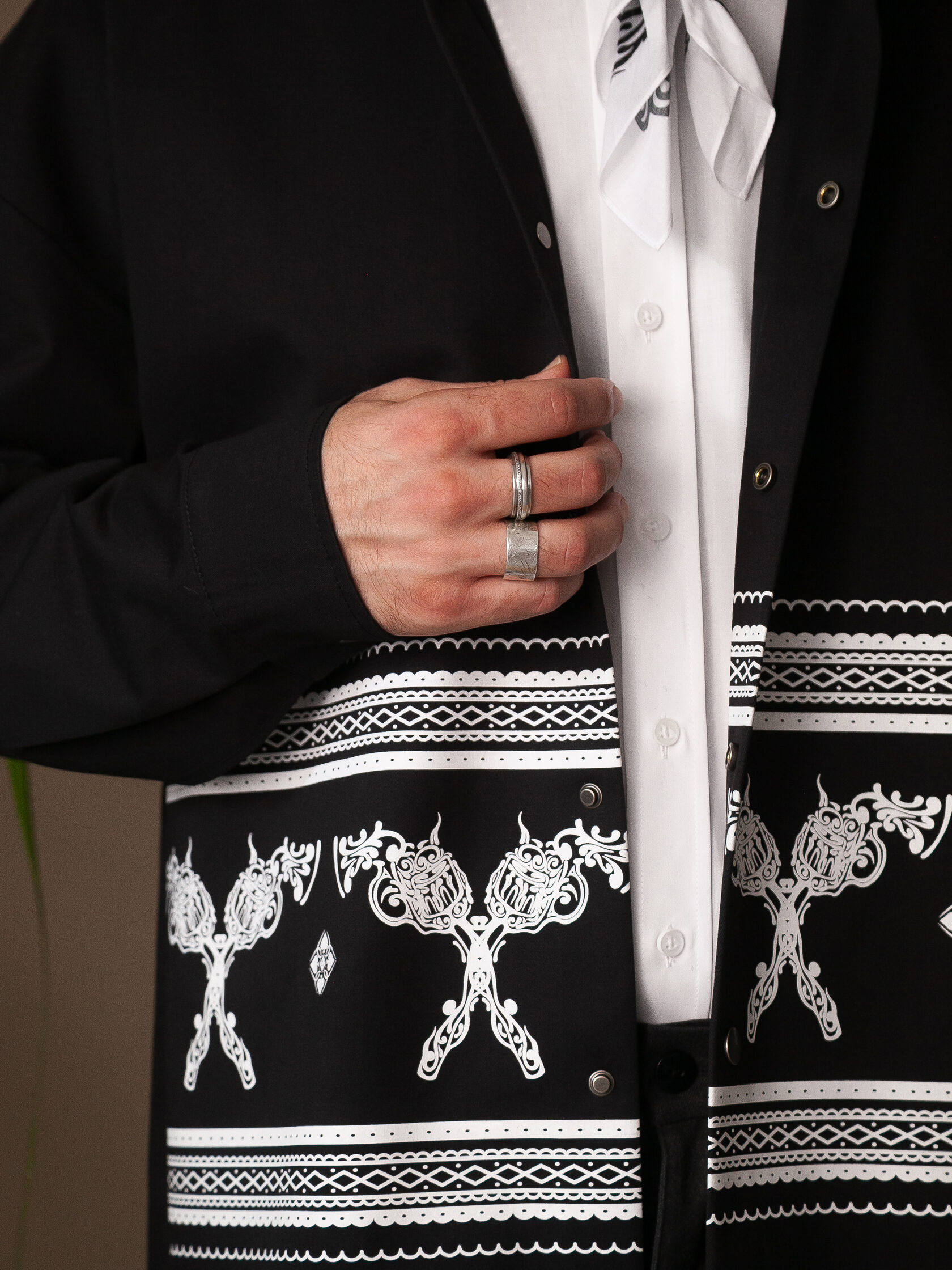 По низу рубашки с двух сторон расположен орнамент «скрещенных револьверов» Дизайн представляет собой объемную графическую композицию напоминающую гравюру из старый вестернов.