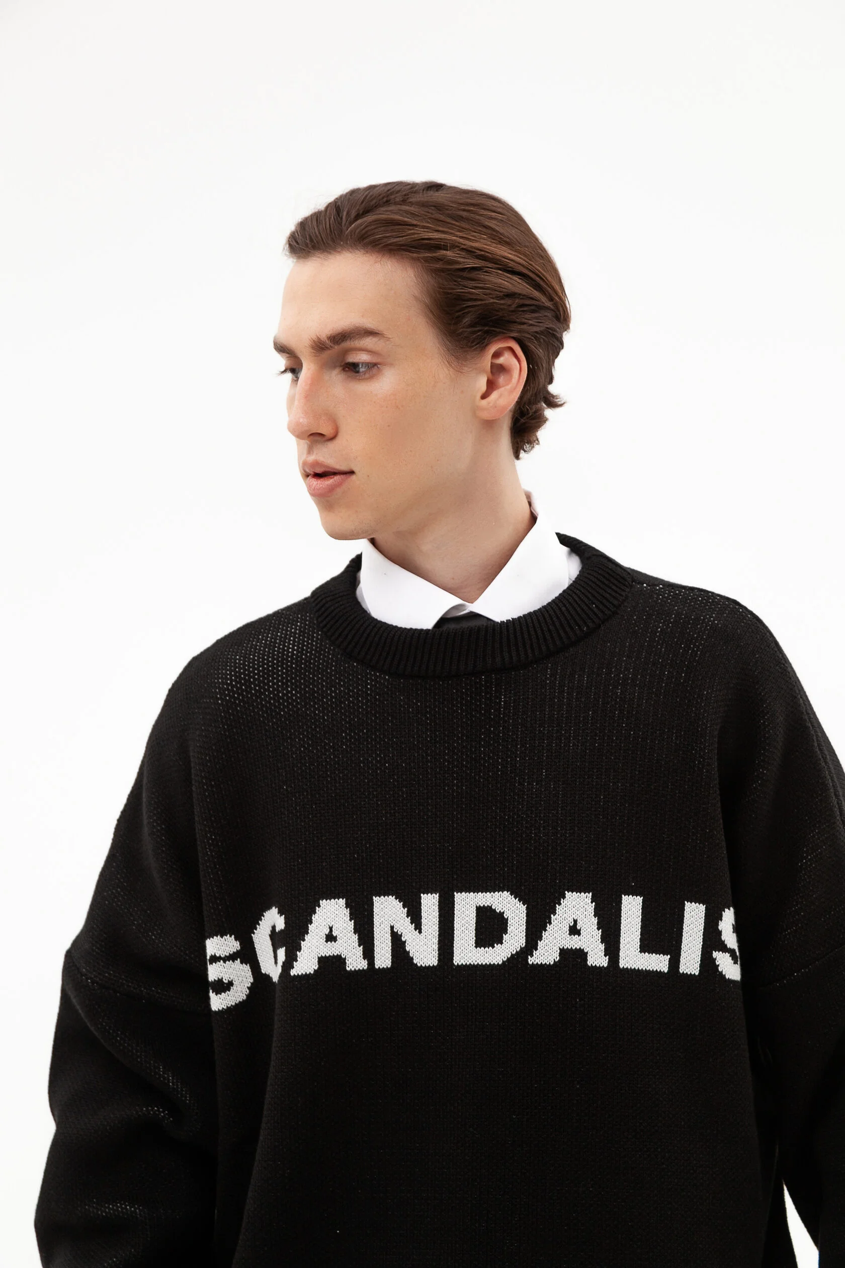 Back to office. Свитер вывязанный с объемным логотипом SCANDALIS. Модель имеет широкое горло и объемный рукав, что позволяет его использовать в многослойных образах.