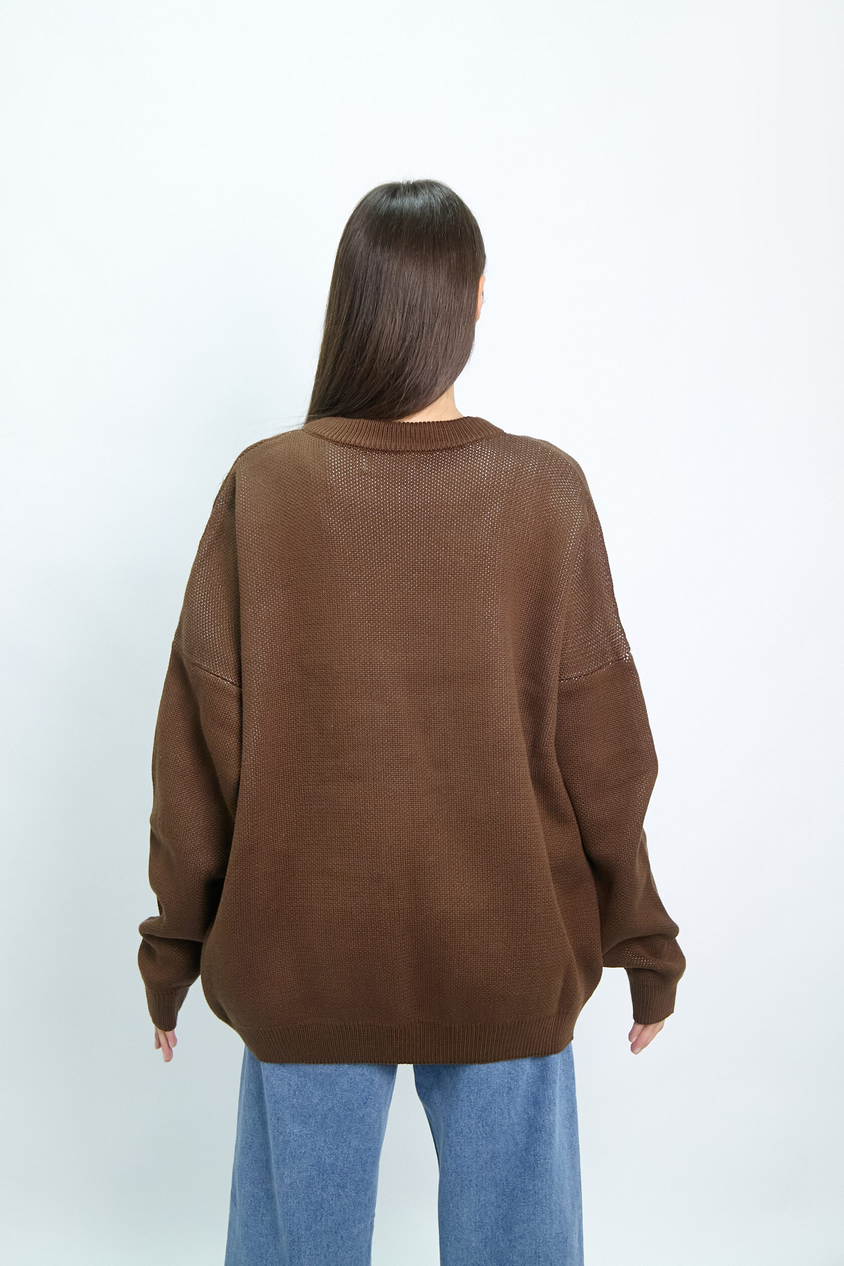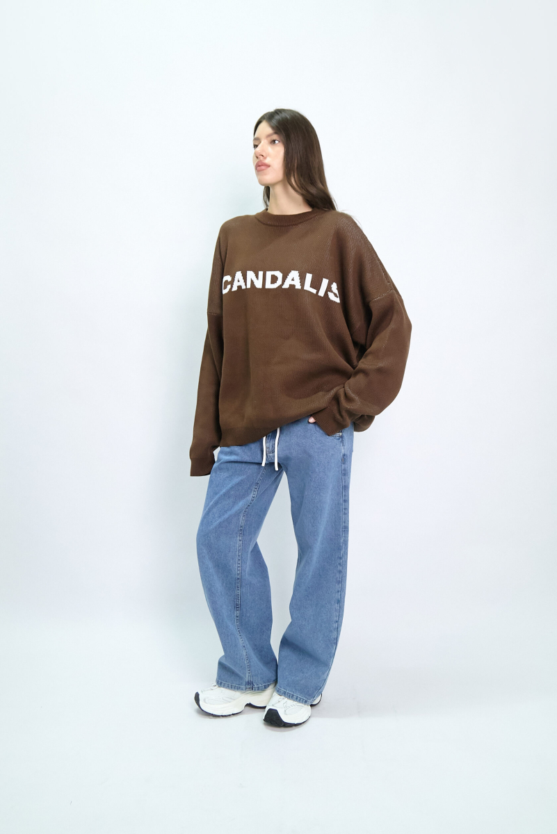 Свитер вывязанный с объемным логотипом SCANDALIS. Модель имеет широкое горло и объемный рукав, что позволяет его использовать в многослойных образах.