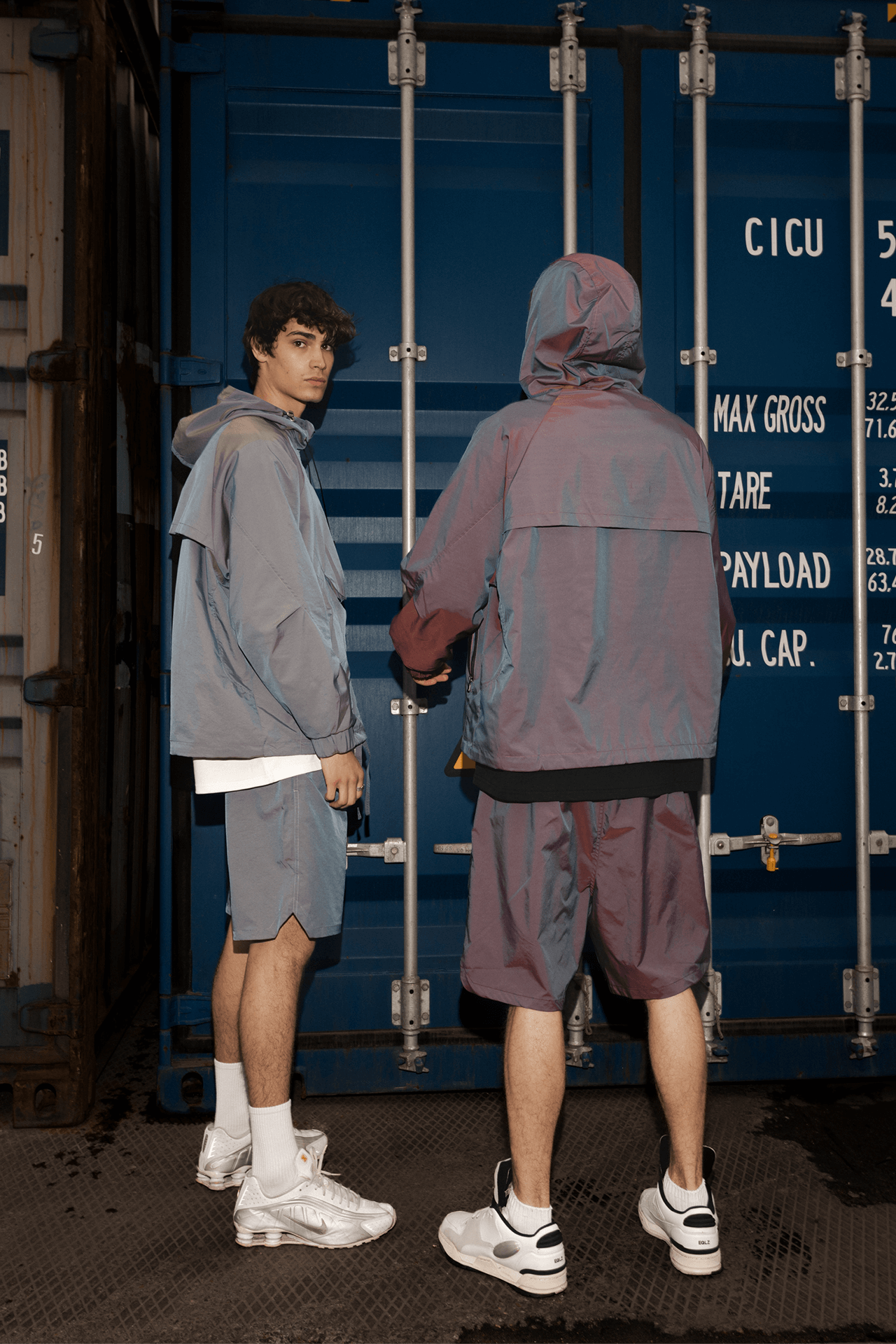 Ветровка-анорак из водонепроницаемого материала хамелеона. Имеет множество функциональных и декоративных элементов, таких как карманы на кнопках и молнии, а также затяжки для более комфортной посадки изделия.