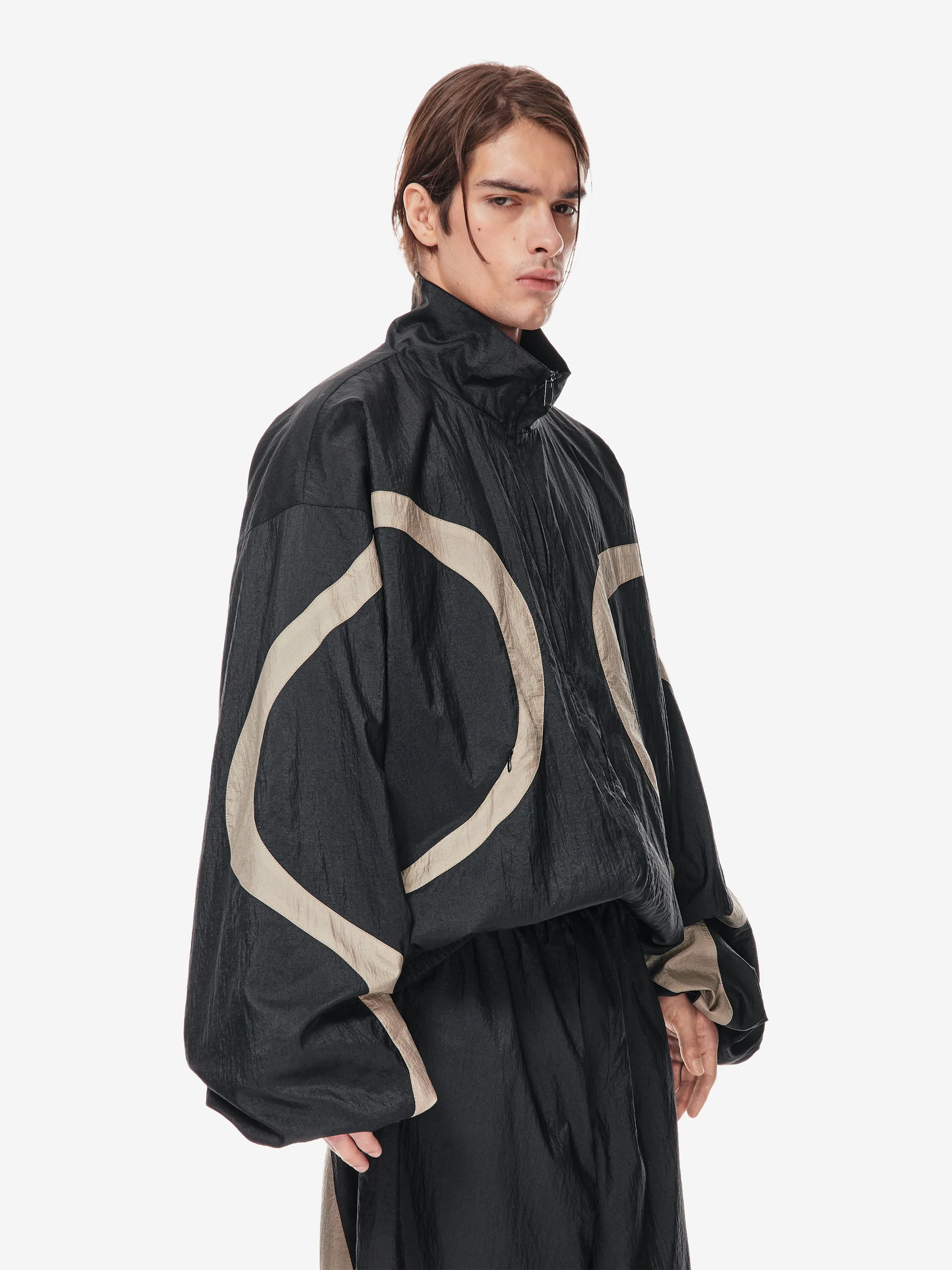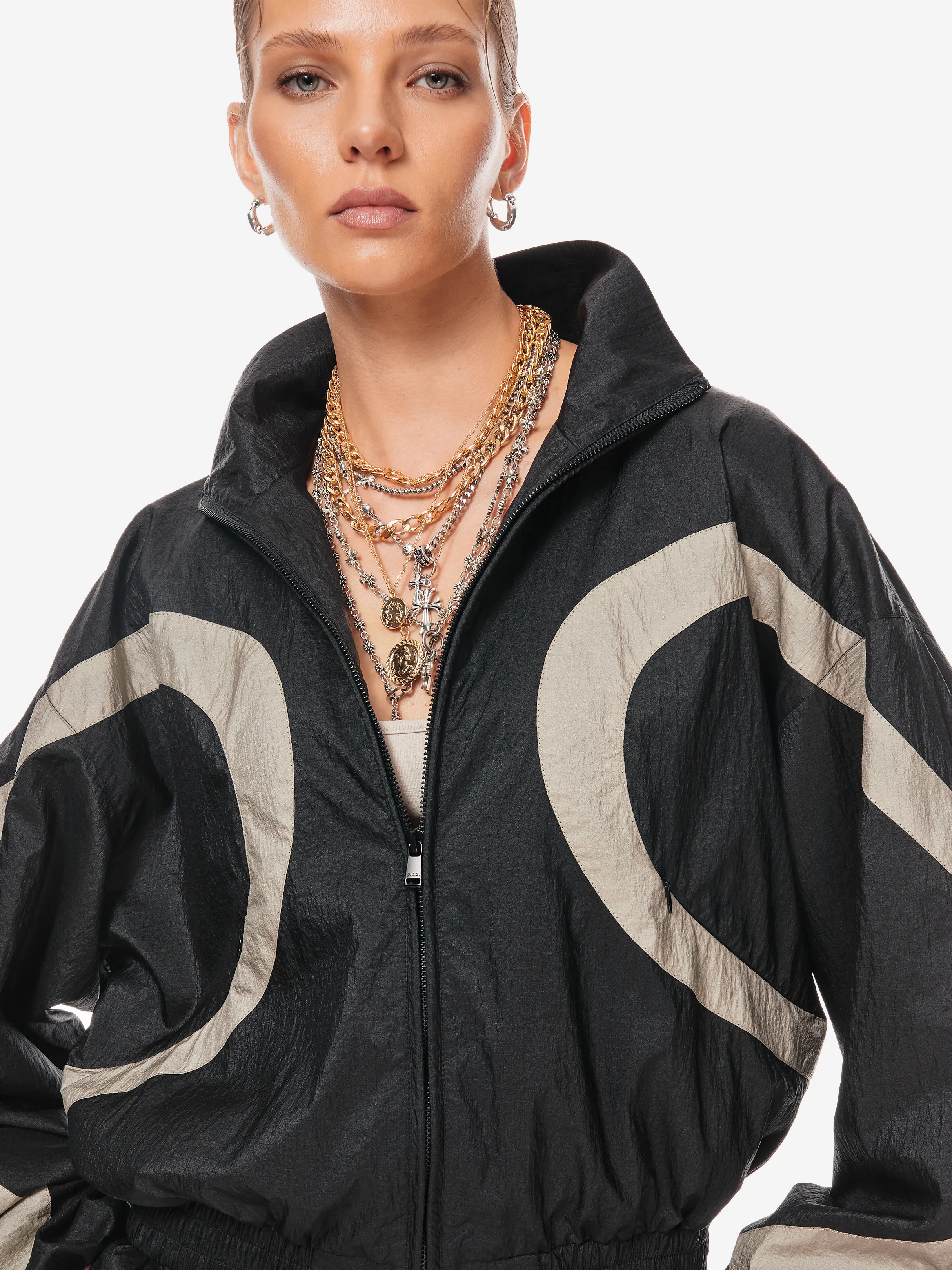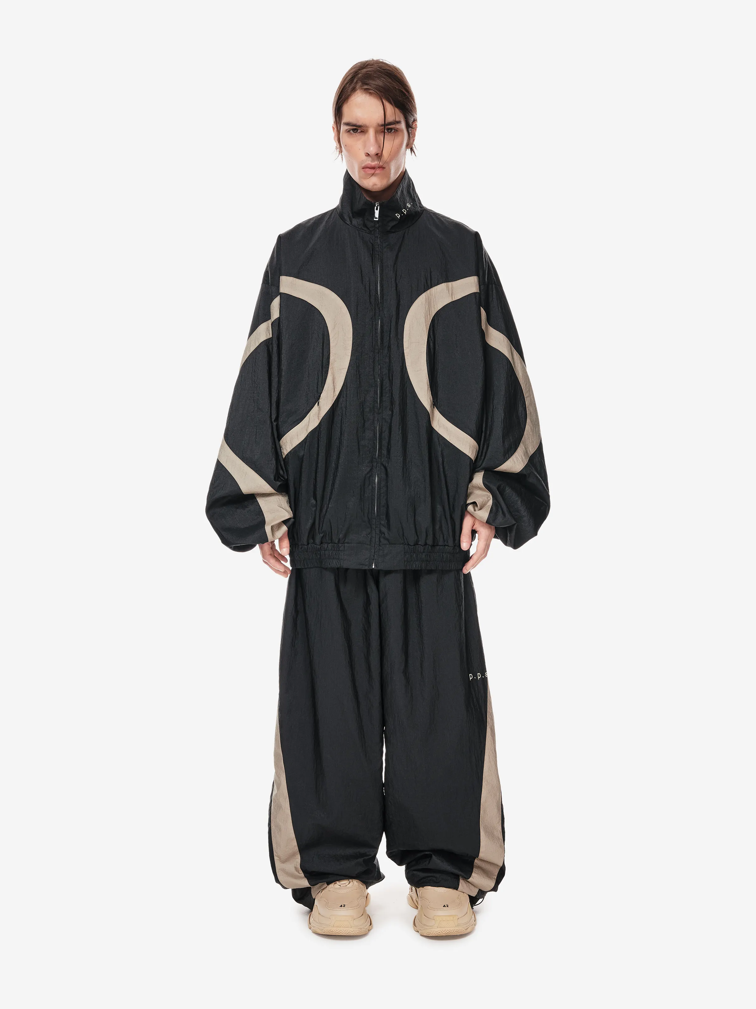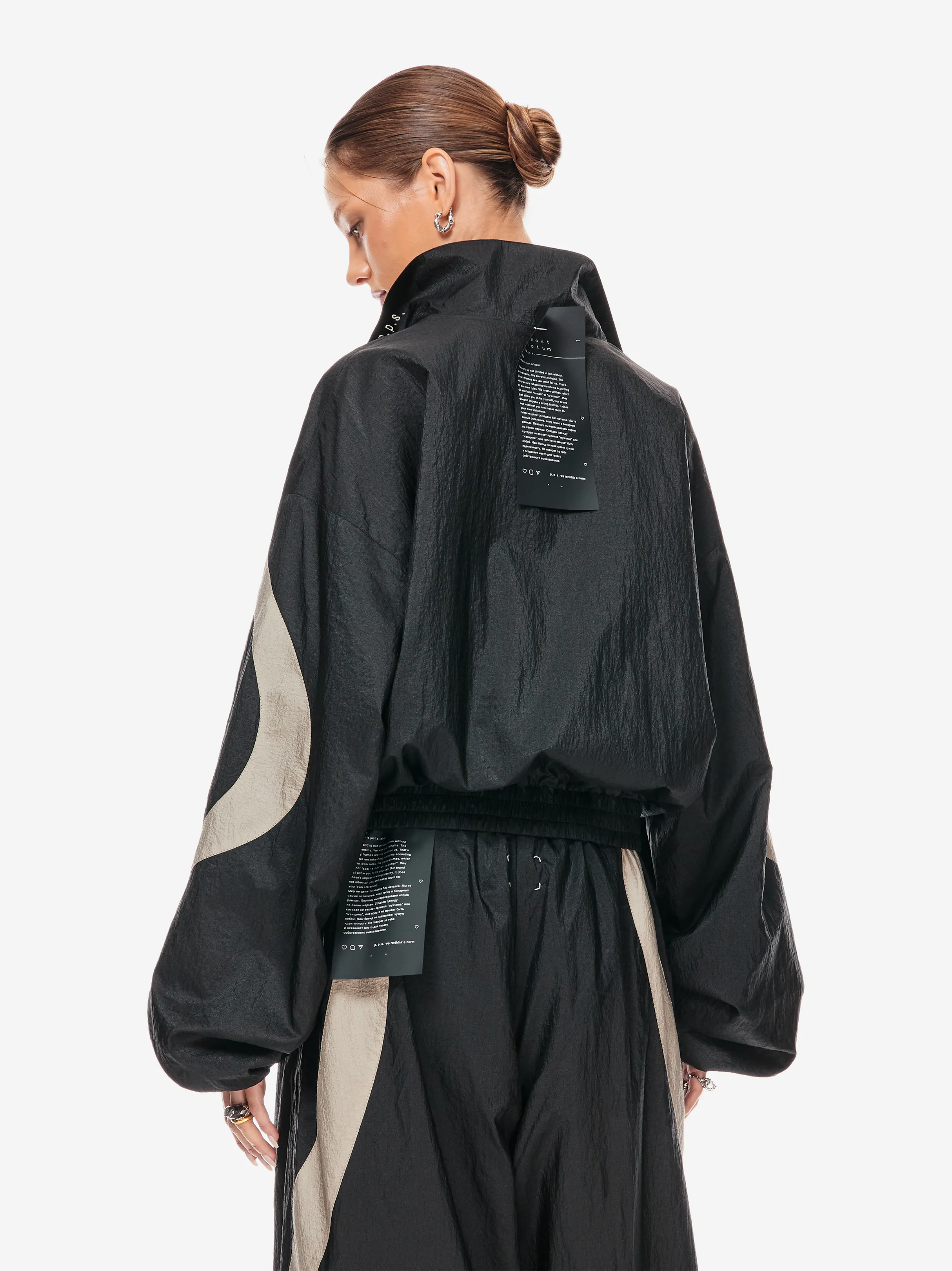 олимпийка свободного силуэта из лёгкой нейлоновой ткани с хлопковой подкладкой. фигурные контрастные вставки образуют графичную динамику кроя. застёжка на молнию и эластичный пояс формируют комфортную посадку. объёмные рукава со спущенной линией плеча дополнены резинкой внизу. фирменные детали — вышивка «скобки» на спине, логотип p.p.s. и патч-манифест.