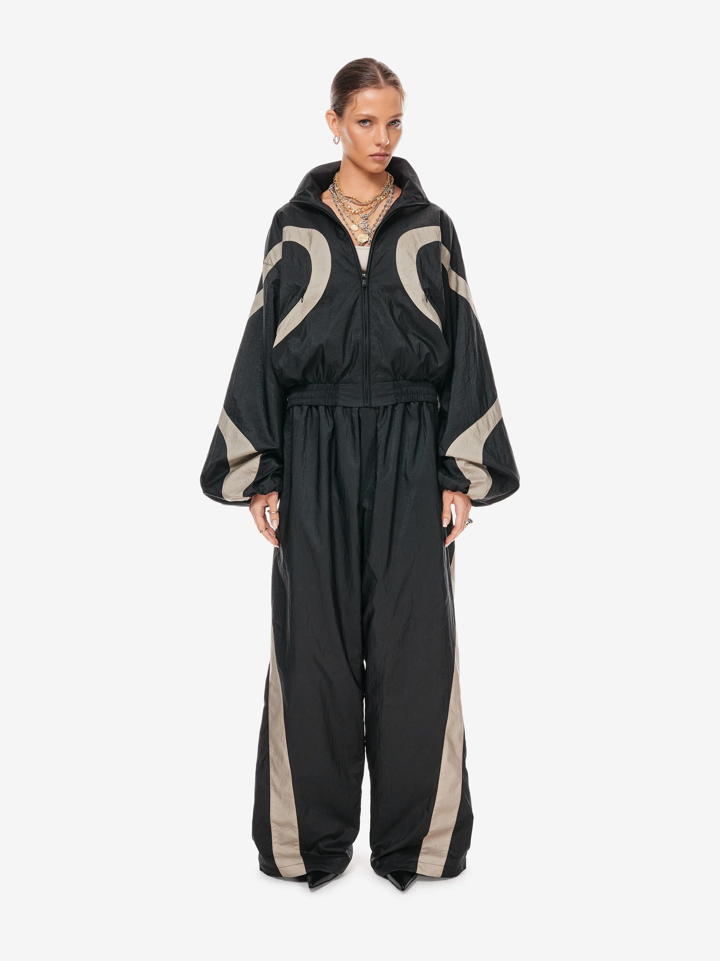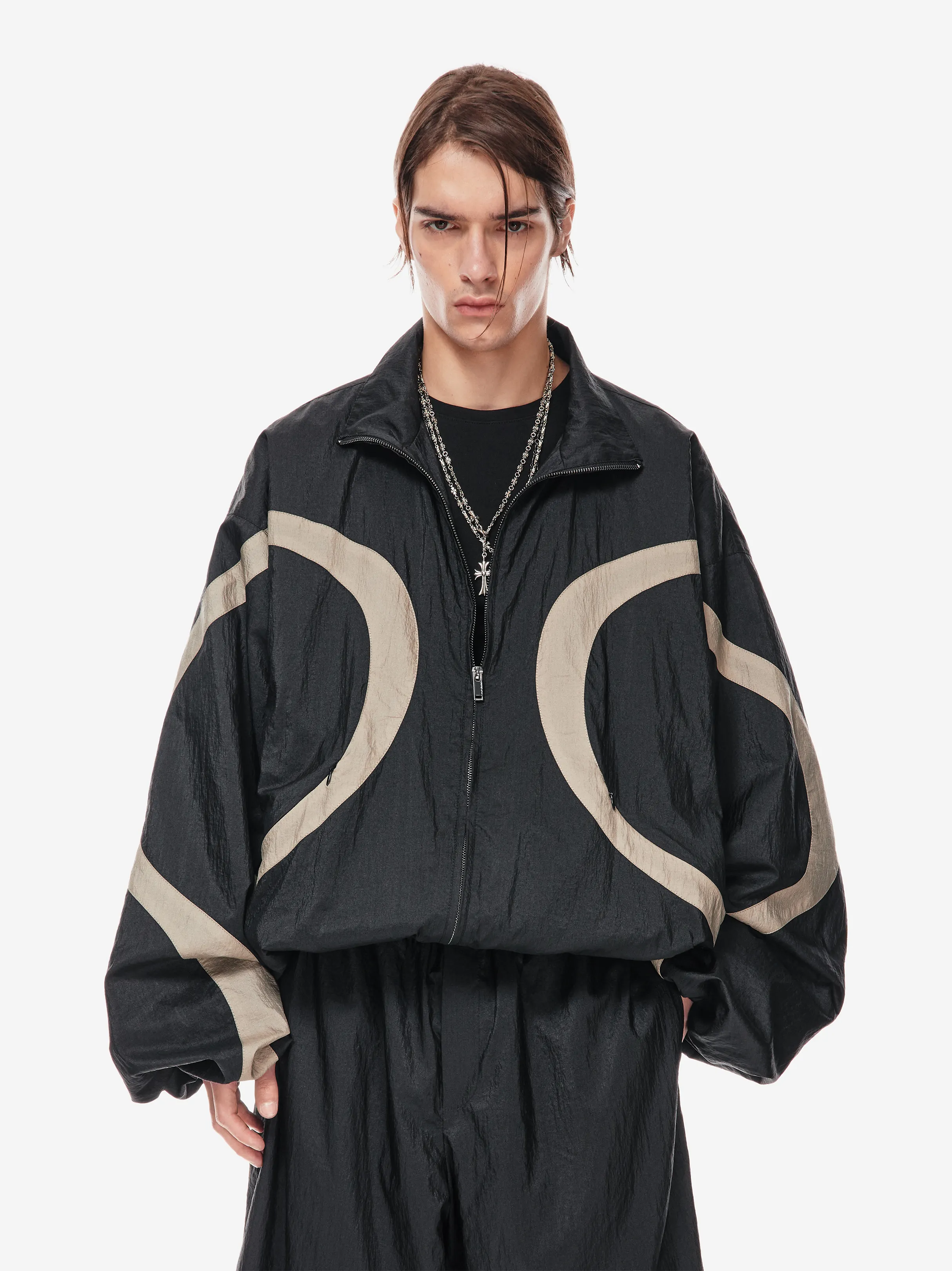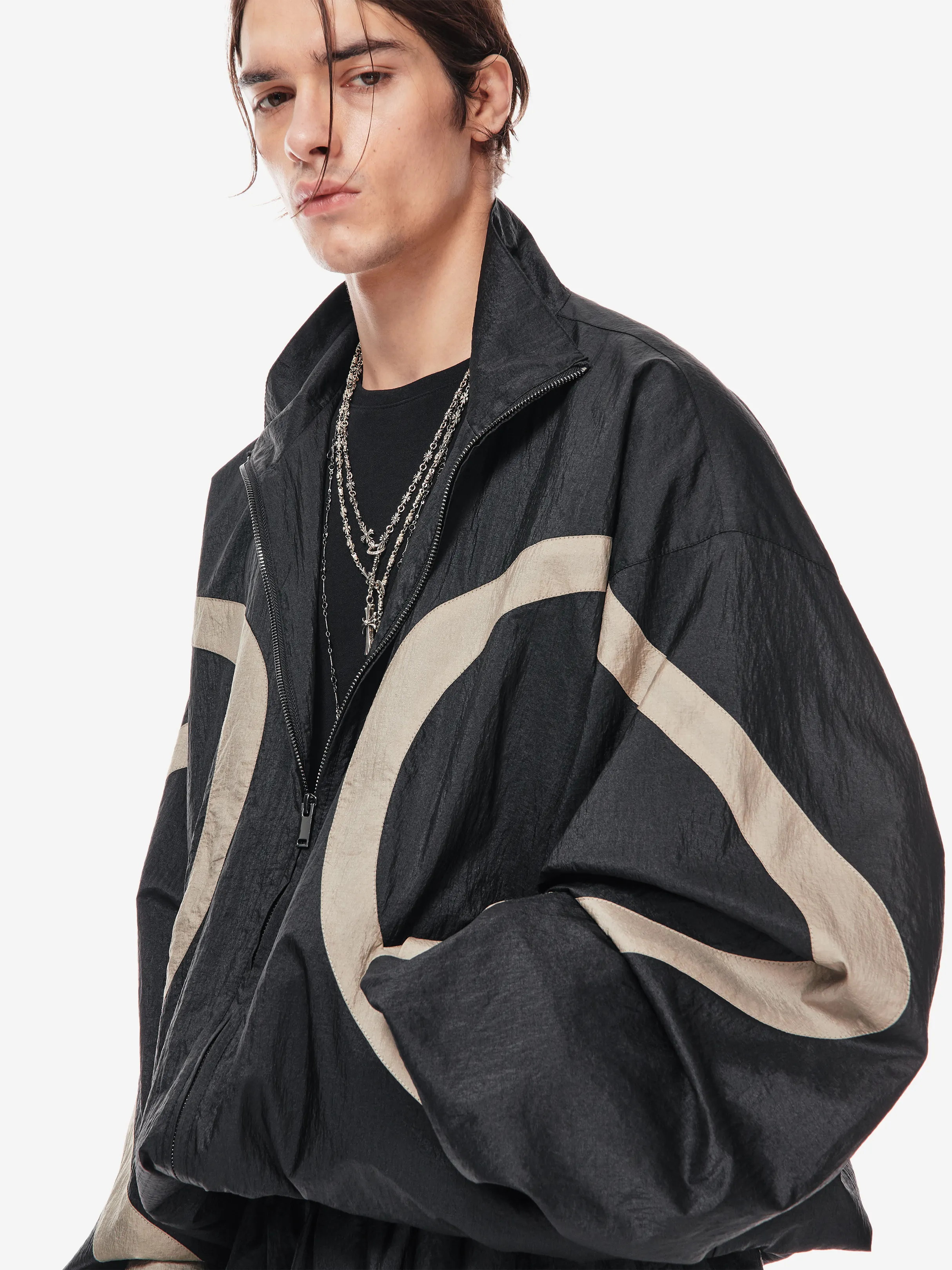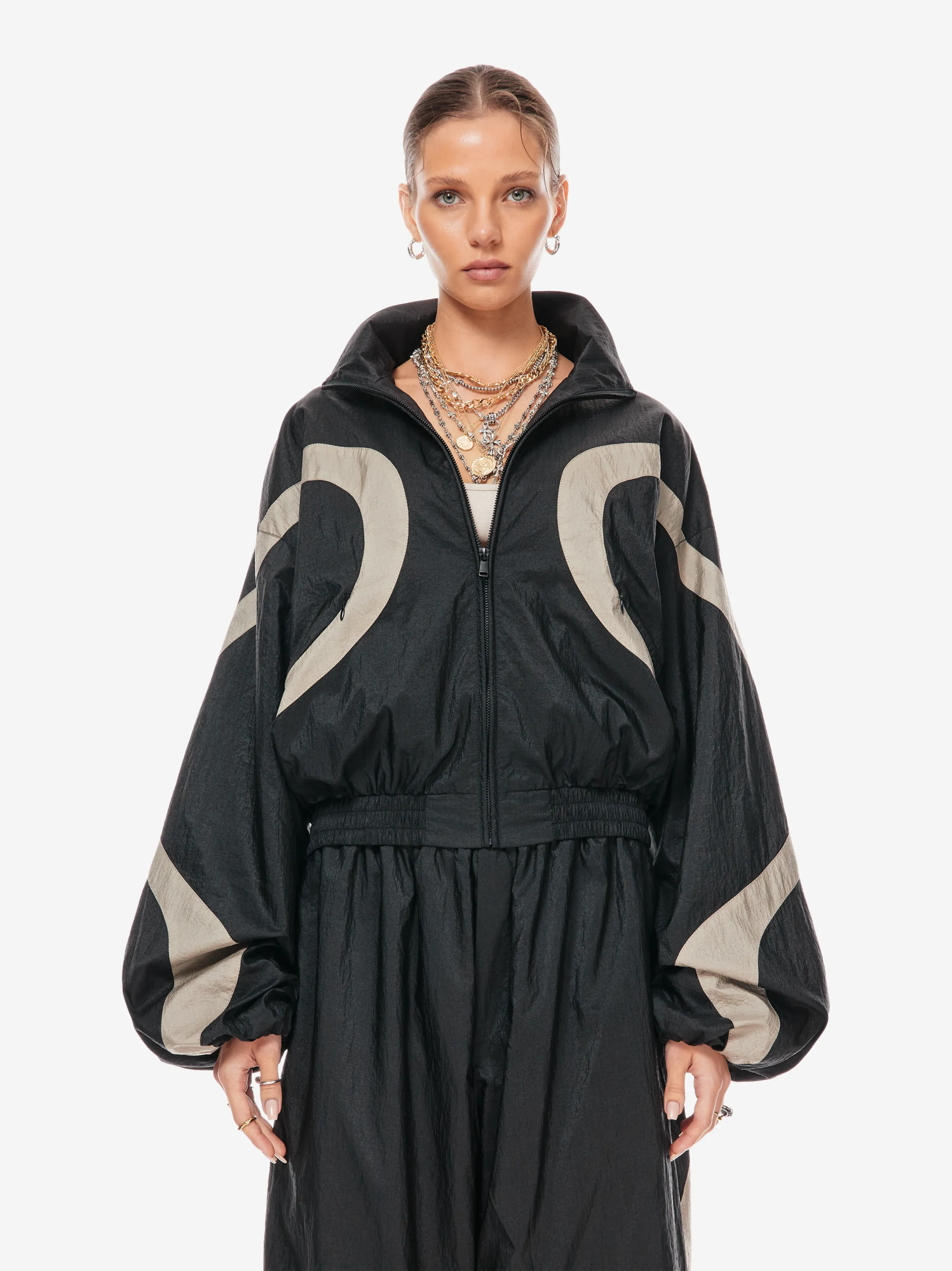олимпийка свободного силуэта из лёгкой нейлоновой ткани с хлопковой подкладкой. фигурные контрастные вставки образуют графичную динамику кроя. застёжка на молнию и эластичный пояс формируют комфортную посадку. объёмные рукава со спущенной линией плеча дополнены резинкой внизу. фирменные детали — вышивка «скобки» на спине, логотип p.p.s. и патч-манифест.