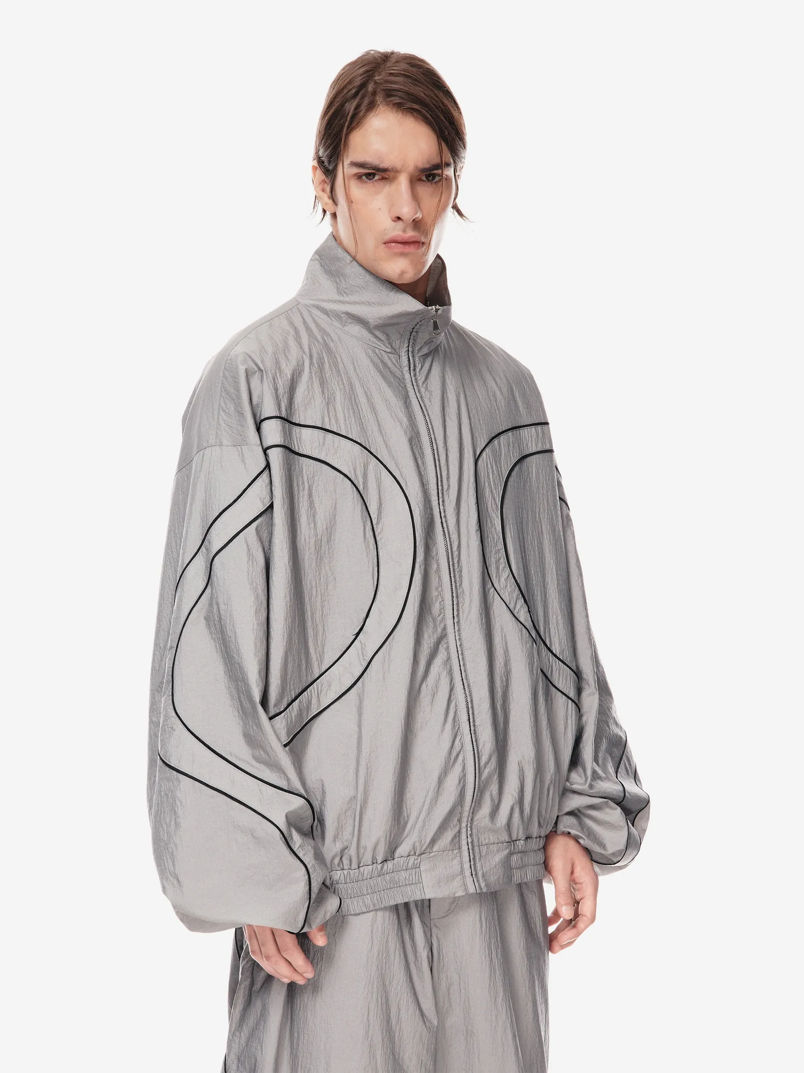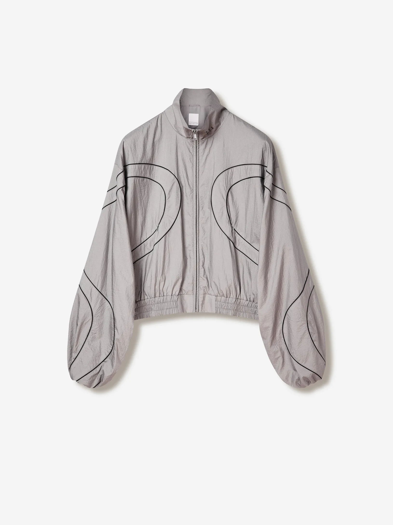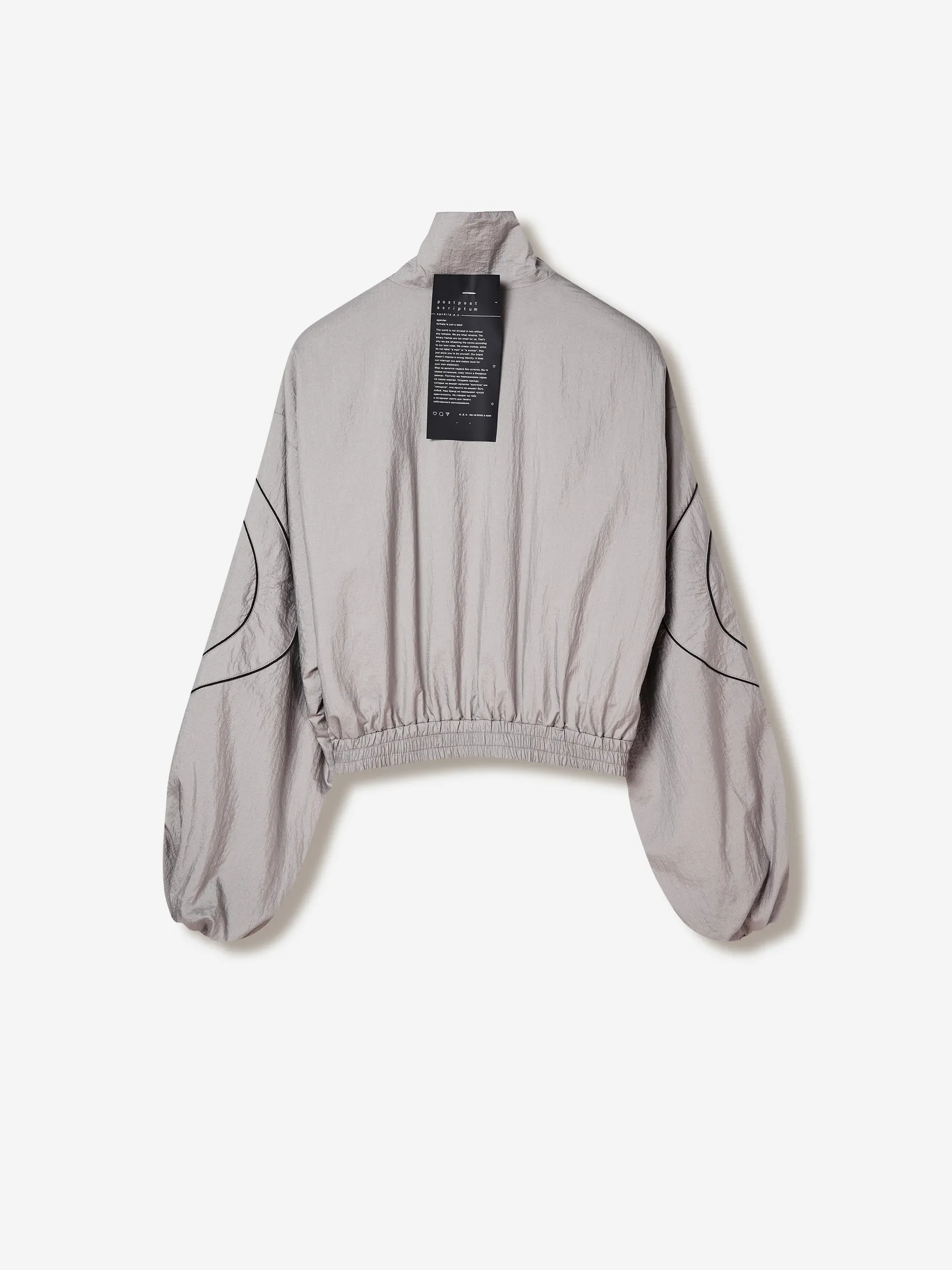 Олимпийка свободного силуэта из лёгкой нейлоновой ткани с хлопковой подкладкой. фигурные контрастные вставки образуют графичную динамику кроя. застёжка на молнию и эластичный пояс формируют комфортную посадку. объёмные рукава со спущенной линией плеча дополнены резинкой внизу. фирменные детали — вышивка «скобки» на спине, логотип p.p.s. и патч-манифест.