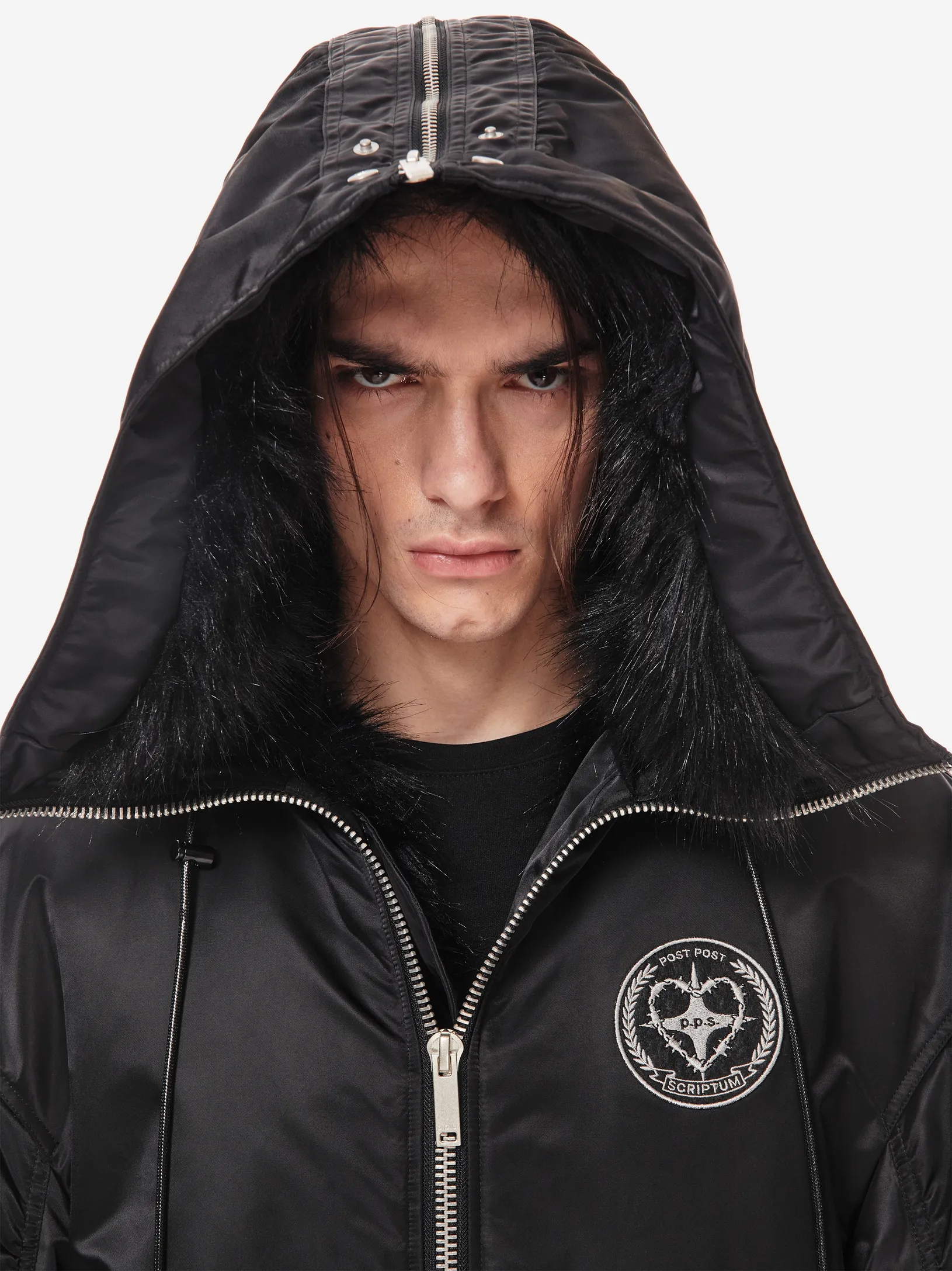 FUR UNIT — гибридный бомбер с меховой архитектурой. ресайкл-нейлон встречает комбинированное утепление: терморегулирующий мех по корпусу и легкий пух в рукавах. кастомная фурнитура с гравировкой и вощеные шнуры как атрибуты утилитарного дизайна. форма, следующая за функцией при -30°C.