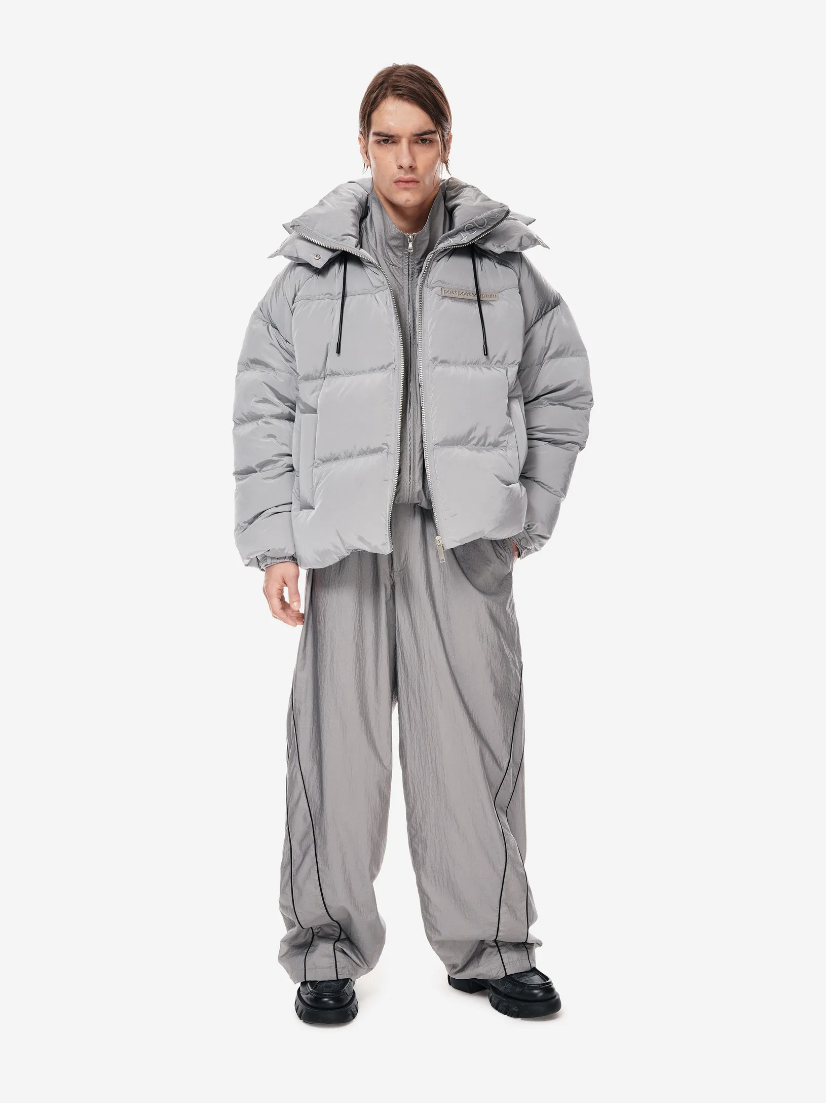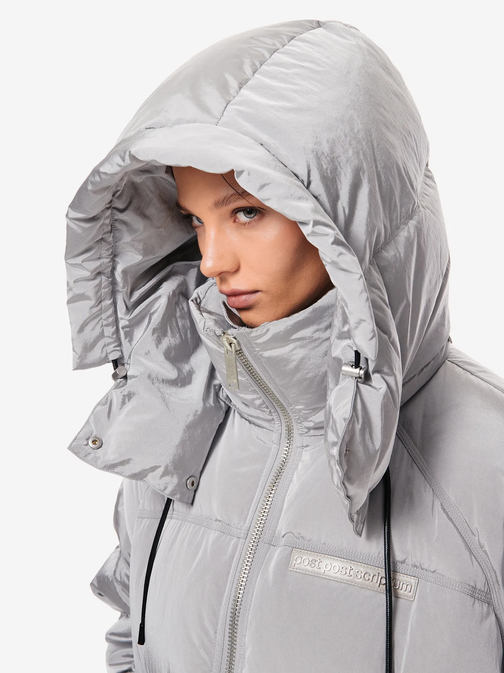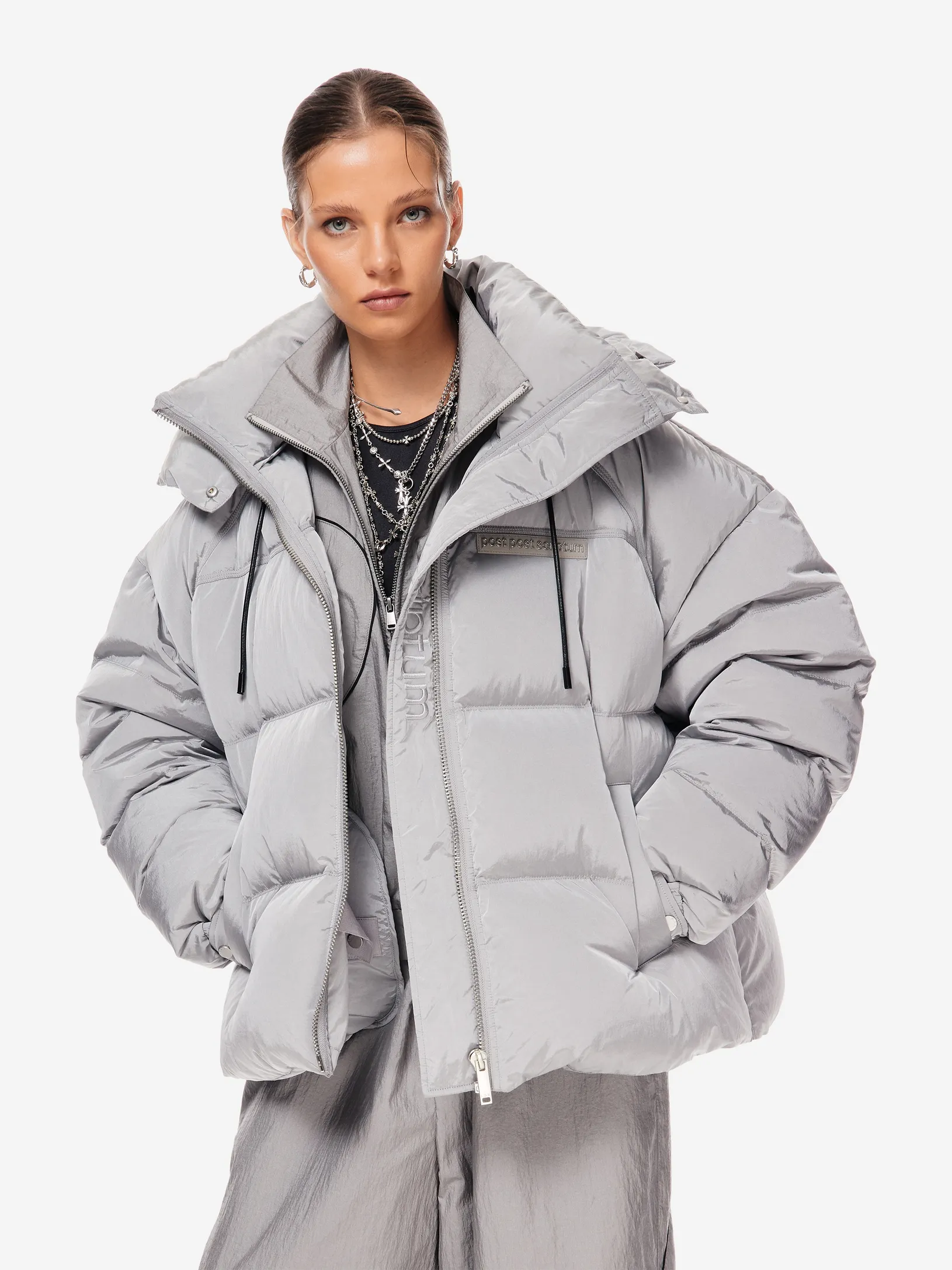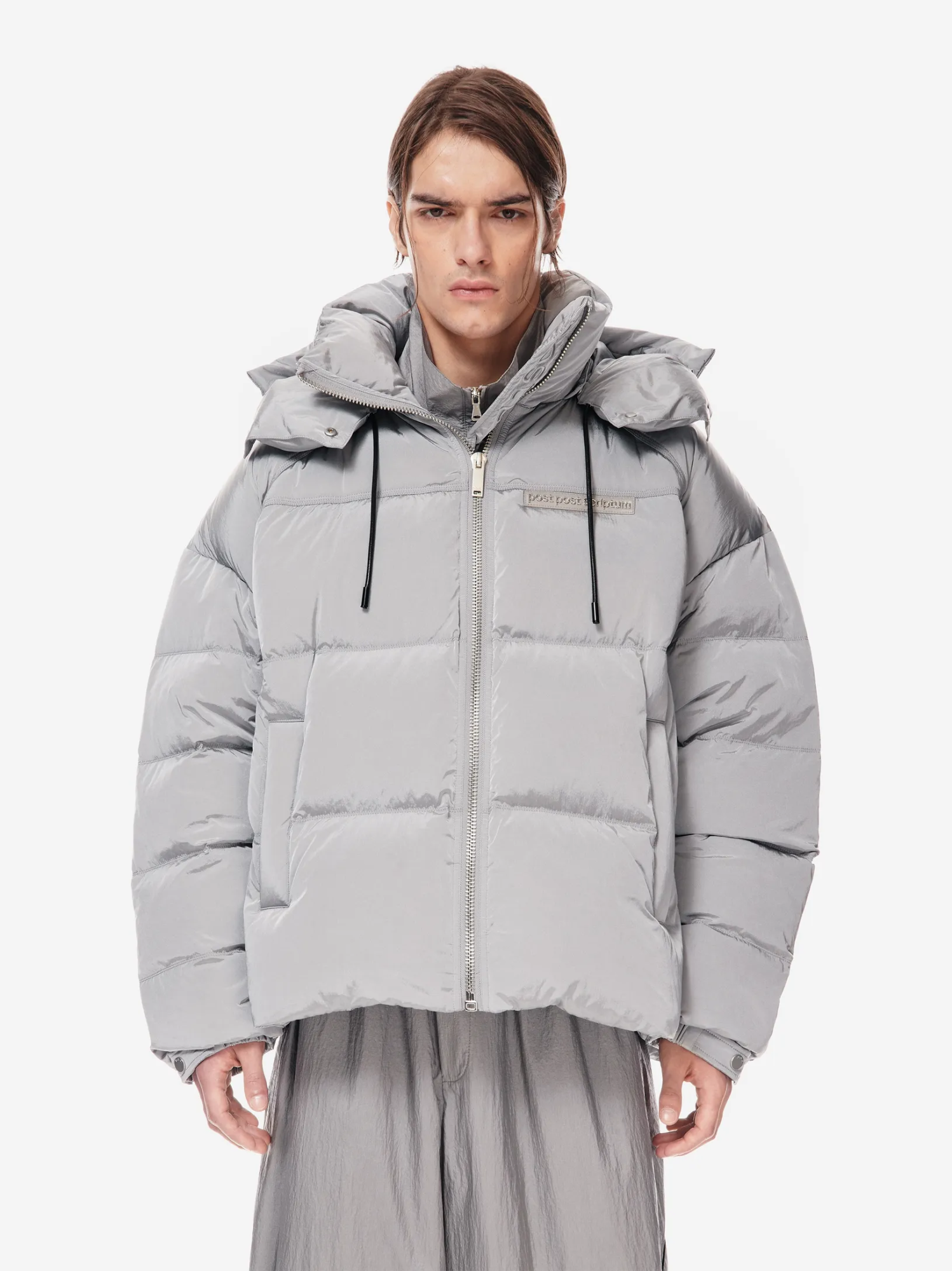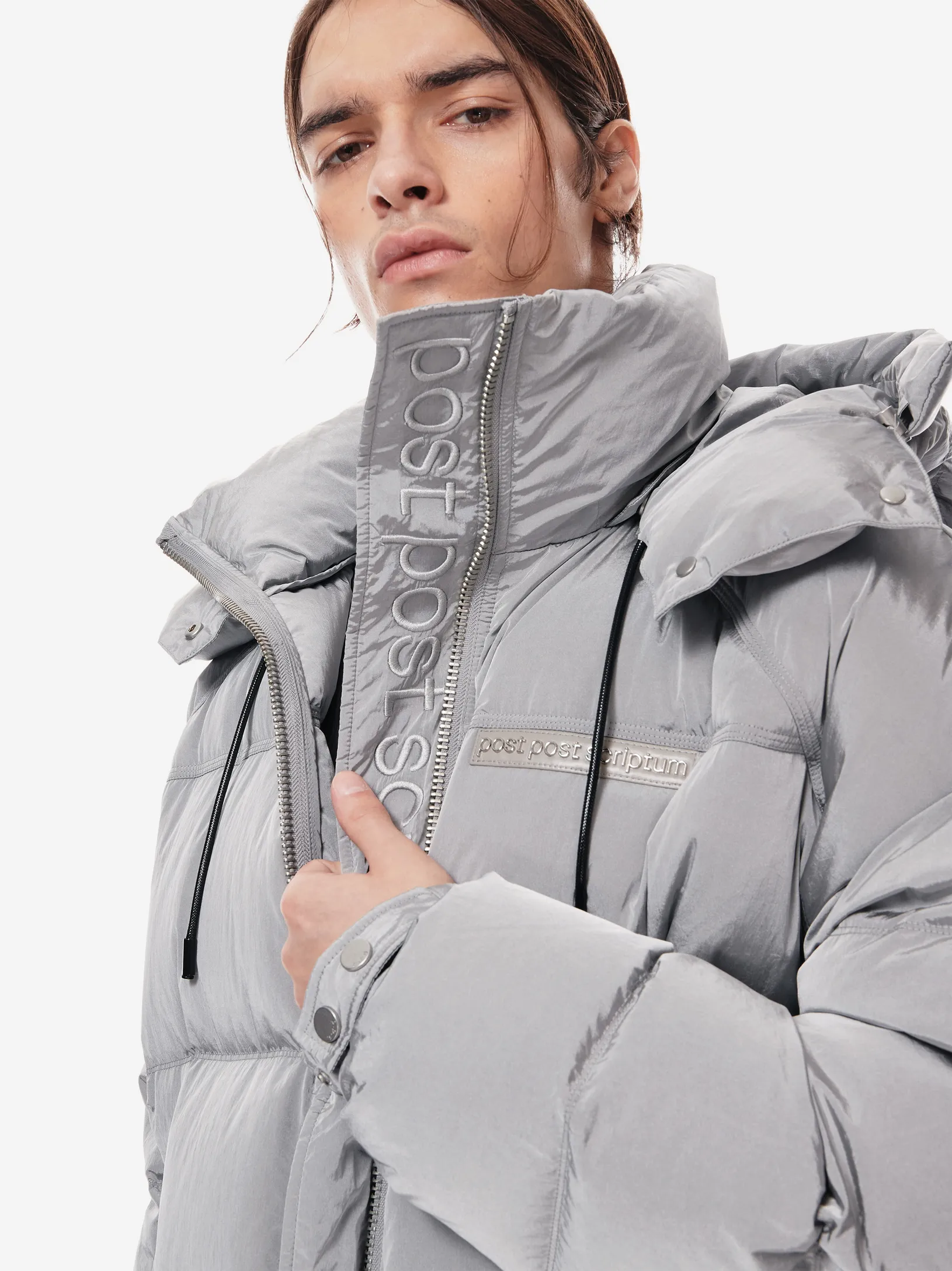 LOOM PUFF — архитектурный силуэт в оверсайз-пуховике. функциональные элементы — регулируемый капюшон, высокая стойка и система кулис — определяют скульптурный крой. узнаваемость бренда проявляется в деталях: металлические буквы post post scriptum и гравировка на фурнитуре. вещь, сочетающая утилитарность и эстетику для температуры до –25 °C.