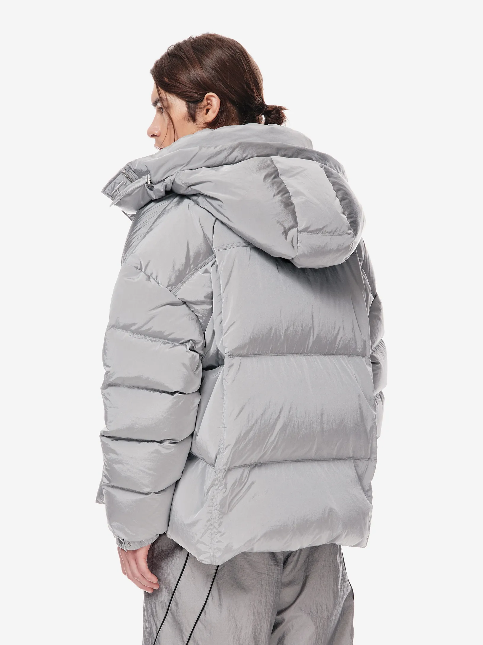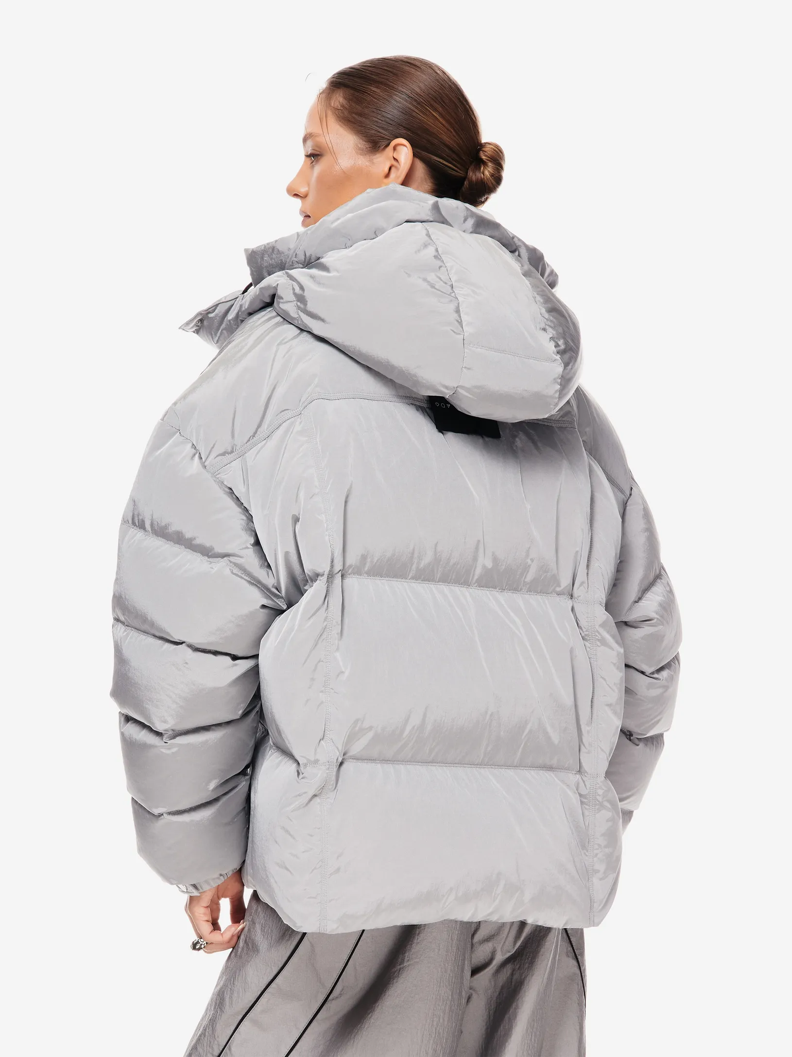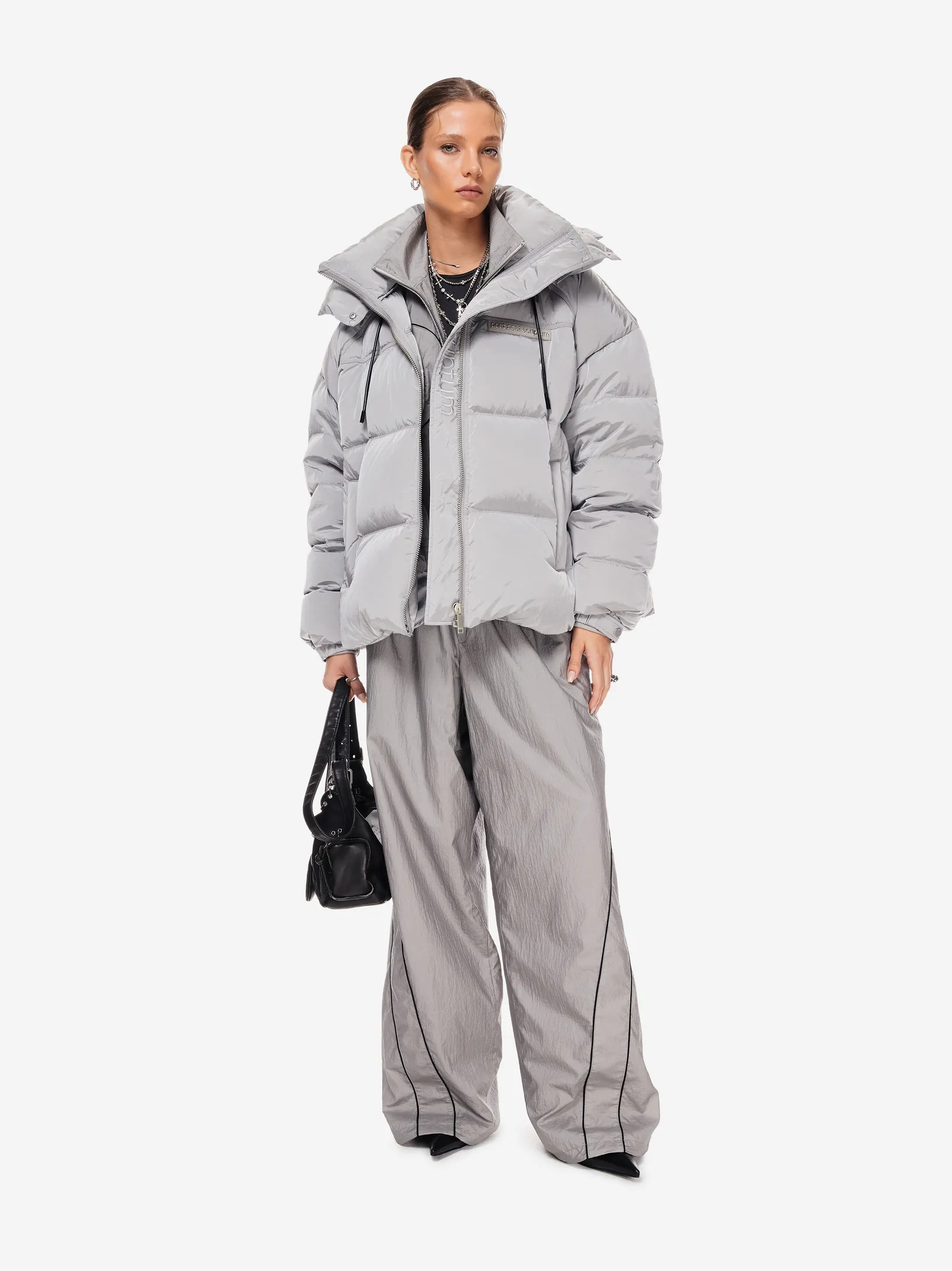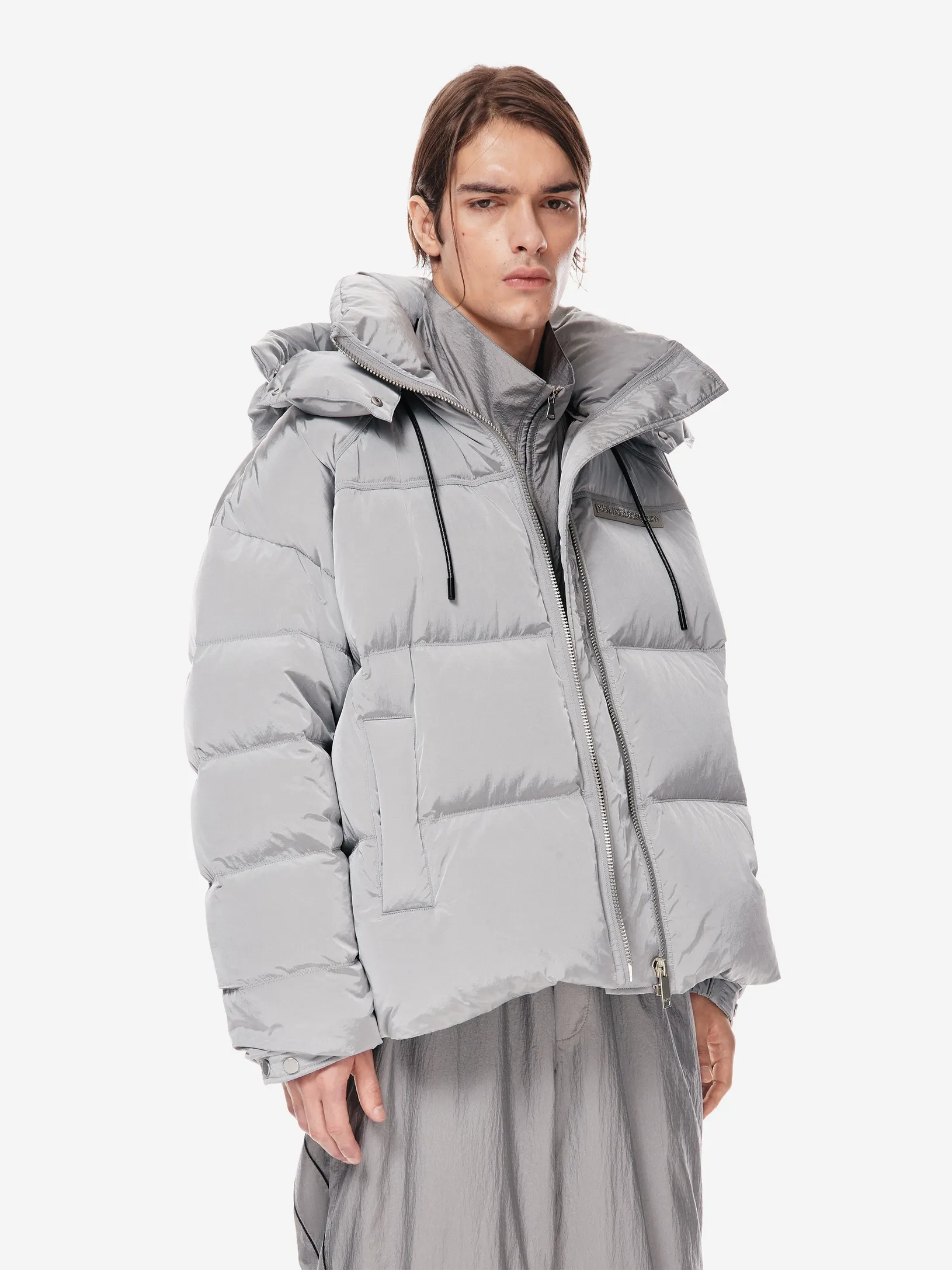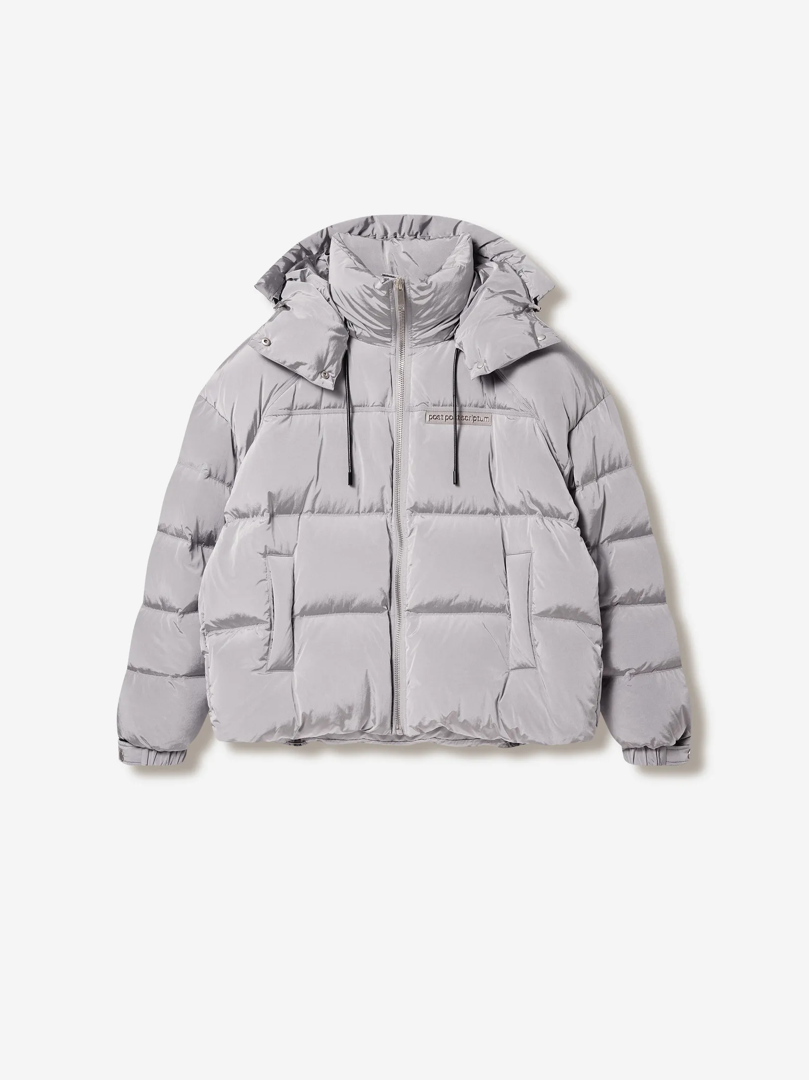 LOOM PUFF — архитектурный силуэт в оверсайз-пуховике. функциональные элементы — регулируемый капюшон, высокая стойка и система кулис — определяют скульптурный крой. узнаваемость бренда проявляется в деталях: металлические буквы post post scriptum и гравировка на фурнитуре. вещь, сочетающая утилитарность и эстетику для температуры до –25 °C.