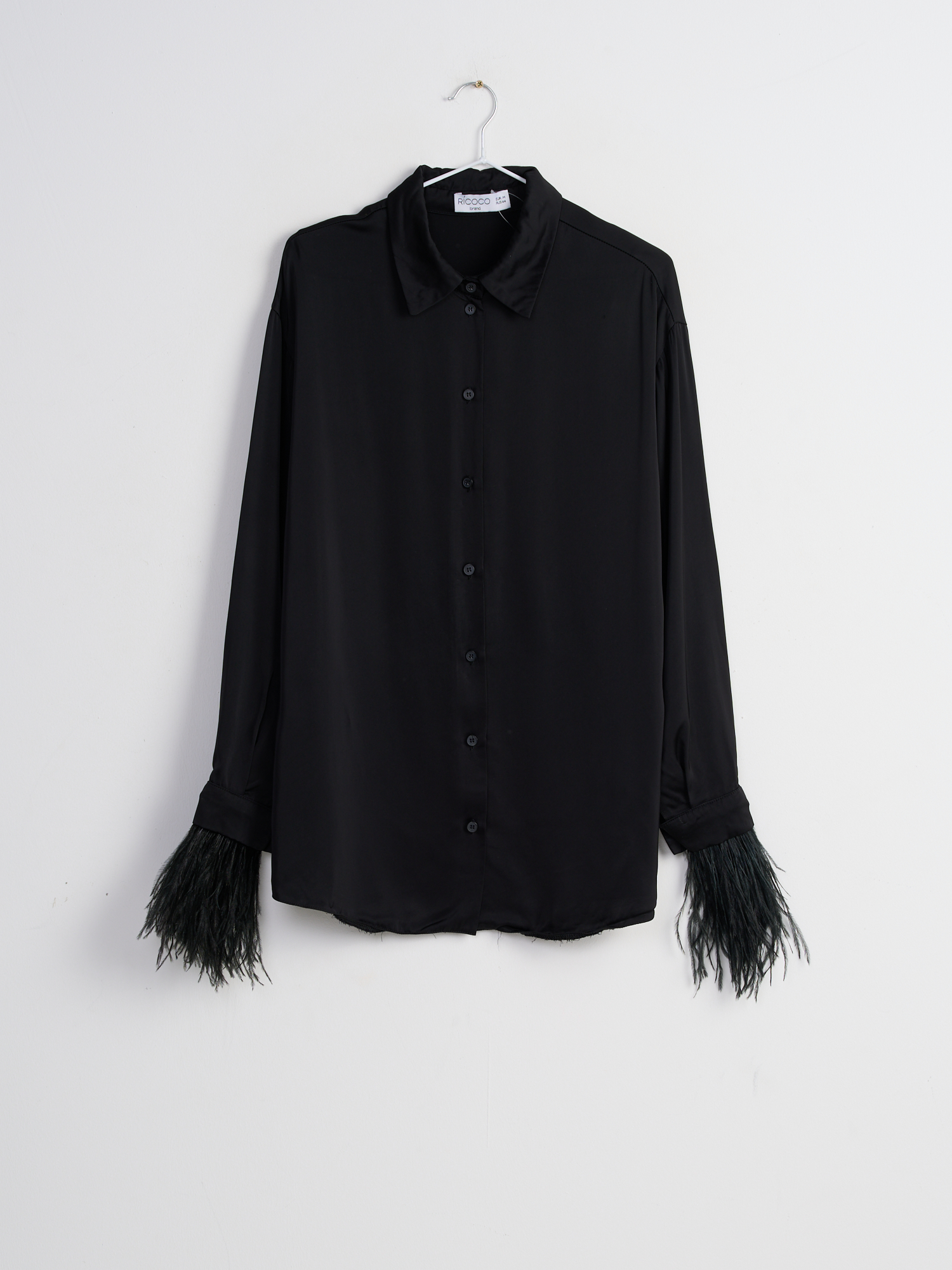 Чёрная рубашка RICOCO — это стильный и яркий элемент гардероба. Перья придают модели оригинальность и запоминающийся вид. Отличный выбор для тех, кто хочет выделиться и добавить в образ нотку экстравагантности.