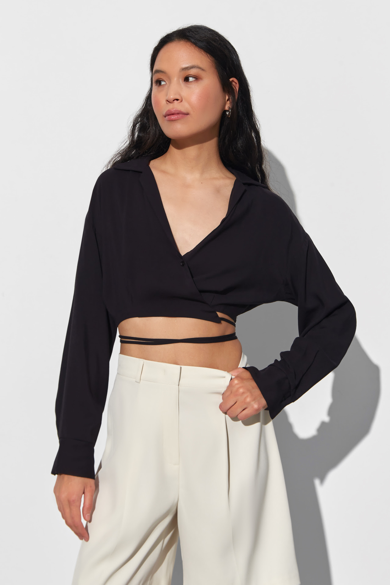 Укороченная рубашка из мягкого хлопка — идеальный выбор для комфортного образа. Завязки позволяют регулировать силуэт, добавляя уникальности вашему стилю. Эта рубашка обеспечит вам удобство и лёгкость в течение всего дня.