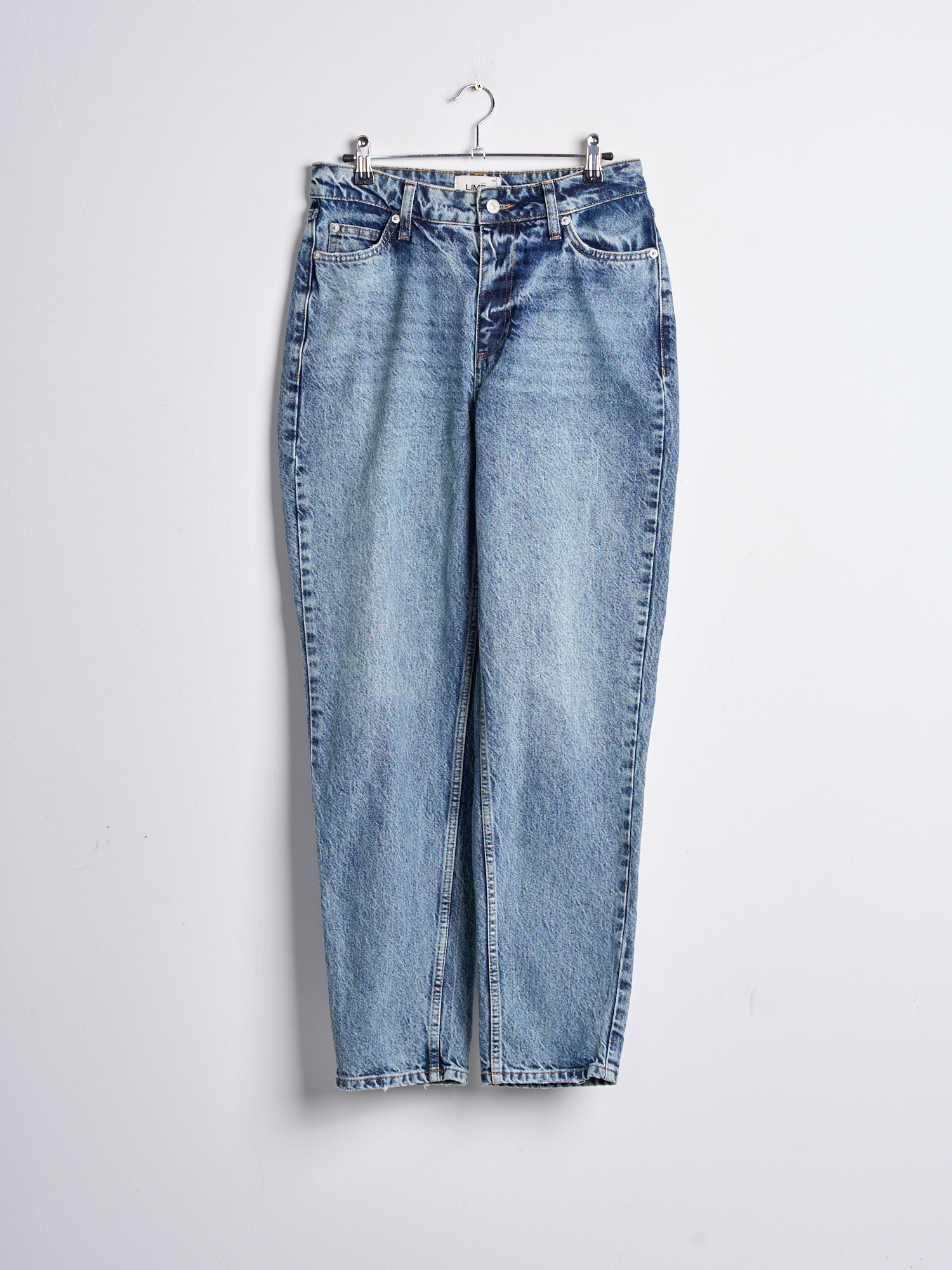 Обновленный крой джинсов мом фит. Универсальная модель с высокой посадкой по талии и слегка зауженными манжетами. Пять карманов. Застежка на молнию и металлическую пуговицу-болт. Выполнены из хлопкового денима с эффектом потертости.