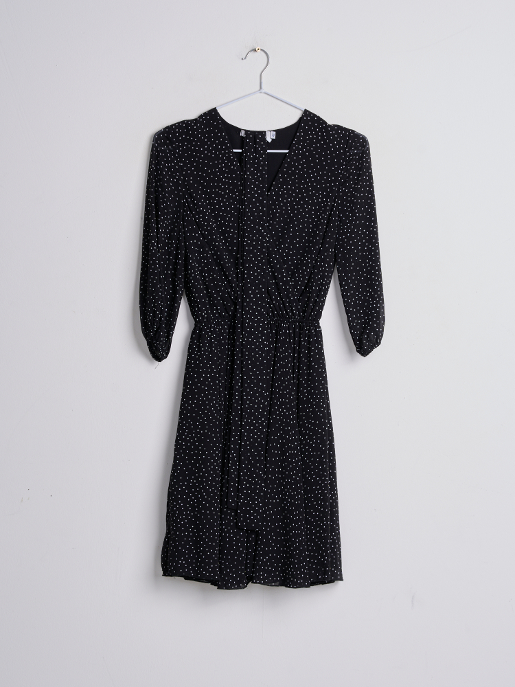 Элегантное чёрное платье в горошек — идеальный выбор для особых случаев. Оно подчеркнёт ваш утончённый вкус и добавит образу нотку женственности. Прекрасный вариант для вечернего выхода или свидания.