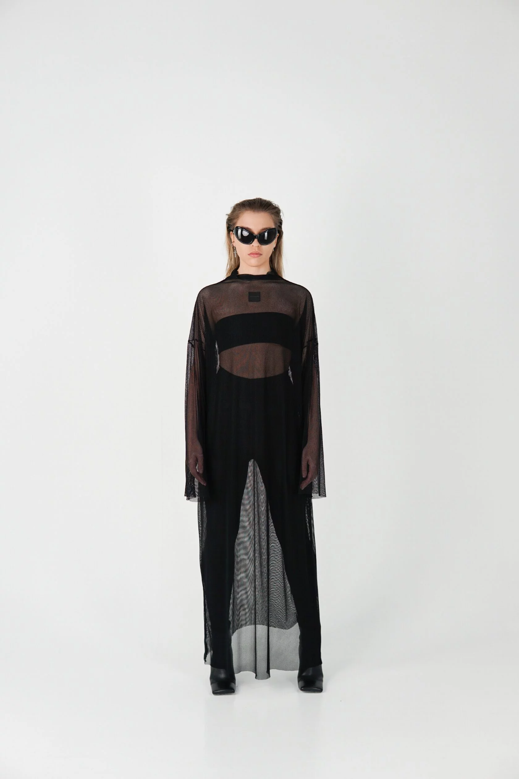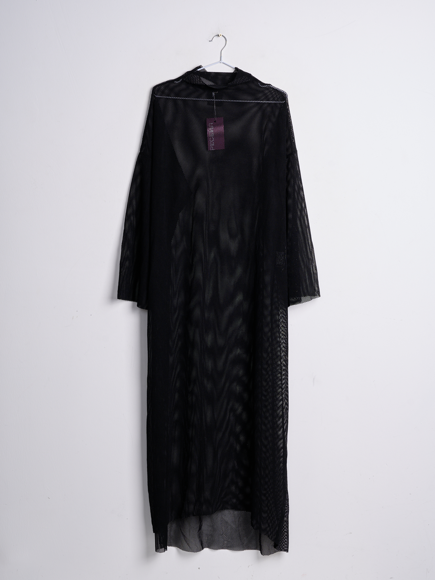 Сетка фактурная прямого кроя длины миди с горловиной и необработанными краями. На спинке фирменная бирка-леттеринг из натуральной кожи.