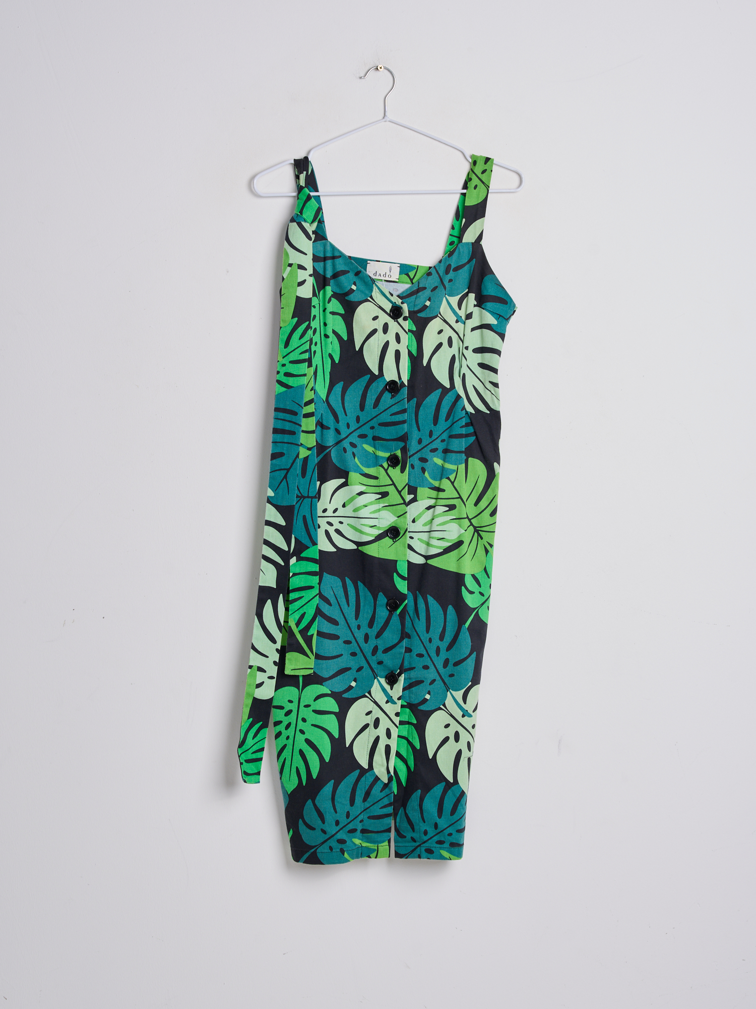 Лёгкий летний сарафан с принтом в виде тропических листьев — идеальный выбор для жарких дней. Модель на пуговицах обеспечивает удобство и стильный вид. Подойдёт для прогулок и встреч на свежем воздухе.