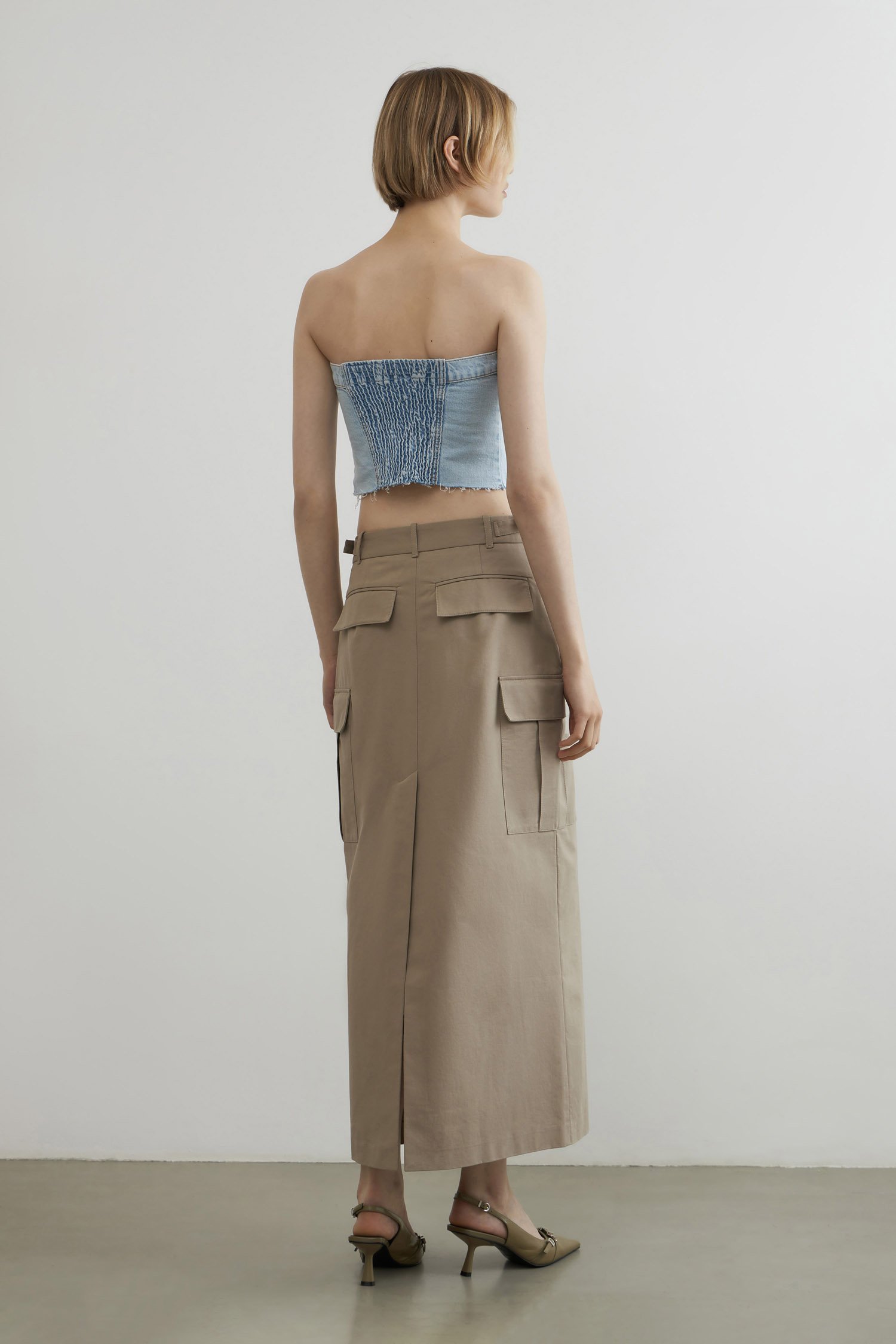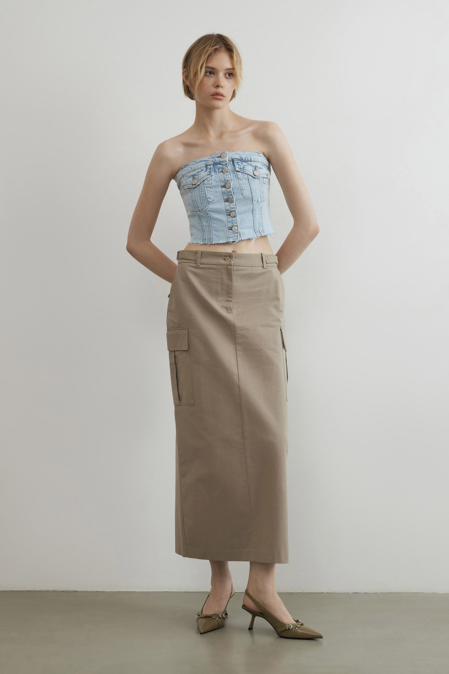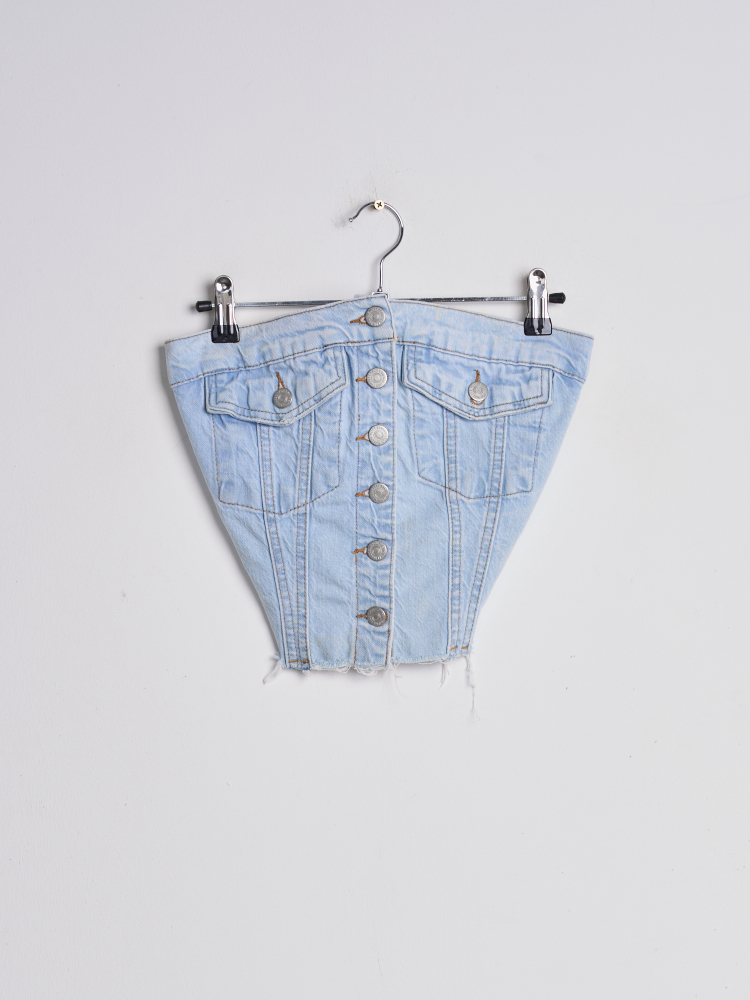 Укороченный джинсовый топ с открытой линией плеч. Накладные нагрудные карманы с клапанами. Эластичная вставка на спине. Необработанный нижний край и эффект потертости. Застежка на металлические пуговицы.