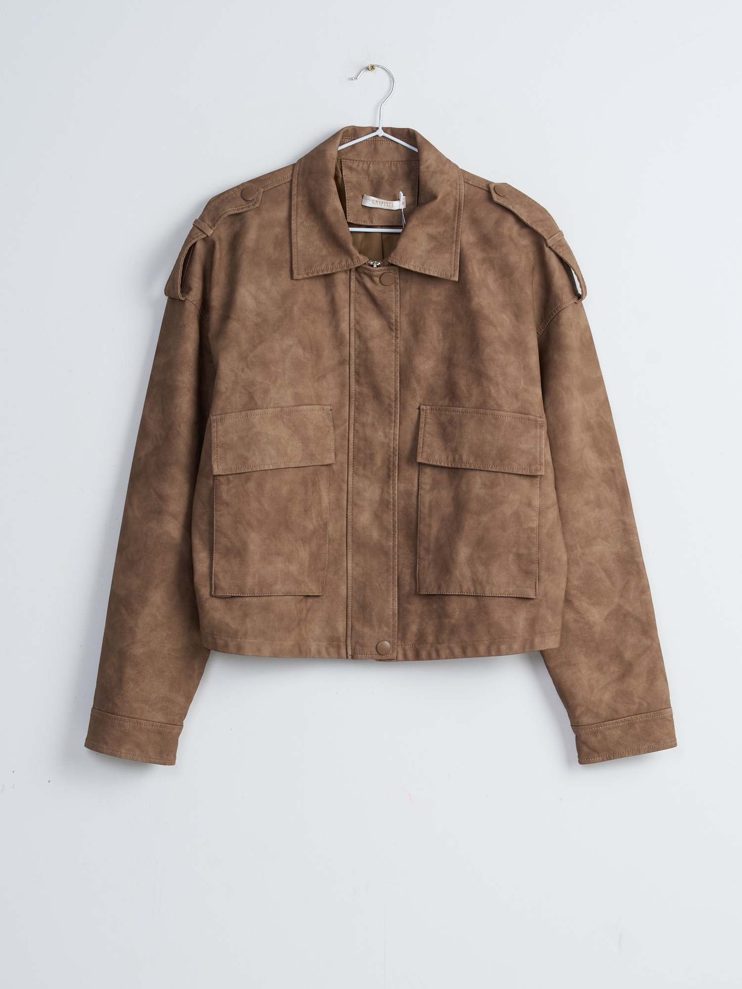 Куртка выполнена из искусственной кожи. Детали: застежка на молнии и кнопки, отложной воротник, 2 кармана, текстильная подкладка.