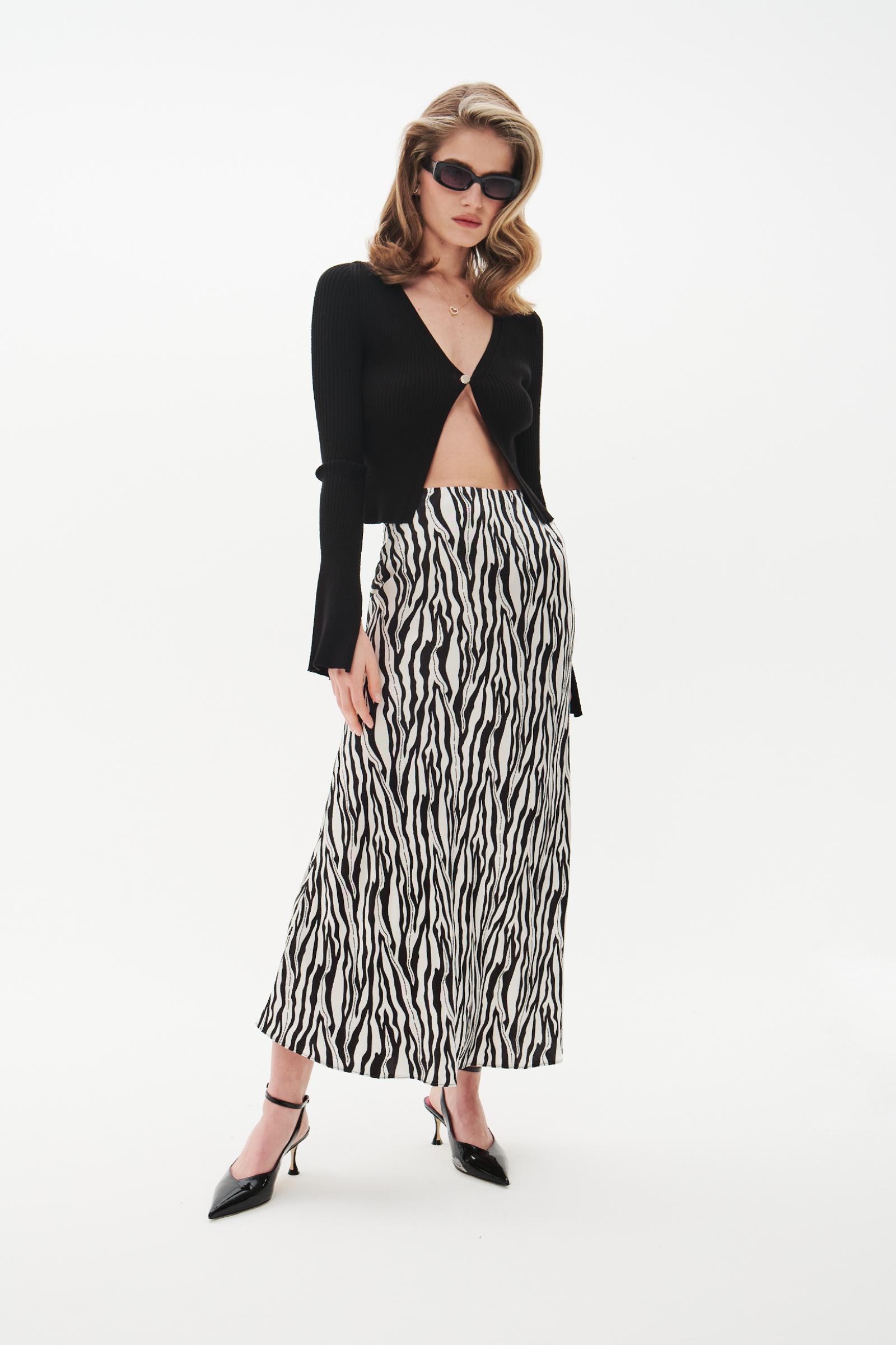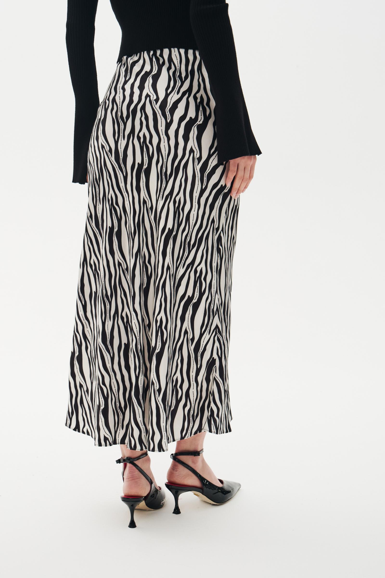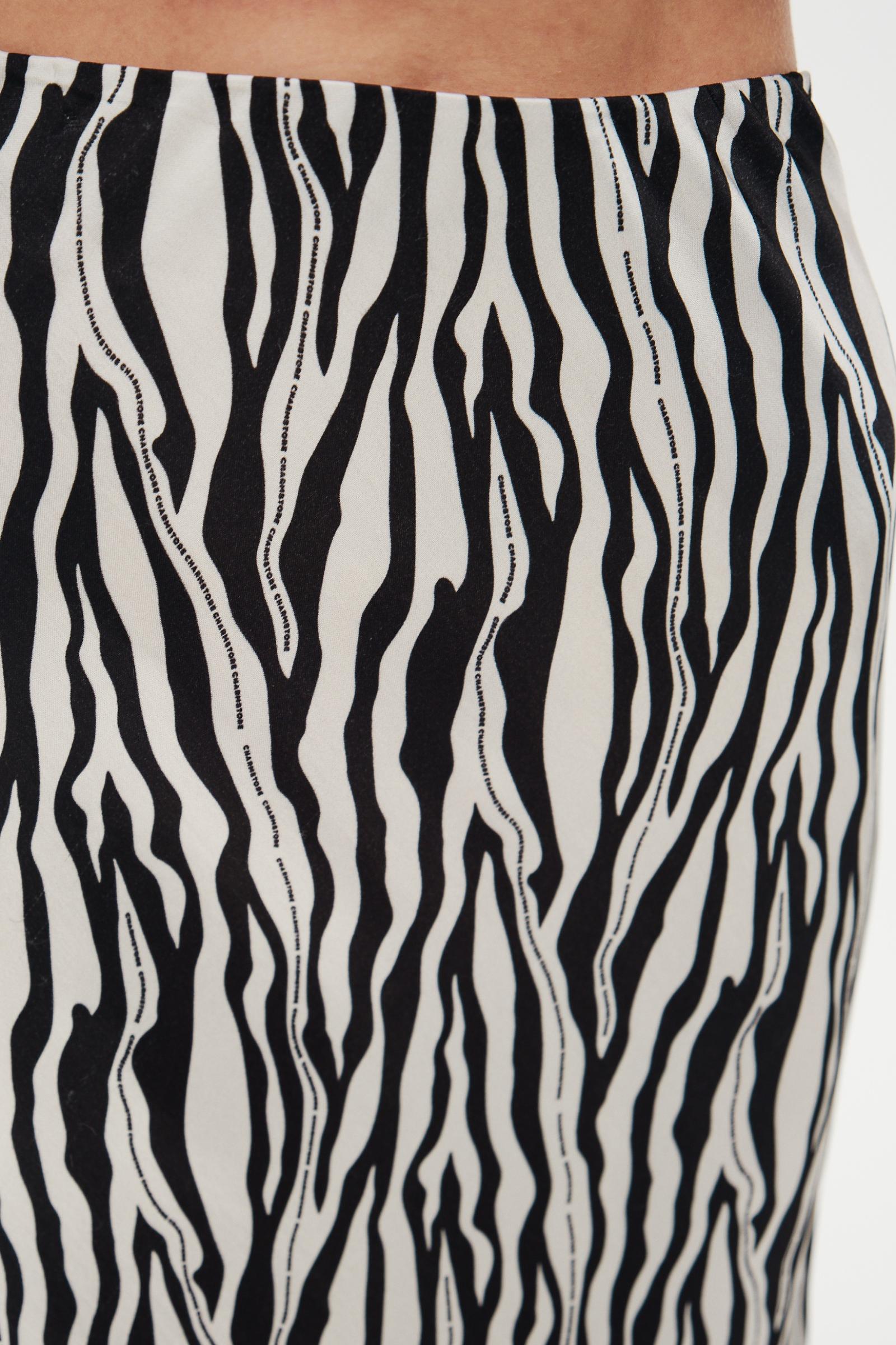 Сатиновая принтованная юбка на резинке черно-белого цвета станет ярким дополнением образа. Изделие выполнено из плотного струящегося сатина в зебровый брендированный принт. Дополняйте образ свитером весной или топом летом.