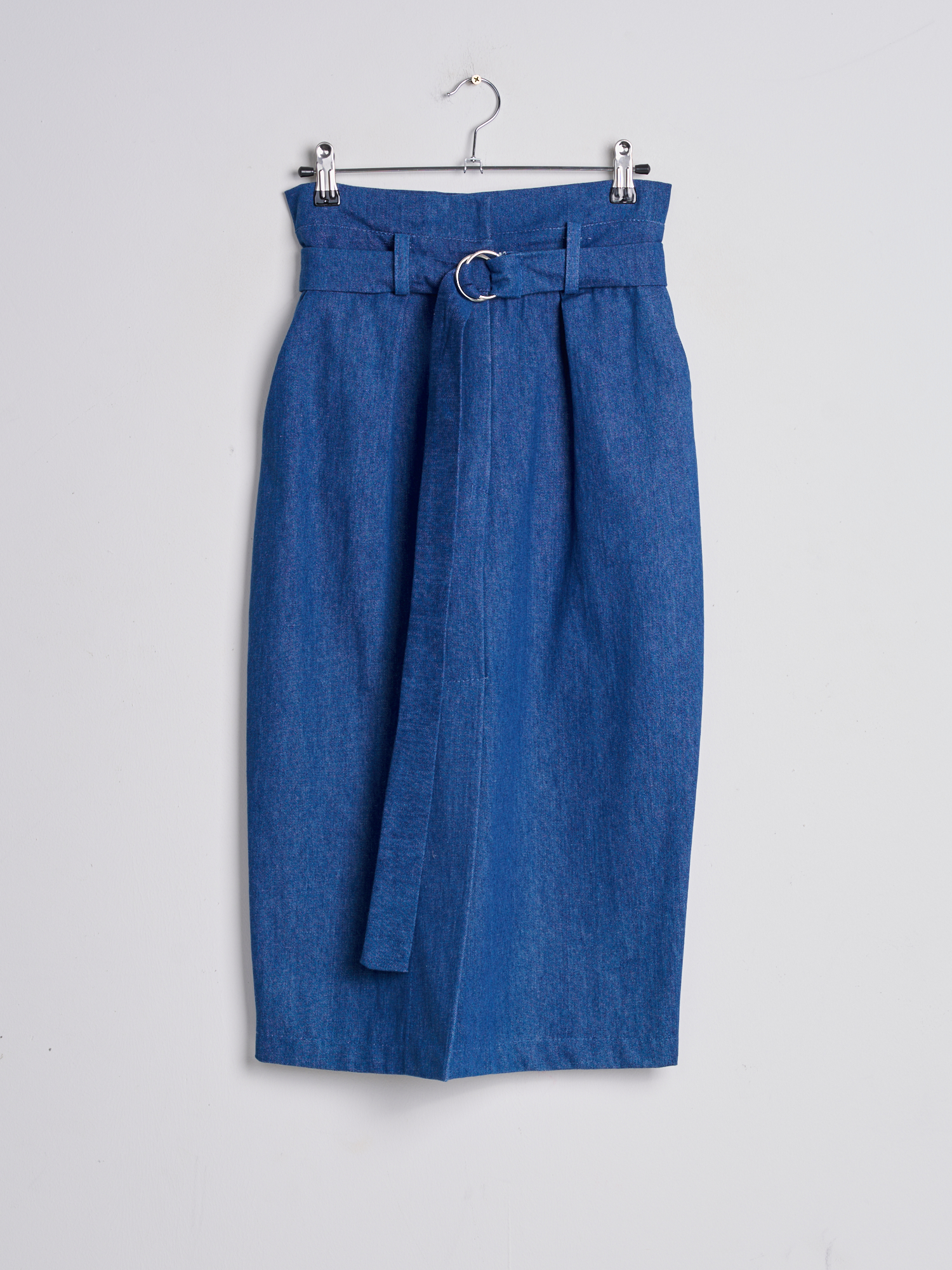 Джинсовая юбка-карандаш миди. Юбка на высокой талии имеет стильный пояс из основного материала с кольцом.