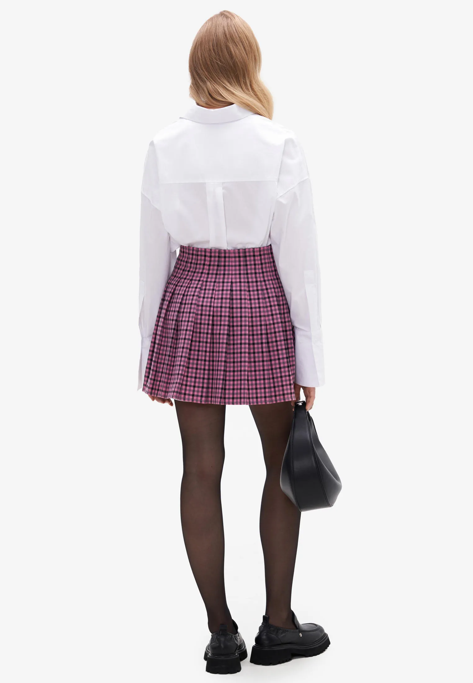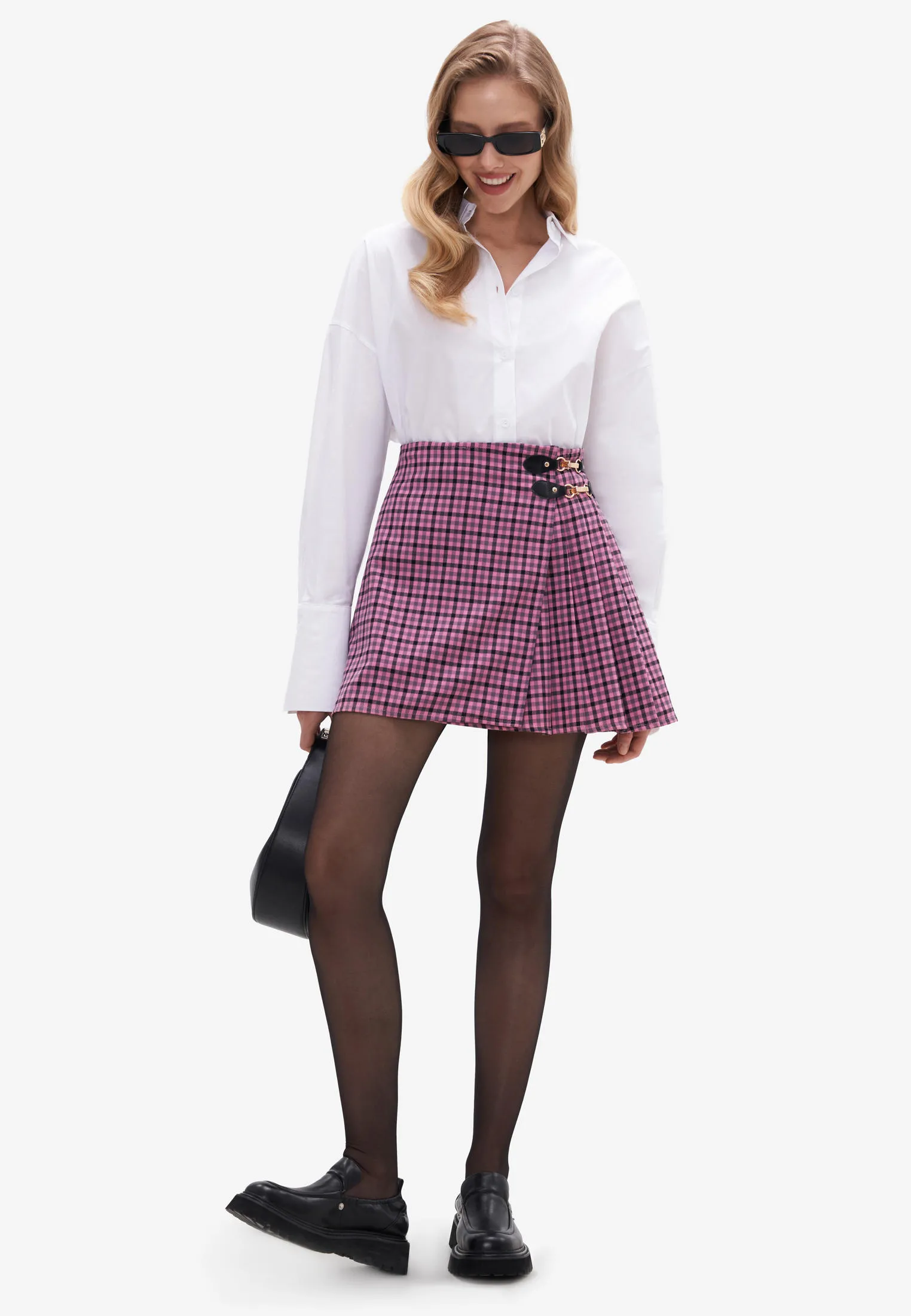 Юбка-мини с кроем на запаах декорирована клетчатым принтом «тартан». Модель дополнена застежкой с карабинами.