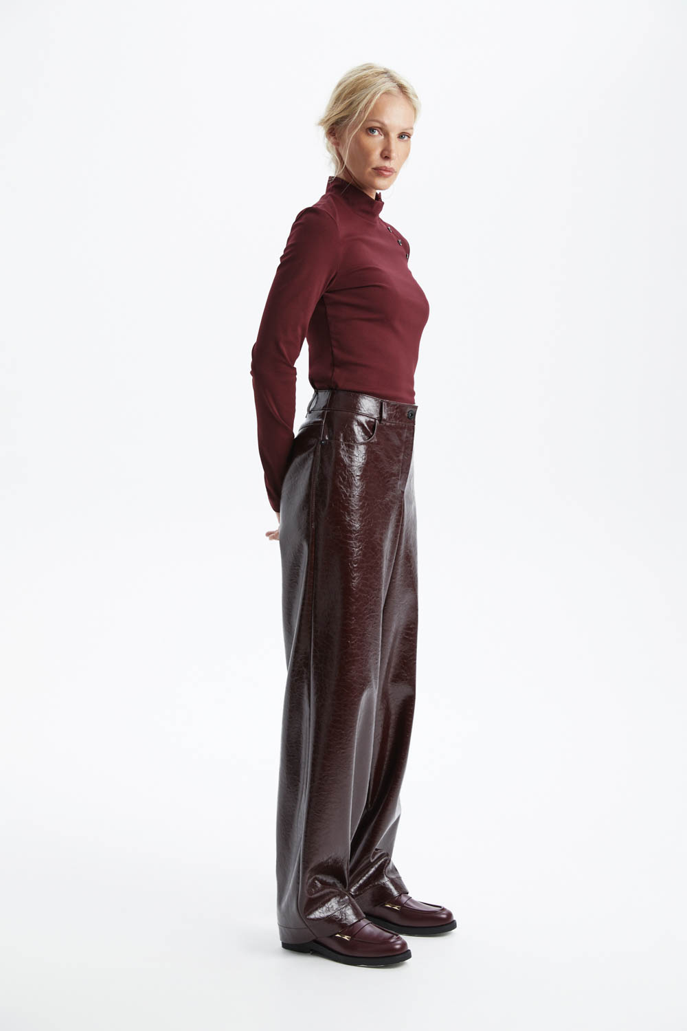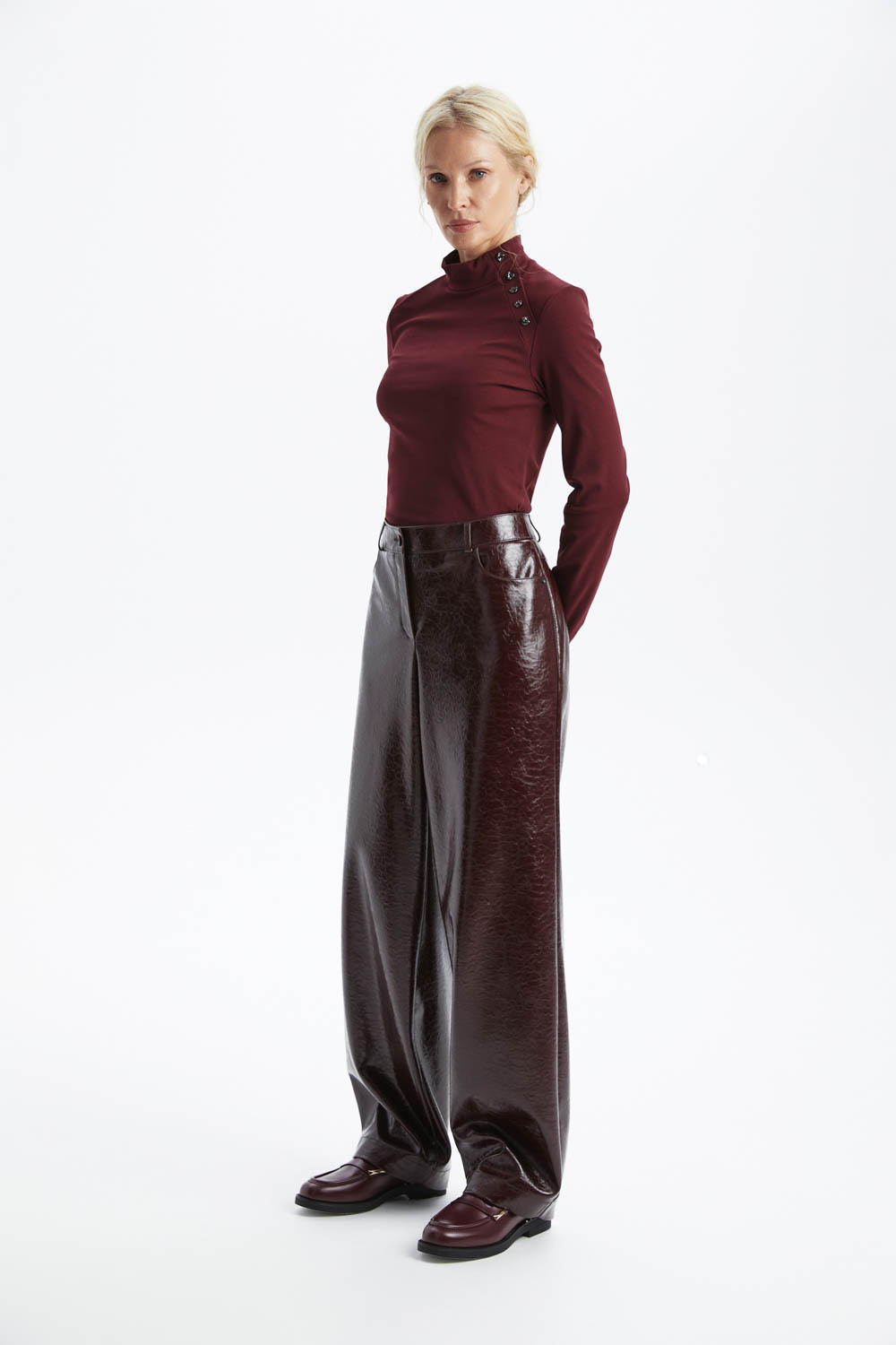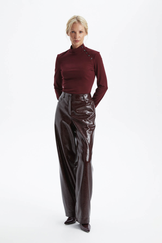 Широкие брюки из экокожи бордового цвета — стильный и модный элемент гардероба. Идеально подойдут для создания ярких и запоминающихся образов. Обеспечивают комфорт и подчёркивают индивидуальность.