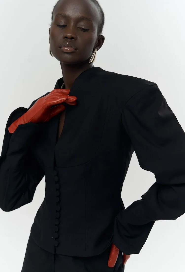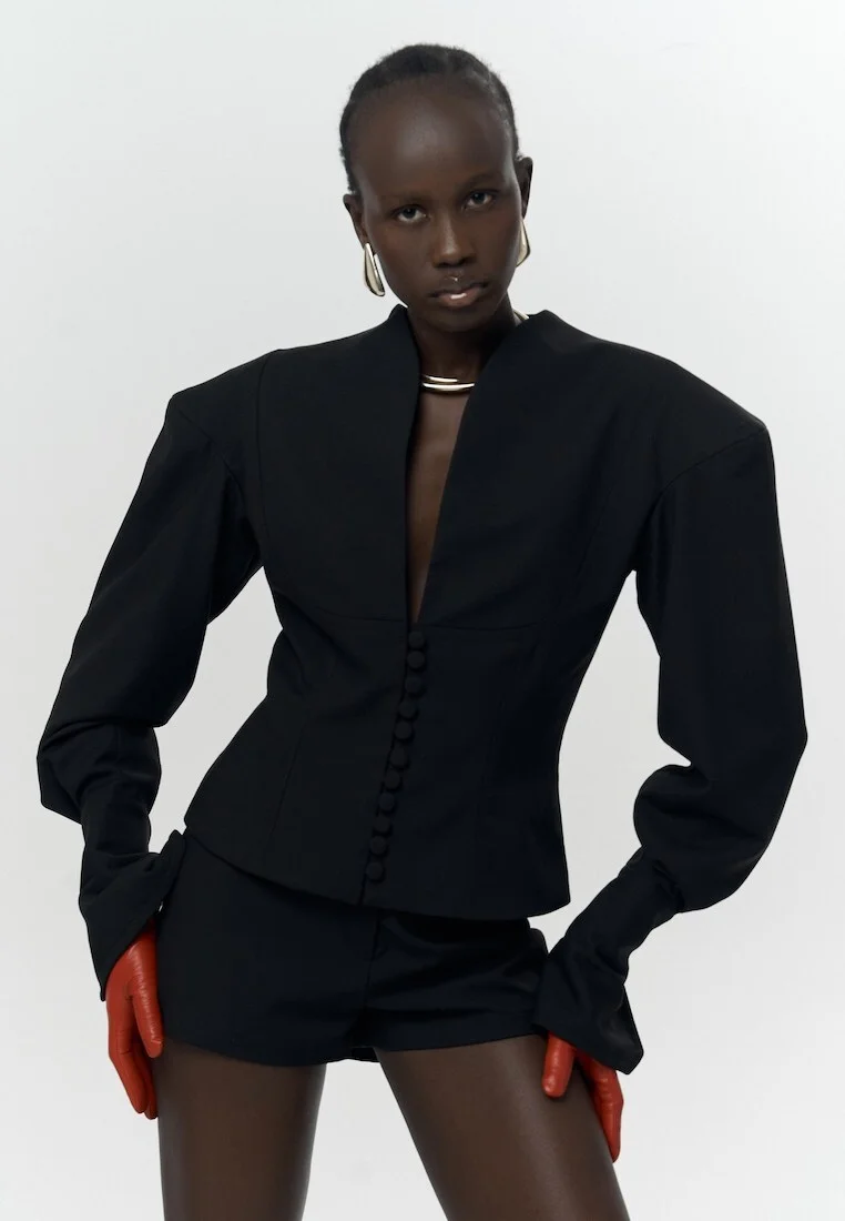 Этот стильный костюм с приталенным жакетом и объемными плечами представляет собой элегантное сочетание классического силуэта и современных тенденций.