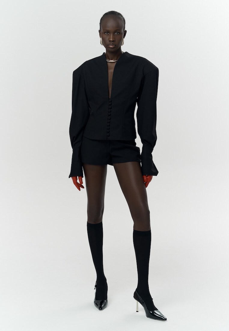Приталенный силуэт подчеркивает фигуру, акцентируя талию и создавая стройный образ. Объёмные плечи созданы за счет особой конструкции подкладки и воротника, что добавляет образу динамики и делает его более современным и женственным.