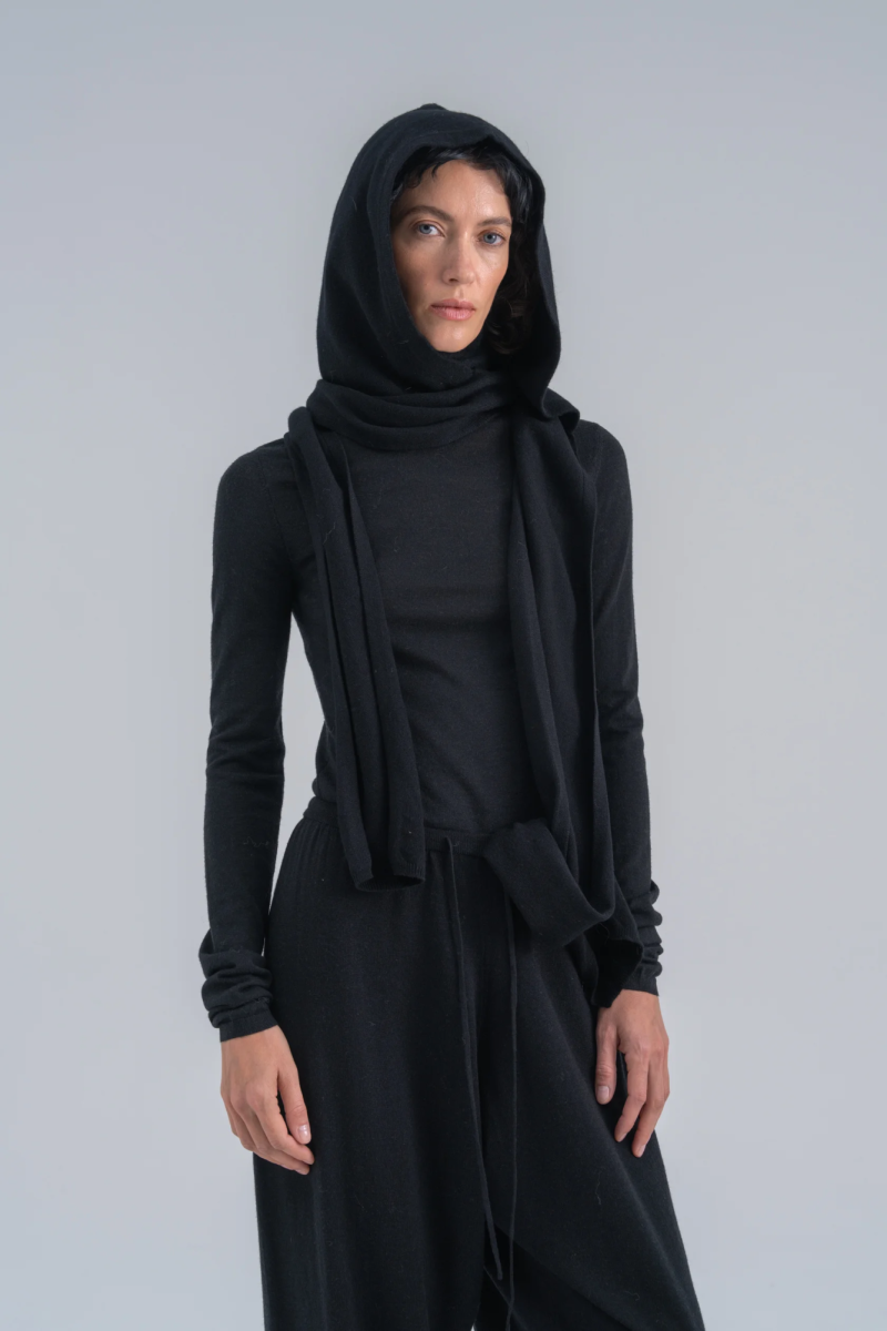 Тонкая вязка не утяжеляет изделие, а шарф-продолжение расширяет потенциал головного убора в его базовом прочтении, позволяя экспериментировать в ваших стилевых решениях. Помимо основного назначения капюшон можно накинуть на плечи и повязать как шарф.