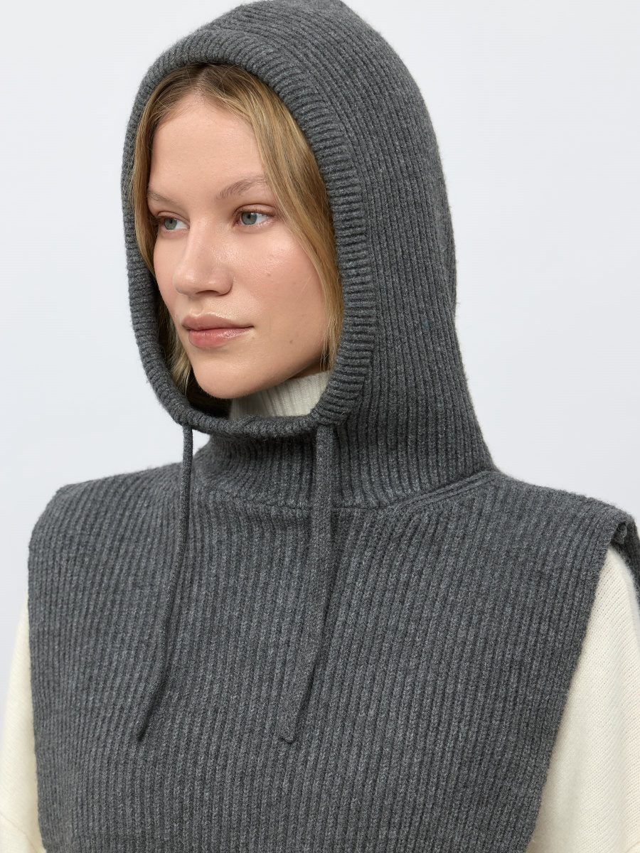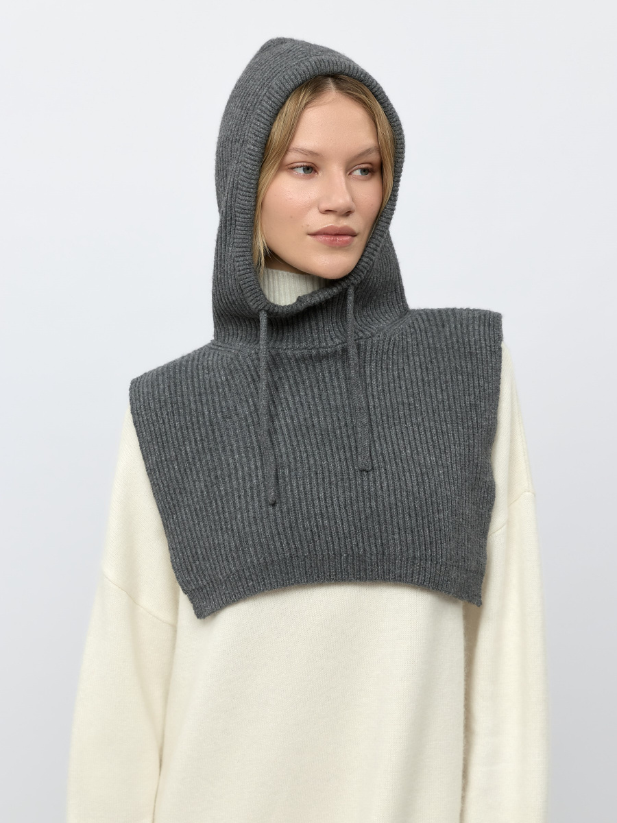 Теплый капор, функционально объединяющий шапку и шарф, незаменив для курток без капюшона. Надежно закрывает шею и плечи, объемный капюшон с регулируемыми завязками не допускает поддуваний. Свазан фактурным плетением из мягкой смесовой пряжи с добавлением шерсти.