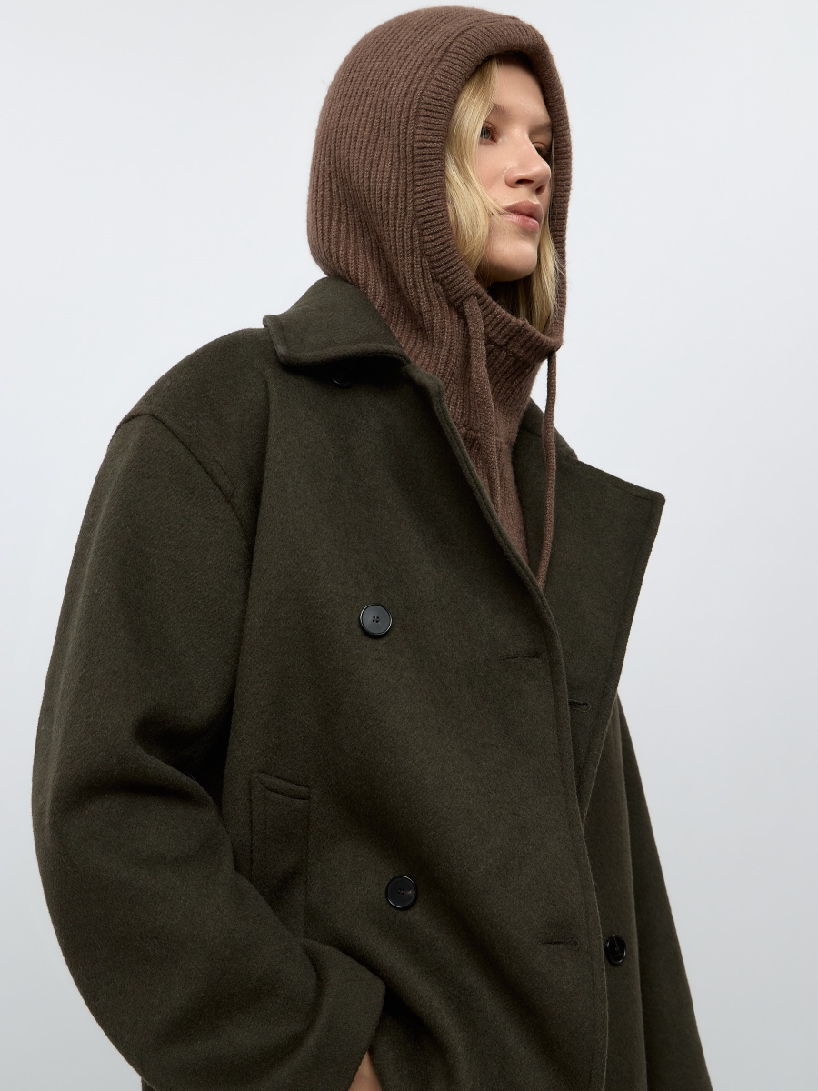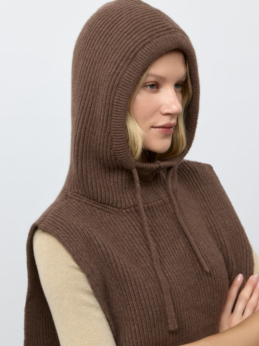 Теплый капор, функционально объединяющий шапку и шарф, незаменив для курток без капюшона. Надежно закрывает шею и плечи, объемный капюшон с регулируемыми завязками не допускает поддуваний. Свазан фактурным плетением из мягкой смесовой пряжи с добавлением шерсти.