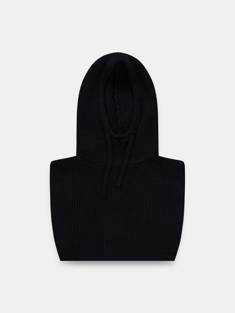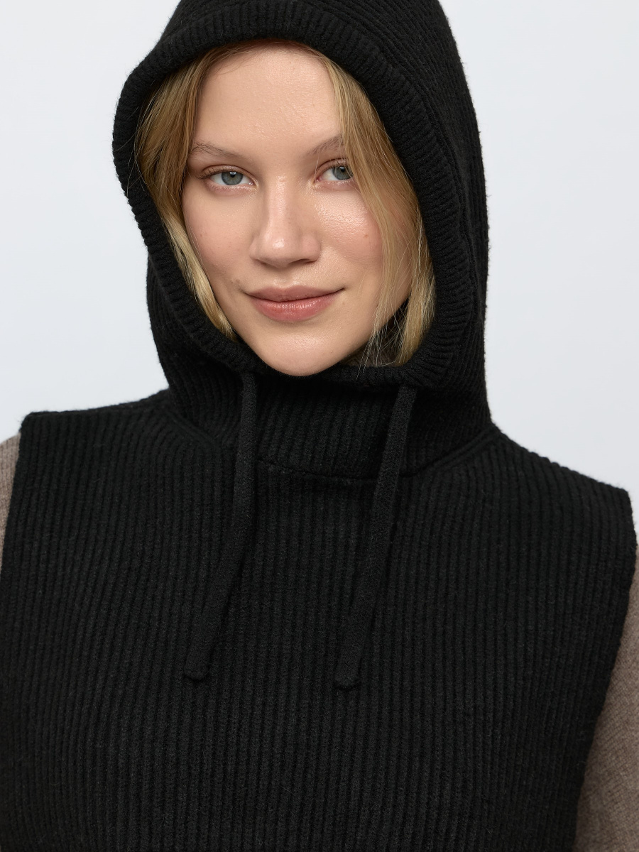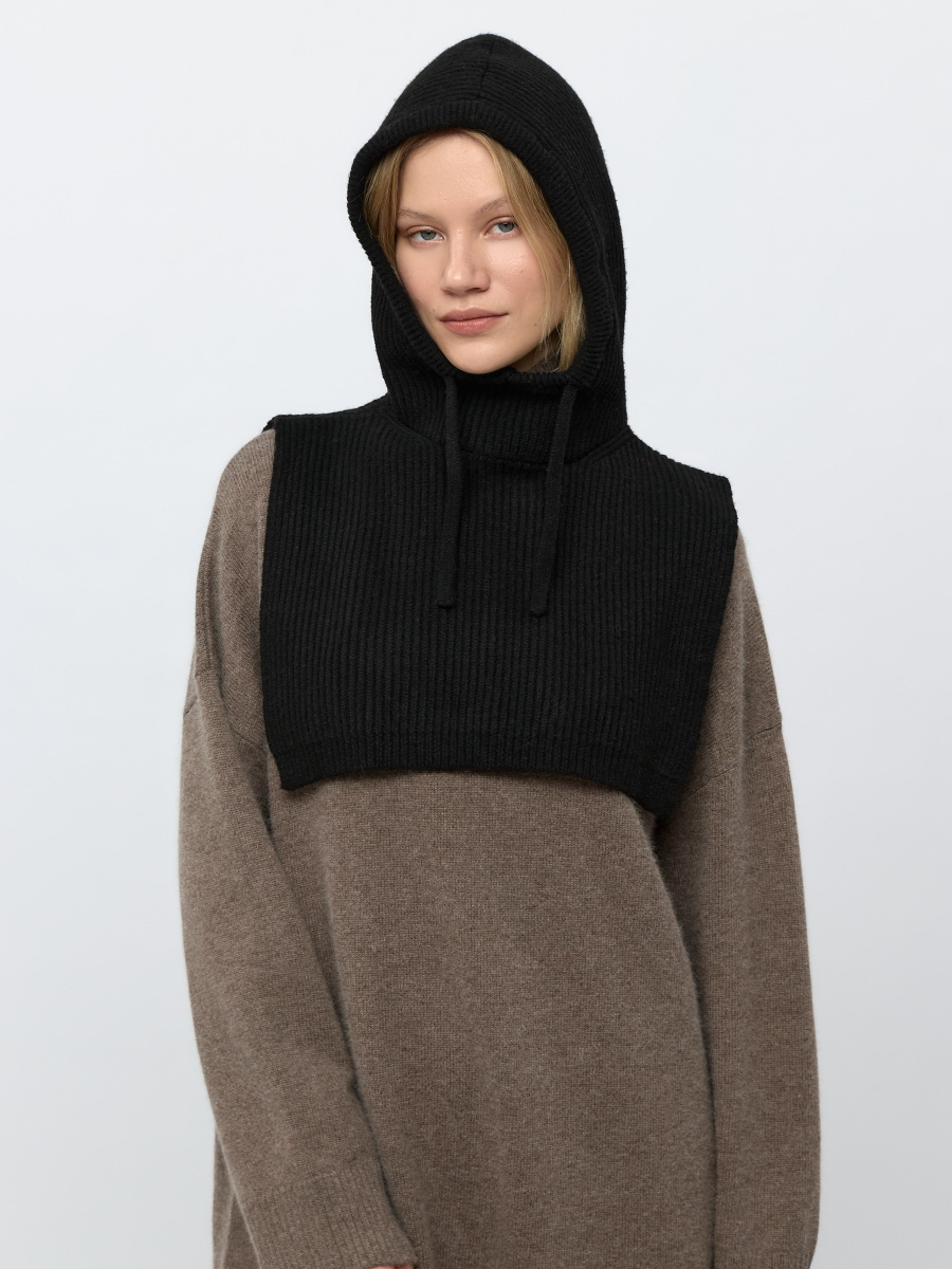Теплый капор, функционально объединяющий шапку и шарф, незаменив для курток без капюшона. Надежно закрывает шею и плечи, объемный капюшон с регулируемыми завязками не допускает поддуваний. Свазан фактурным плетением из мягкой смесовой пряжи с добавлением шерсти.