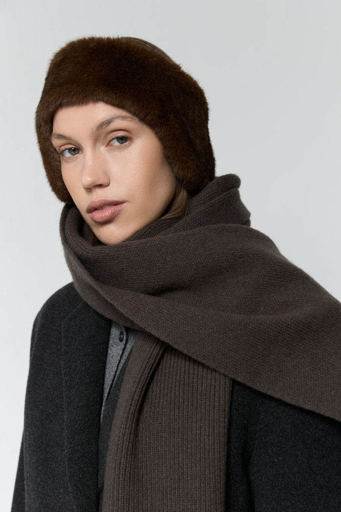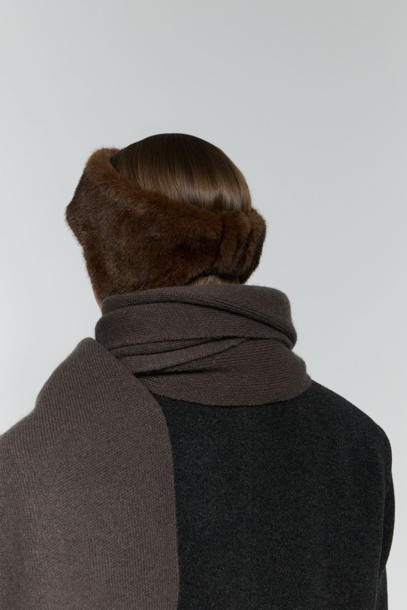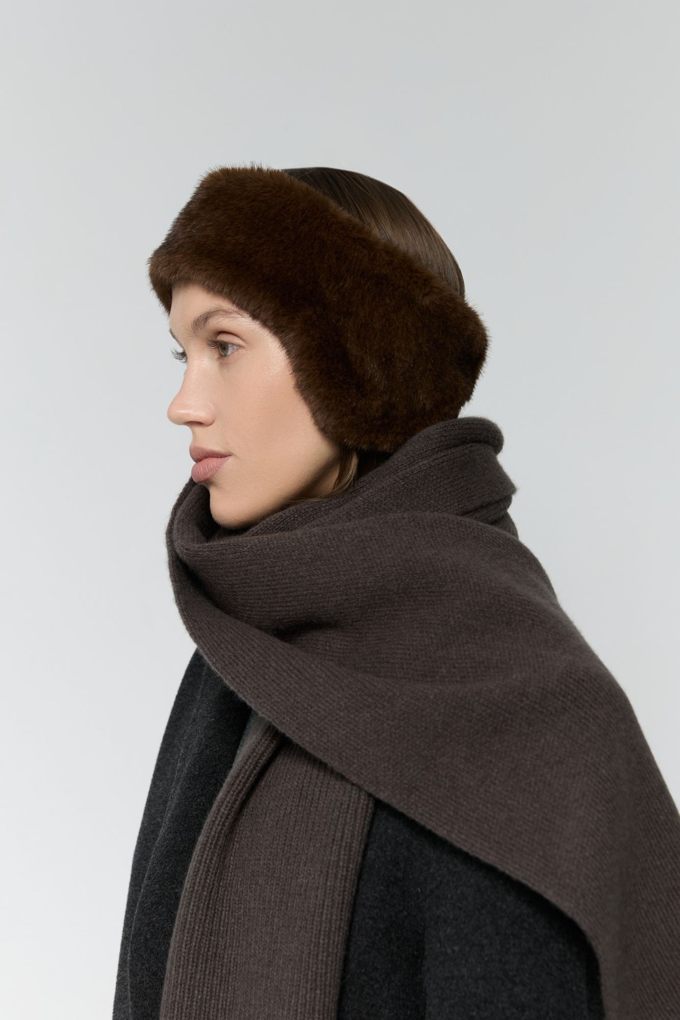 Меховая повязка сшита из искусственного меха. У него качественная выделка под норку, которая выглядит благородно и имитирует натуральный мех. При этом материал соответствует эко-принципам и поддерживат осознанное потребление.