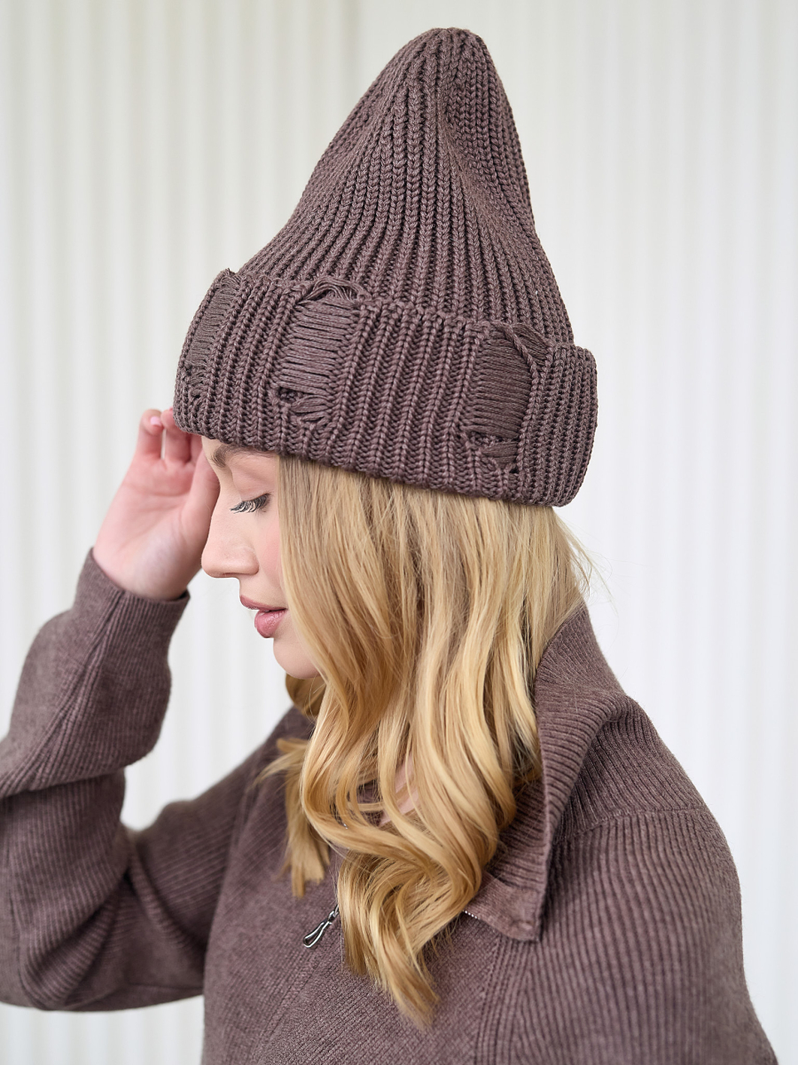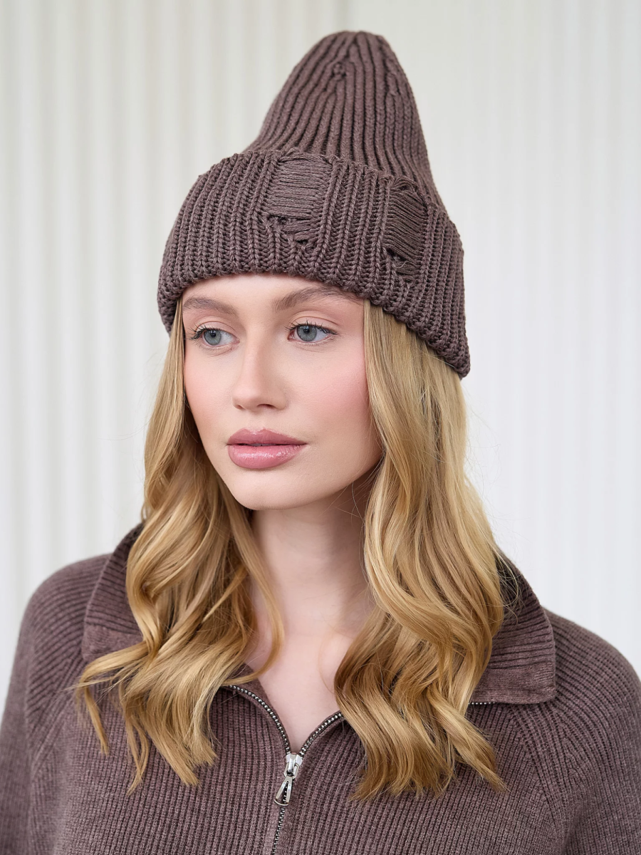 Не просто шапка — а стильное заявление. Крупная фактурная вязка и намеренно «рваный» край создают образ, сочетающий в себе уличную харизму и уютную небрежность. Идеально подходит тем, кто не боится выделяться — даже в холодную погоду.
