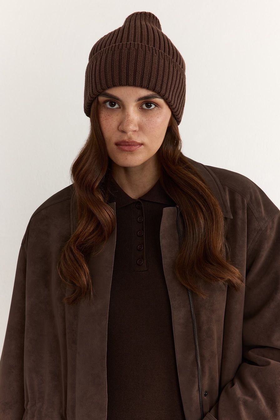Темно-коричневая шапка-бини с фактурой в крупный рубчик выполнена из 100% хлопка и дополнена широким отворотом.