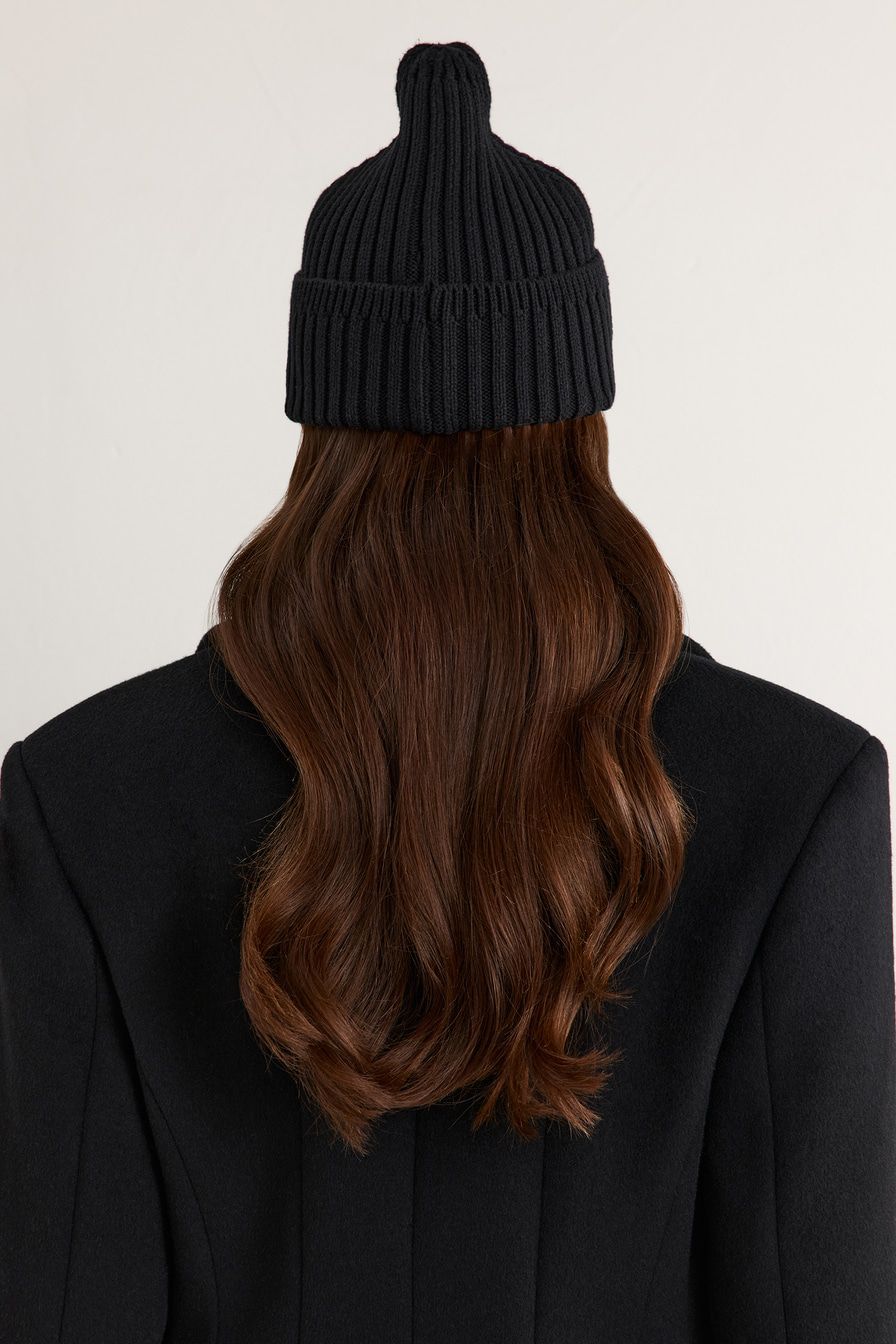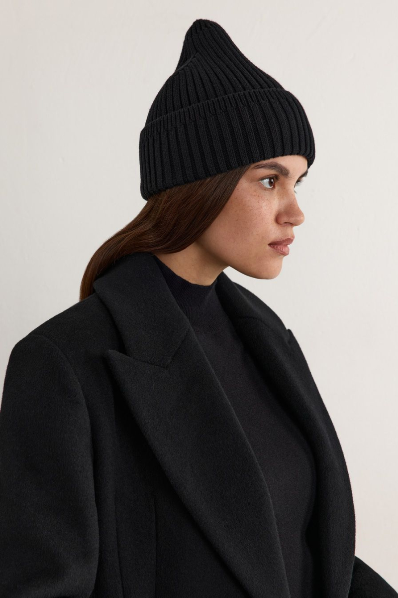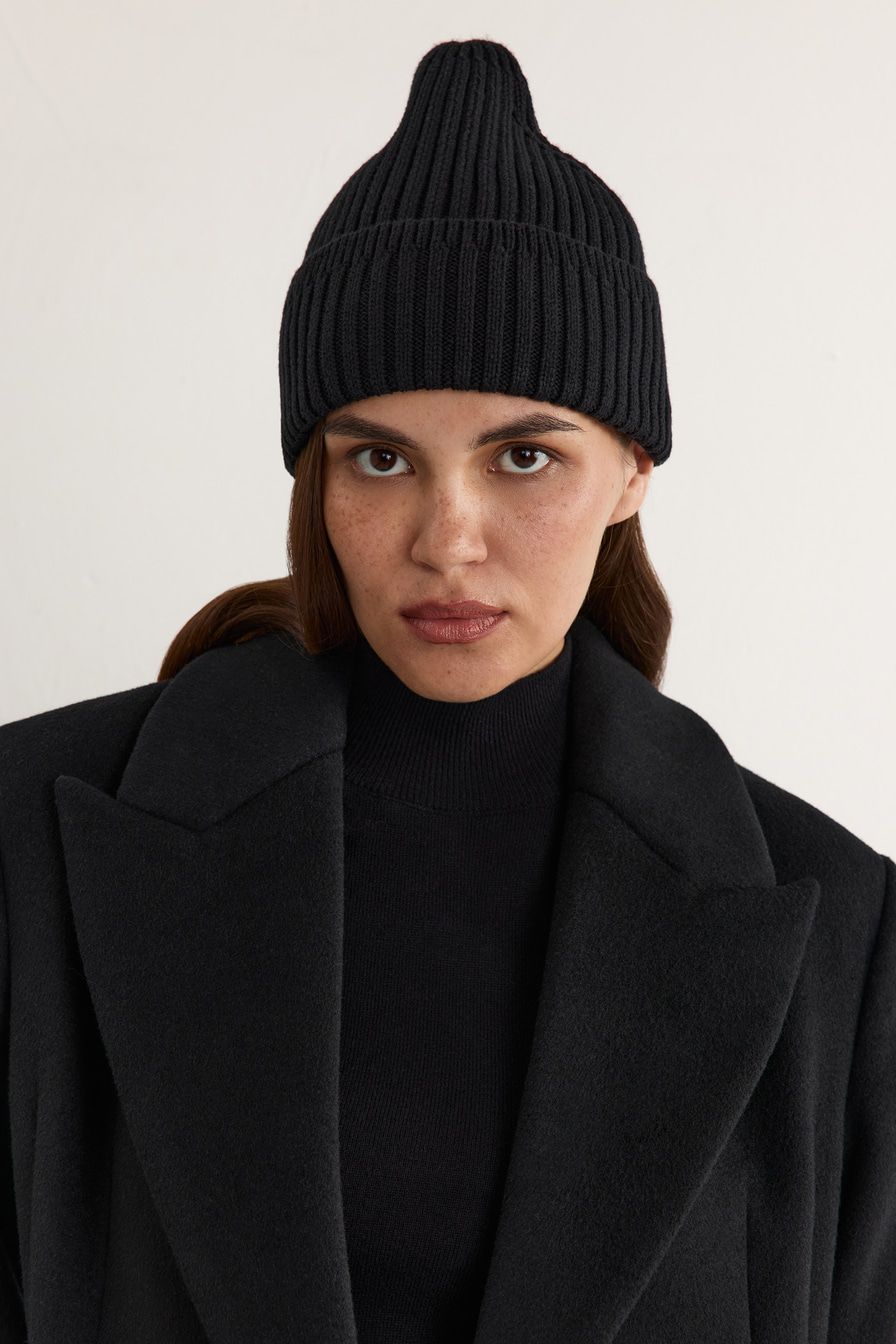 Черная шапка-бини с фактурой в крупный рубчик выполнена из 100% хлопка и дополнена широким отворотом.