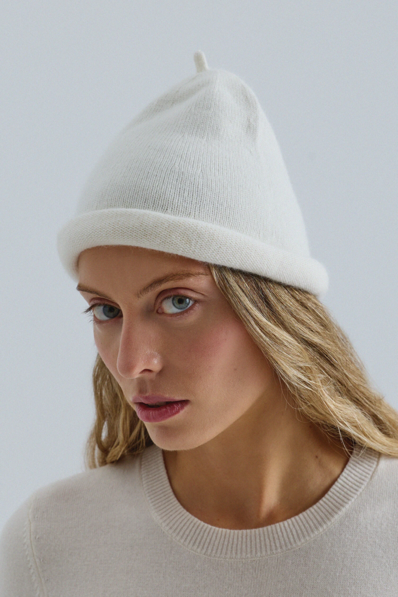 Шапка из тонкой шерсти енота с умеренным отворотом-закруткой. Модель легко регулируется по длине и посадке, а за счёт мягкой, эластичной пряжи практически не ощущается на голове. На кончике — аккуратный узел.