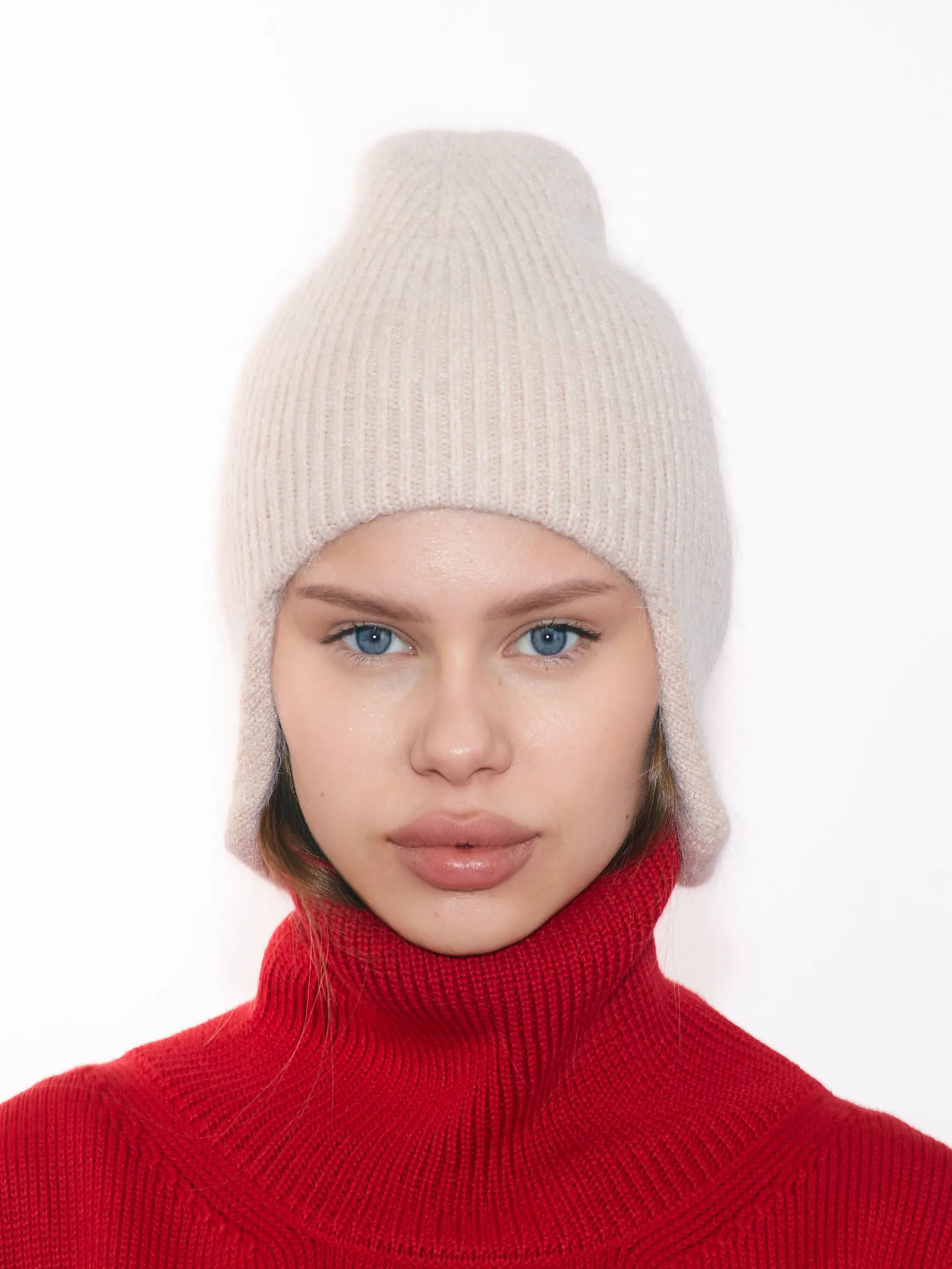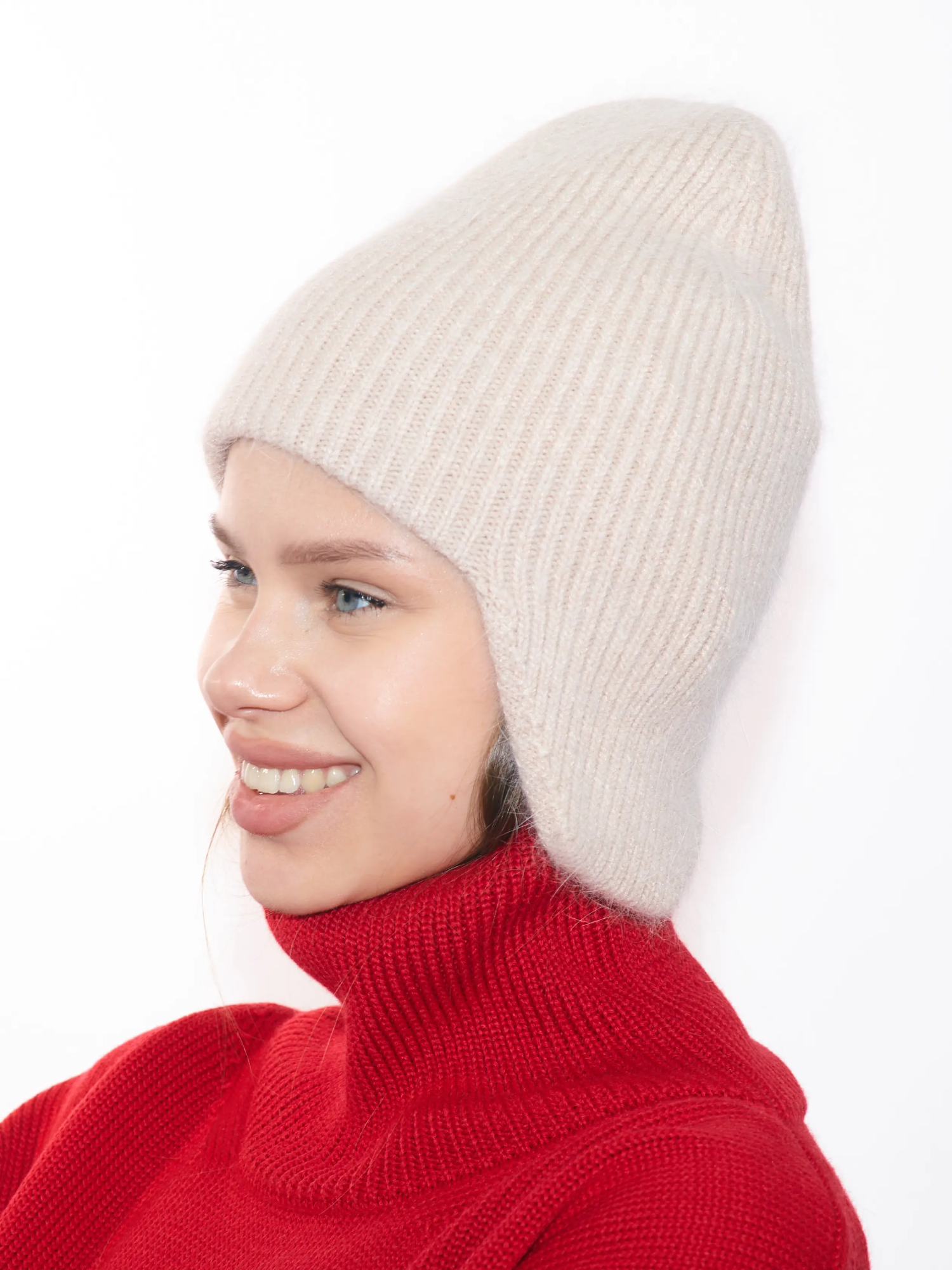 Вязаная шапка с удлинёнными ушками — современная интерпретация классического зимнего аксессуара. Мягкая плотная вязка и лаконичный силуэт обеспечивают тепло и комфорт, а необычная форма придаёт образу художественную выразительность. Идеально сочетается с пальто, свитерами и джемперами — стильно, практично и без лишних деталей.