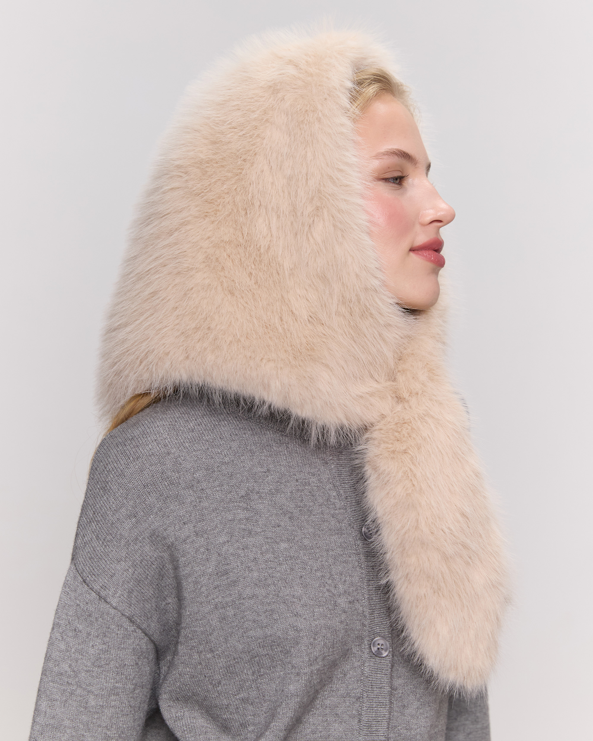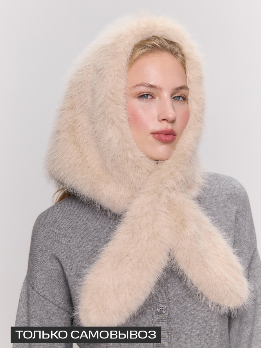 Необычный головной убор — пушистая косынка из экомеха. Она не только дополнит образ, но и согреет в холода. Носить можно в двух вариантах: просто завязать как платок или продеть один конец косынки в прорезь другого.