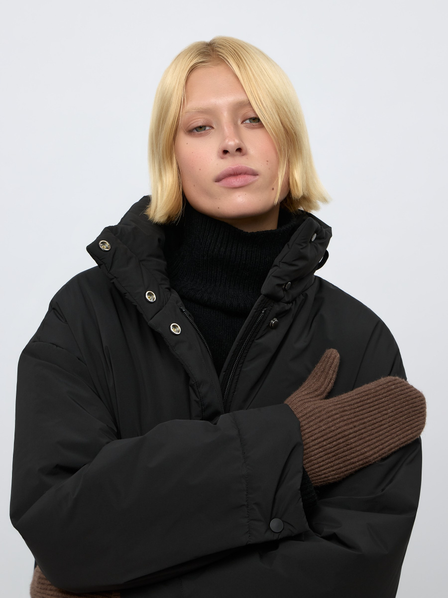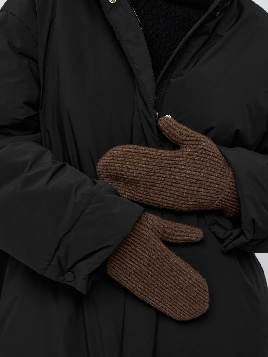 Минималистичные варежки из мягкой и прочной пряжи с добавлением шерсти. Выполнены гладким однослойным плетением в среднем объеме и анатомическом крое для свободы движений. Двойные удлиненные манжеты связаны резинкой и закрывают запястья, что удобно, если у куртки укорочены рукава.