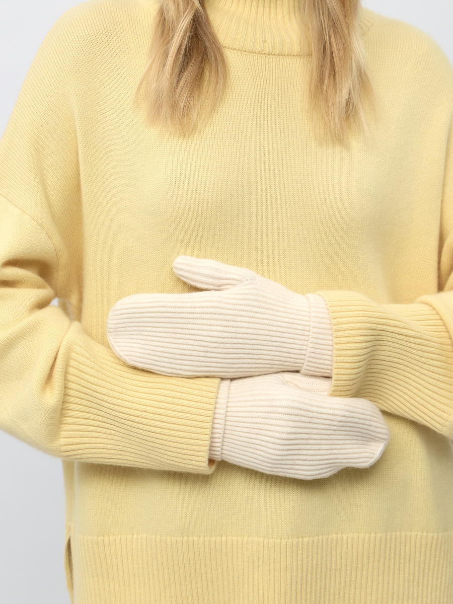 Минималистичные варежки из мягкой и прочной пряжи с добавлением шерсти. Выполнены гладким однослойным плетением в среднем объеме и анатомическом крое для свободы движений. Двойные удлиненные манжеты связаны резинкой и закрывают запястья, что удобно, если у куртки укорочены рукава.
