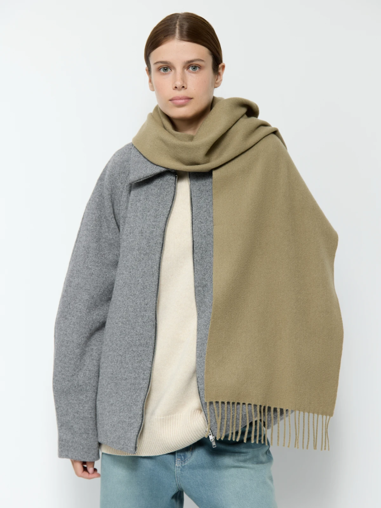 Тканый шарф связан из кашемира с мериносом; теплый, мягкий и приятный к коже. Обрамлен бахромой.
