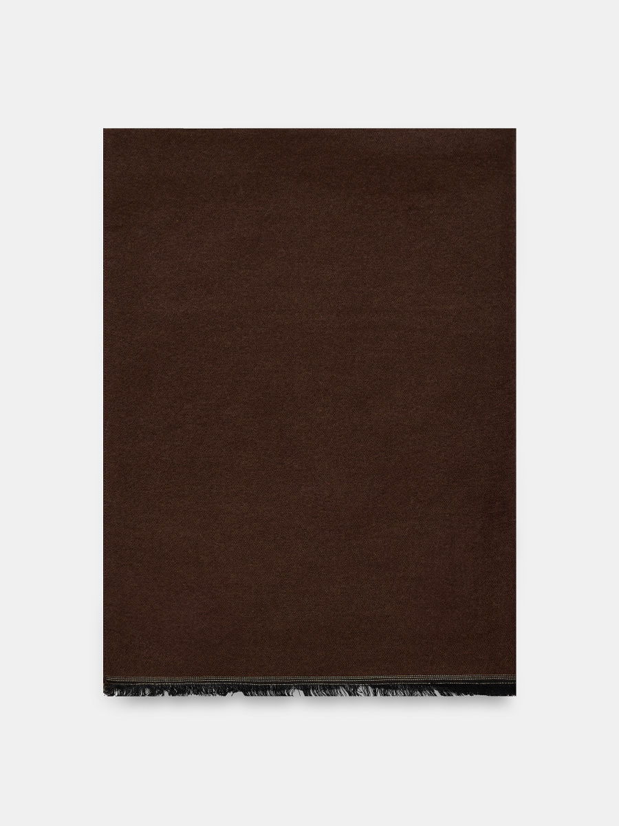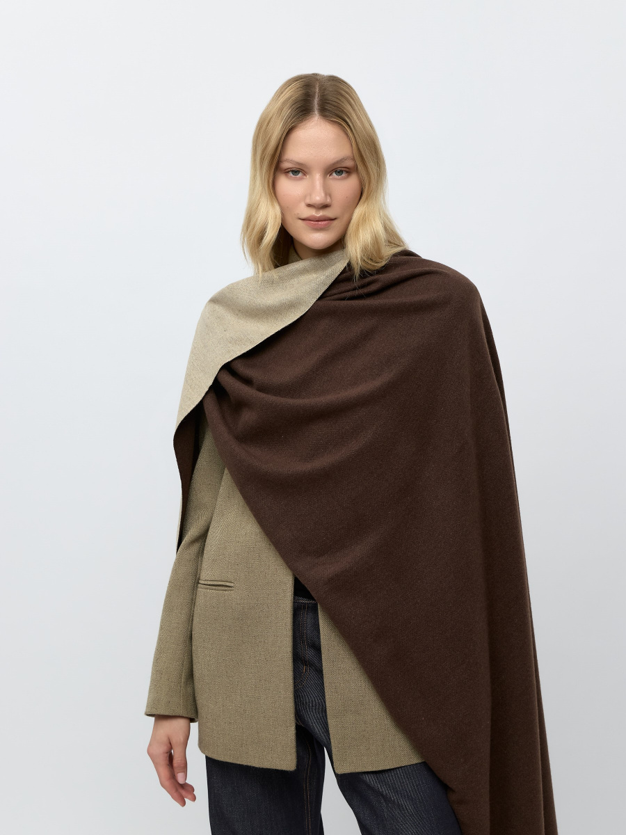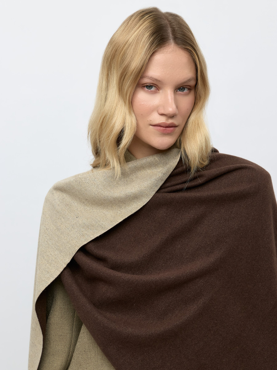 Двусторонний палантин с шелковистой бахромой защищает от ветра и драпируется оформленными складками. Выполнен в двух контрастных универсальных оттенках для разнообразной стилизации. Мягкое смесовое полотно на основе вискозы с добавлением шерсти — плотное, прочное и легкое.