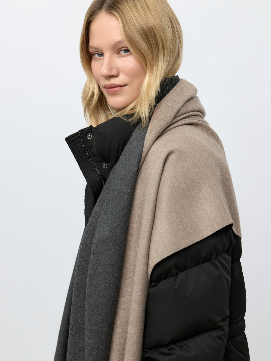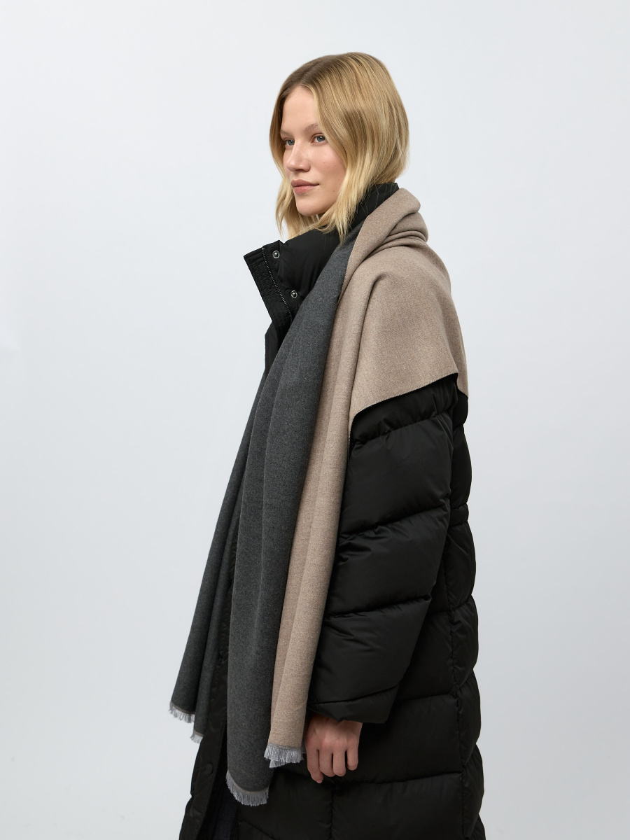 Двусторонний палантин с шелковистой бахромой защищает от ветра и драпируется оформленными складками. Выполнен в двух контрастных универсальных оттенках для разнообразной стилизации. Мягкое смесовое полотно на основе вискозы с добавлением шерсти — плотное, прочное и легкое.