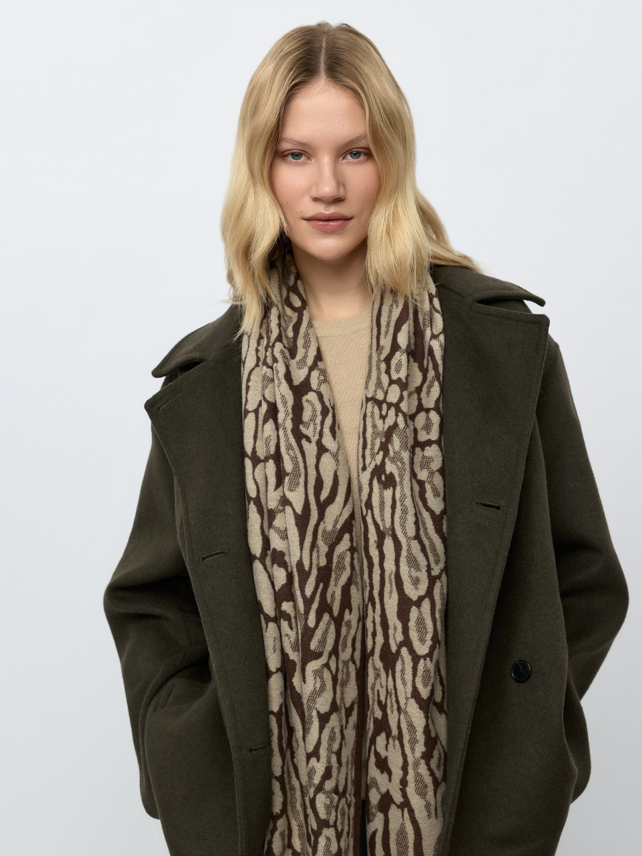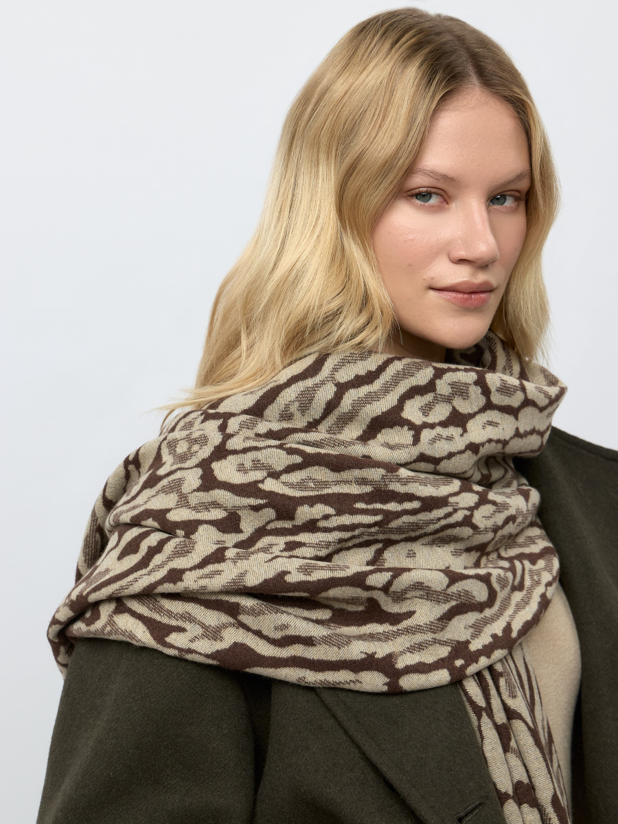 Акцентный двухсторонний палантин с крупным анималистическим принтом и шелковистой бахромой. Красиво стилизуется оформленными складками на любую сторону. Легкое согревающее полотно с вискозой и шерстью укрывает от холодного ветра. Размер изделия: 70x190 см.